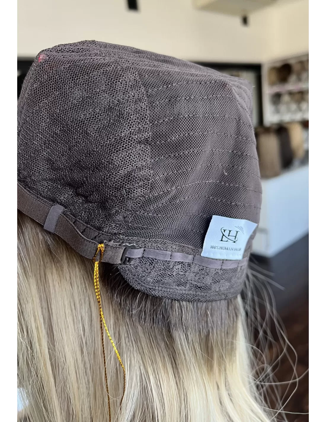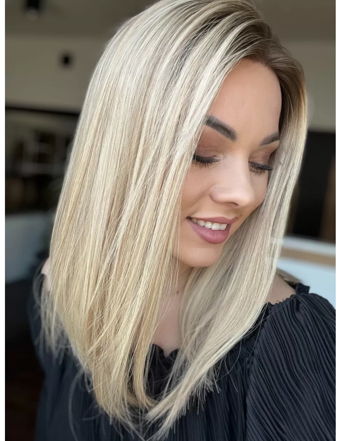 Ta wyjątkowa peruka z włosów naturalnych zachwyca perfekcyjnie dobranym stonowanym chłodnym odcieniu blondu. Delikatny odrost w odcieniu jasnego chłodnego brązu subtelnie podkreśla naturalność koloru, dodając mu autentycznego charakteru.