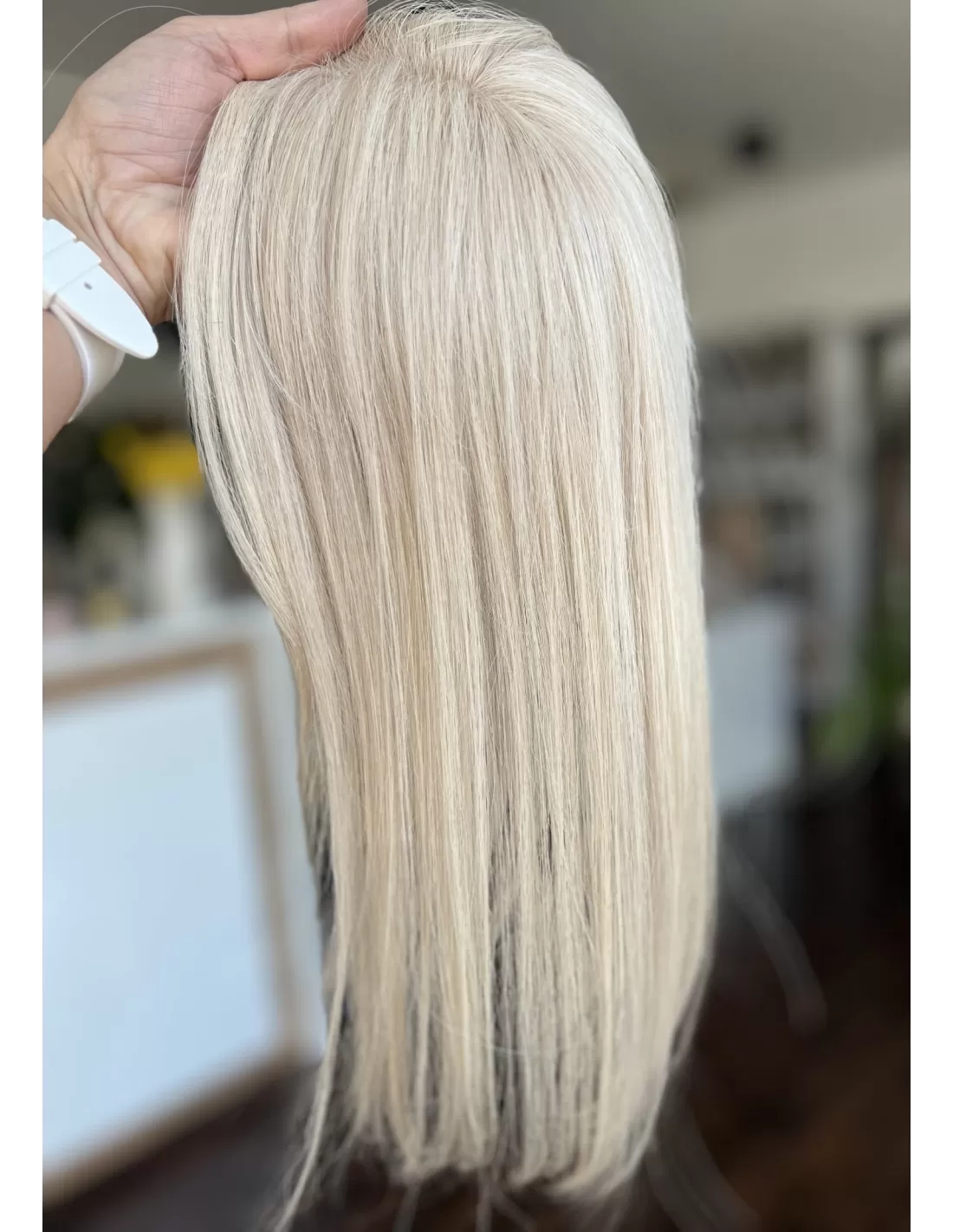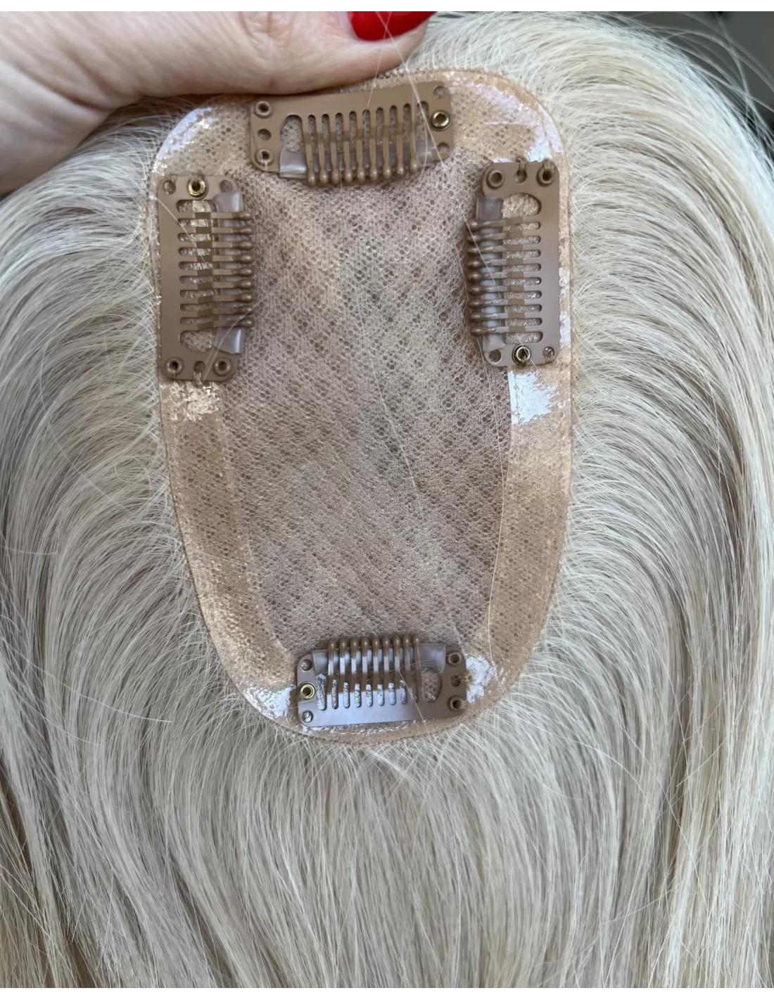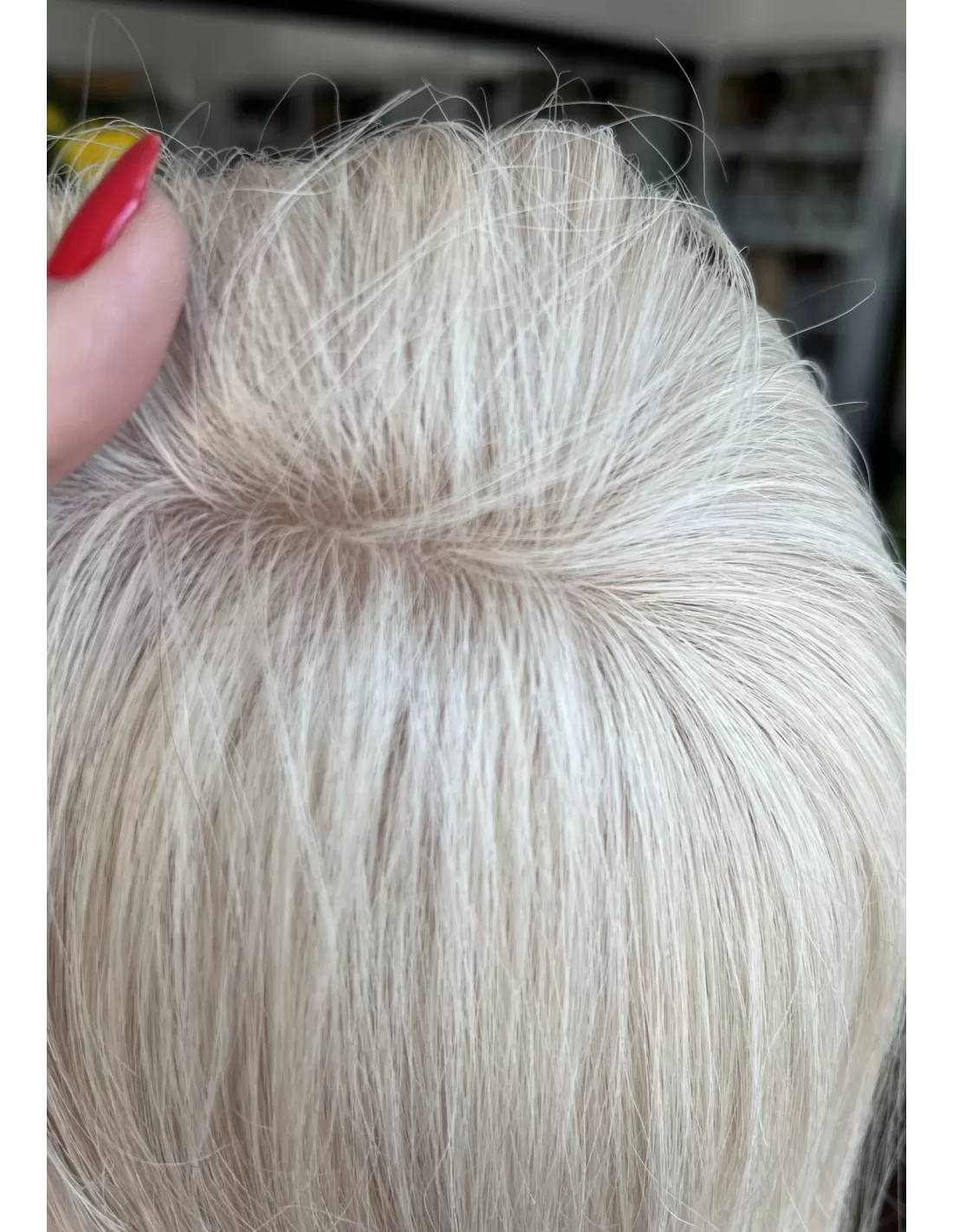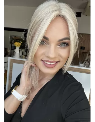 Przedstawiamy mini topper, idealne rozwiązanie dla osób pragnących subtelnie zagęścić przedziałek. Wykonany z naturalnych włosów w odcieniu platynowego blondu.