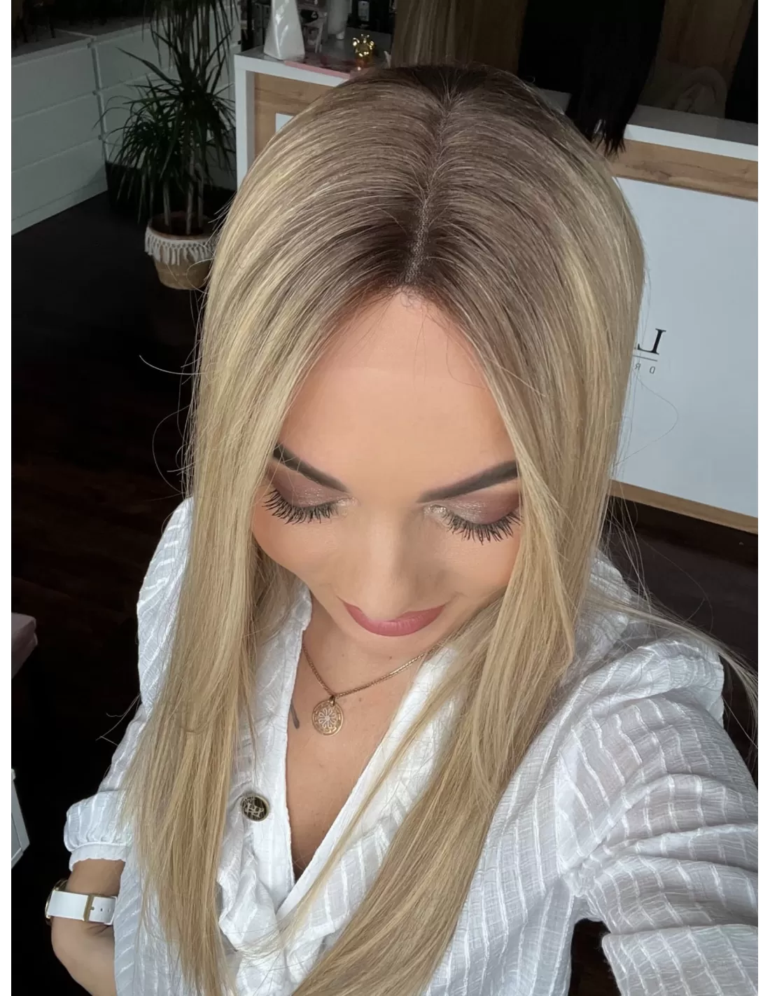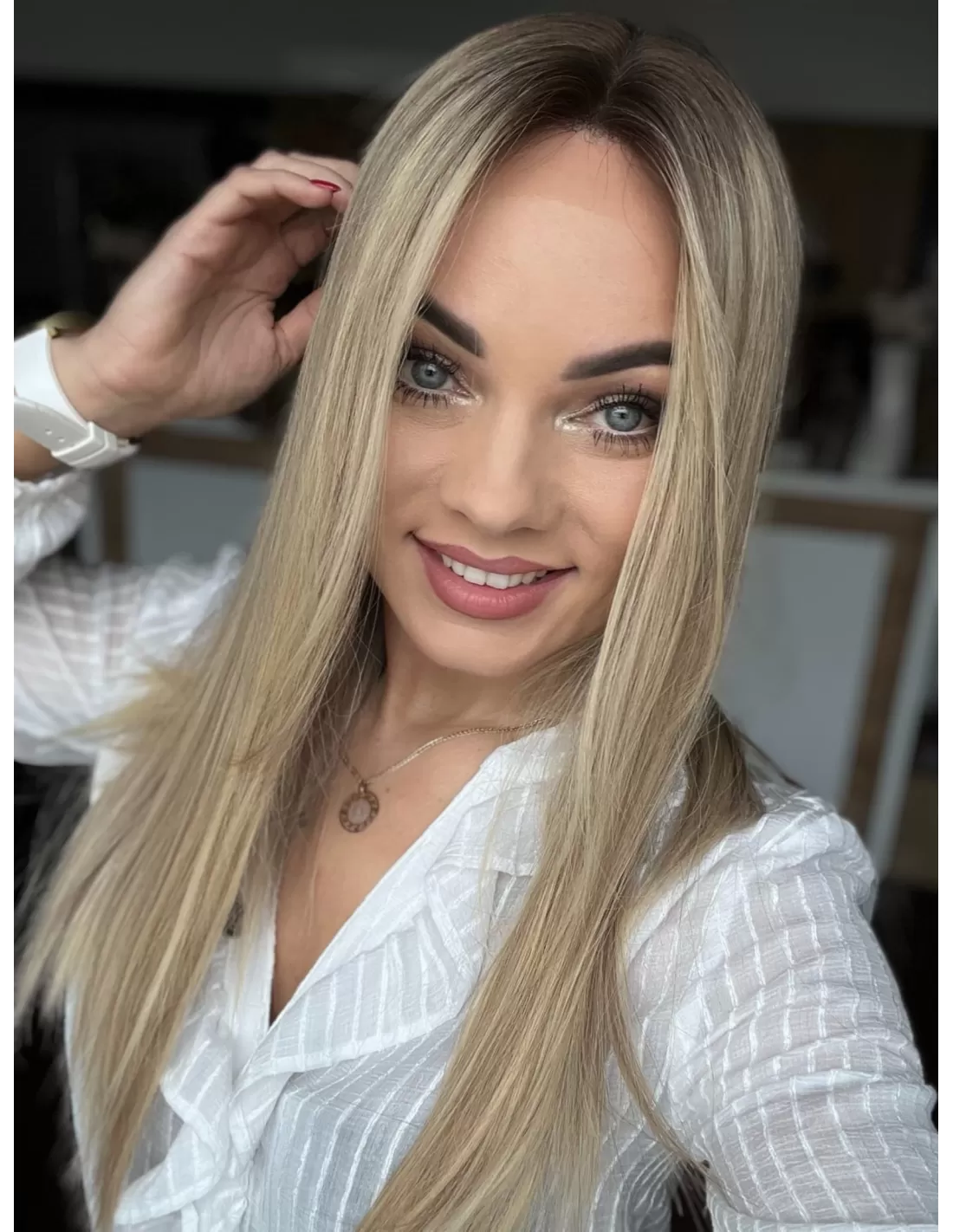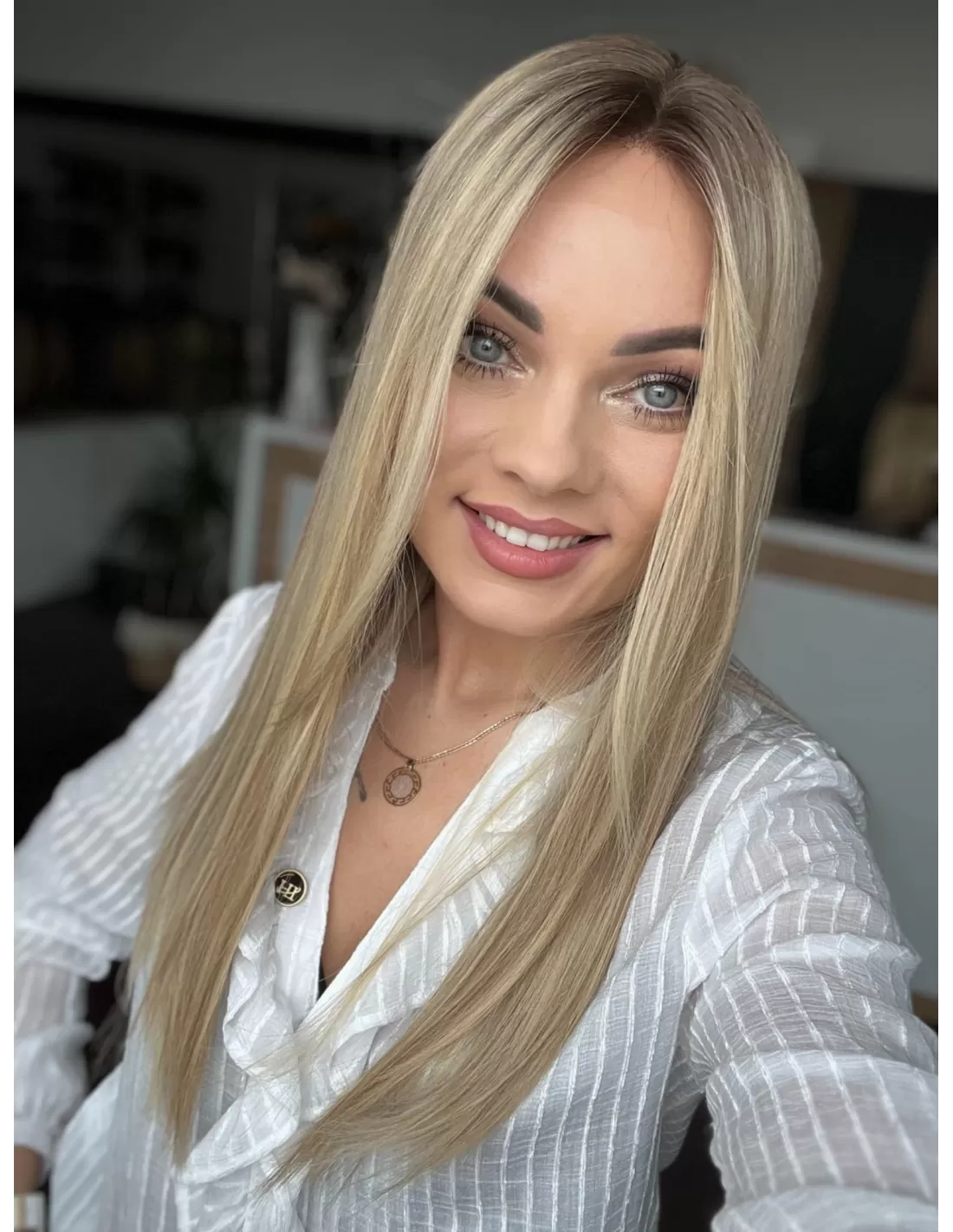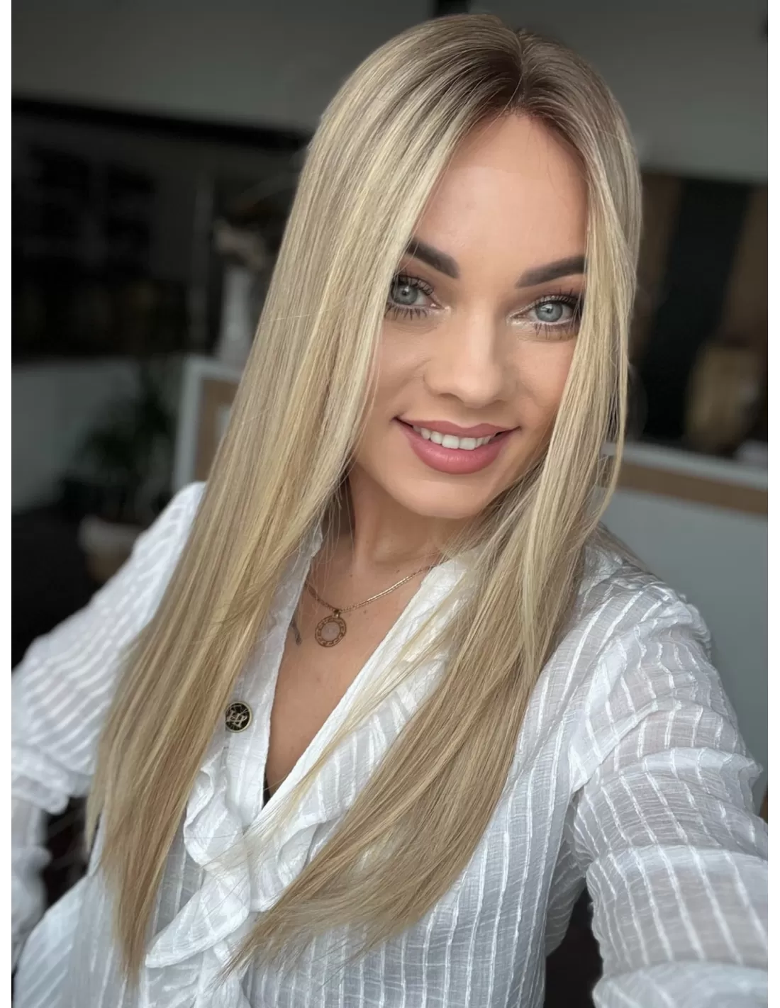 Ta wyjątkowa peruka z włosów naturalnych zachwyca perfekcyjnie dobranym stonowanym chłodnym odcieniu blondu. Delikatny odrost w odcieniu jasnego chłodnego brązu subtelnie podkreśla naturalność koloru, dodając mu autentycznego charakteru.