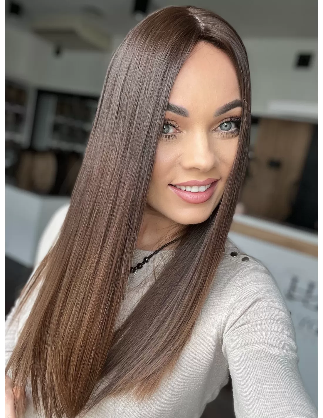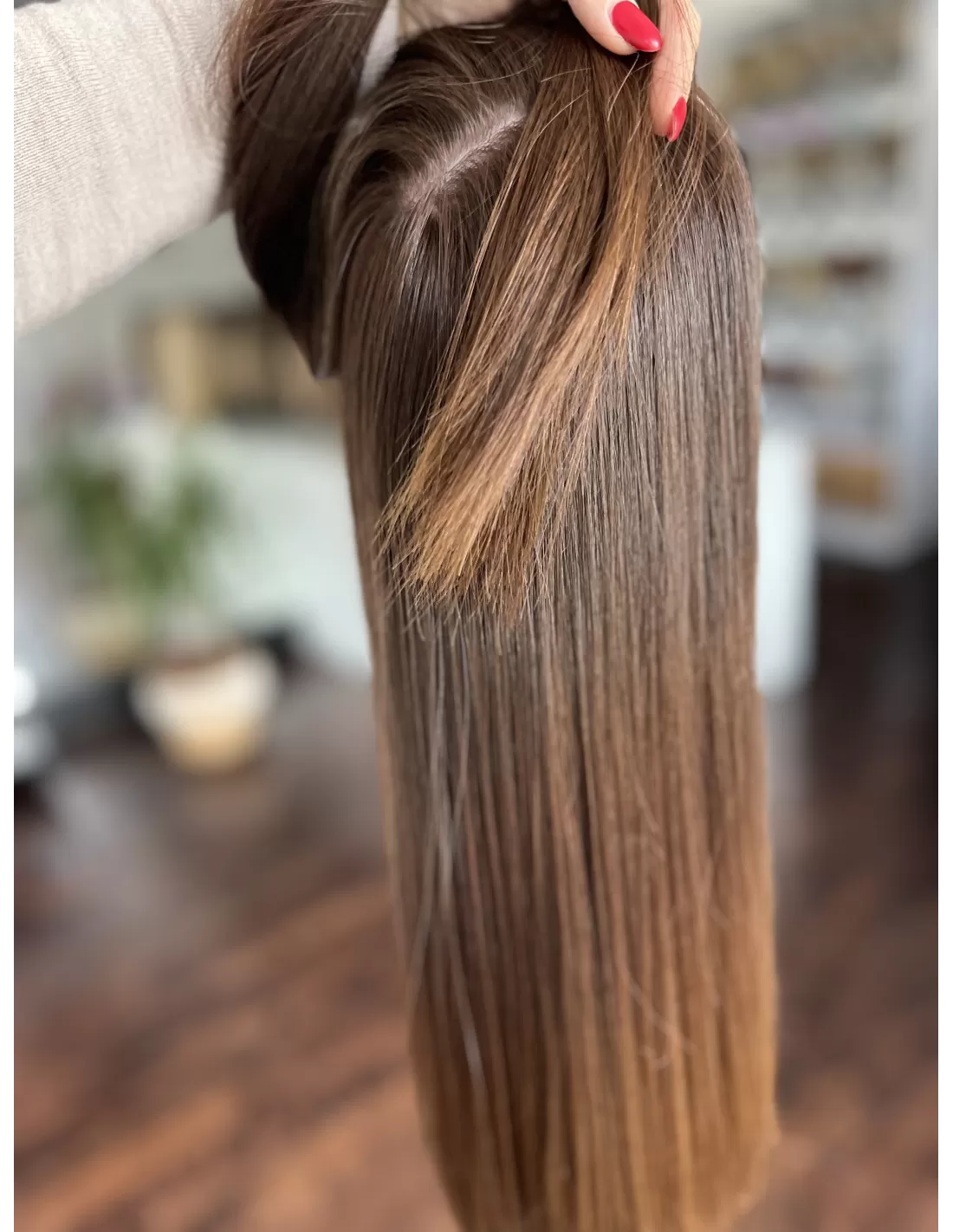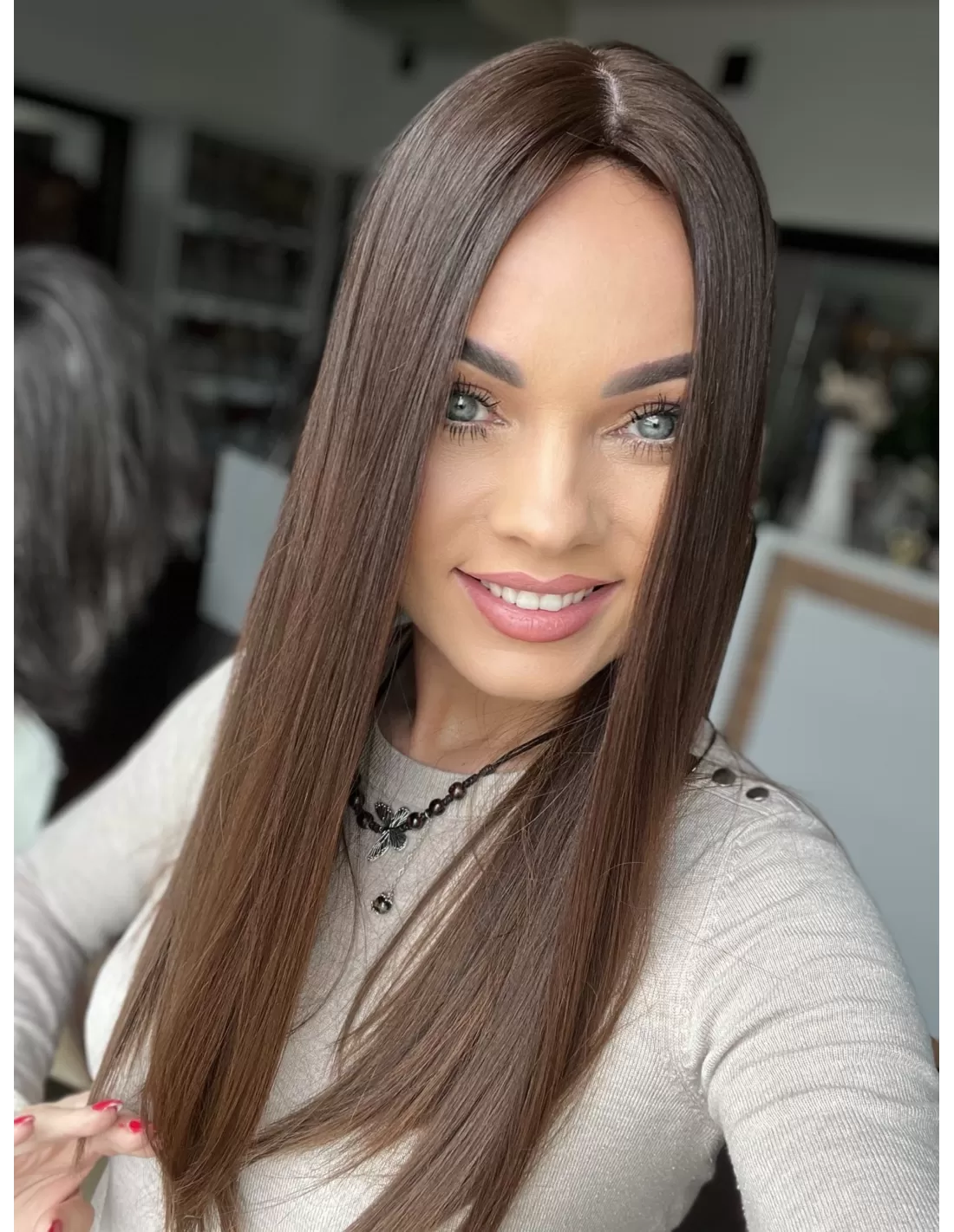 Kolor toppera to przepiękny odcień ombre. Bardzo delikatne i subtelne przejście z średniego brązu na podstawie toppera na poziomie #4 do pięknego kasztanowego brązu w ciepłej tonacji po długości