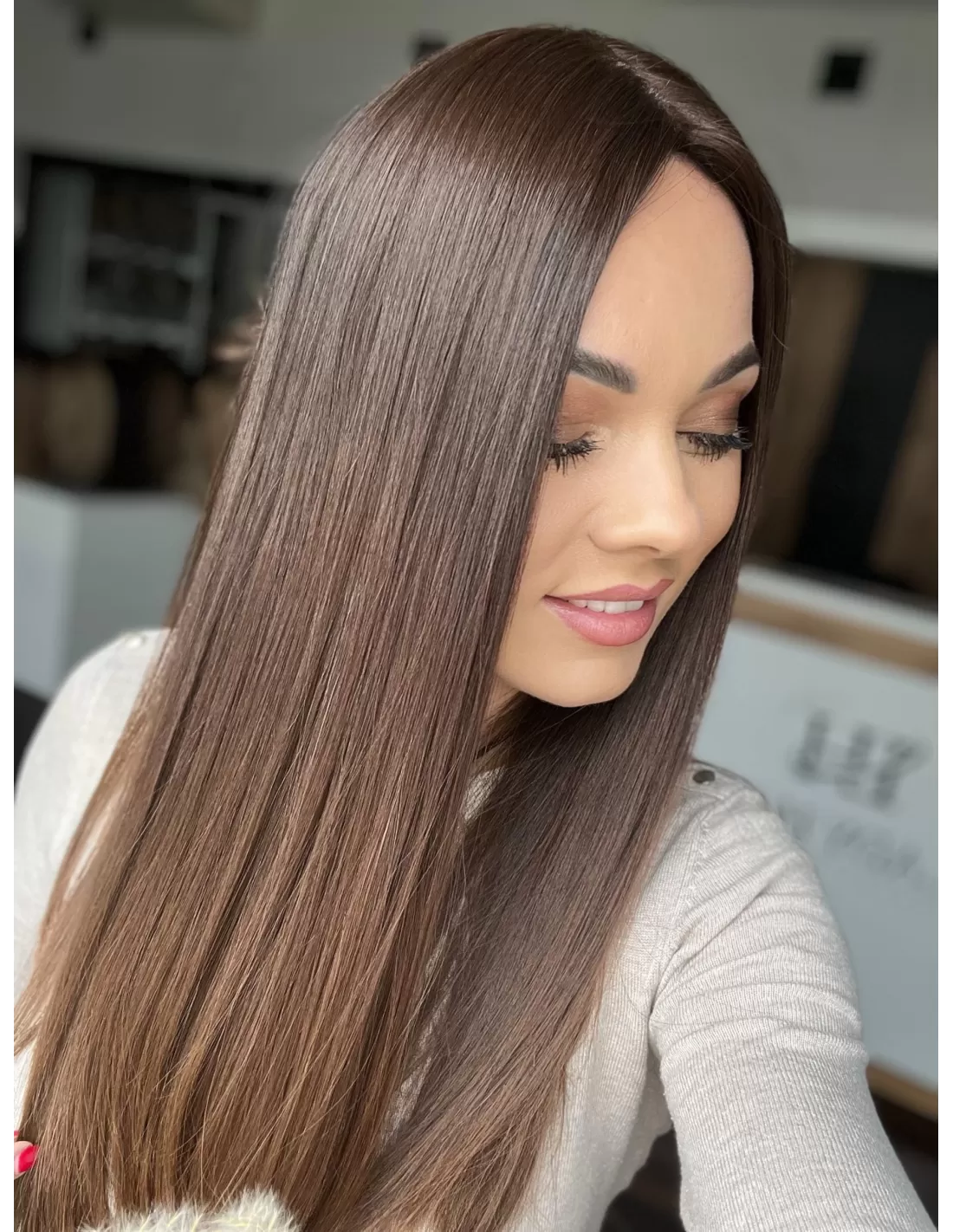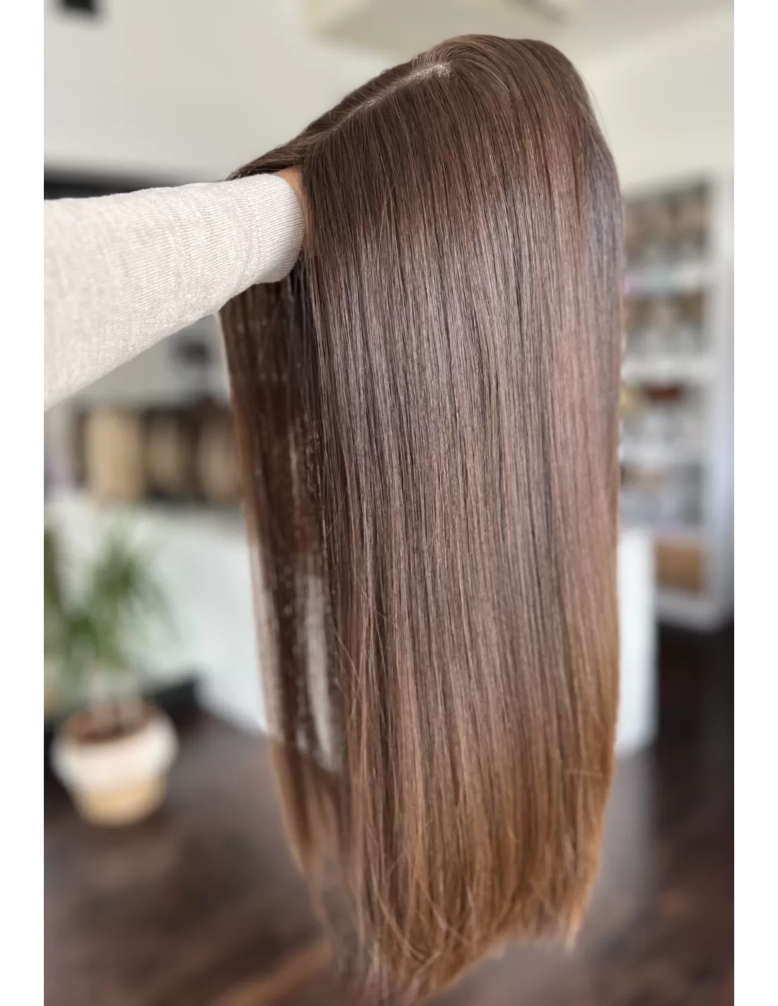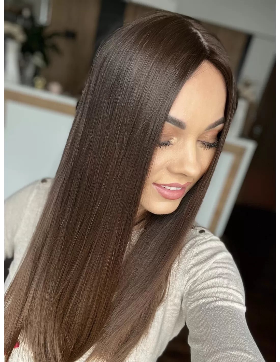 Kolor toppera to przepiękny odcień ombre. Bardzo delikatne i subtelne przejście z średniego brązu na podstawie toppera na poziomie #4 do pięknego kasztanowego brązu w ciepłej tonacji po długości