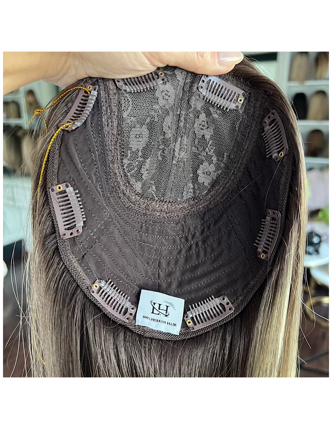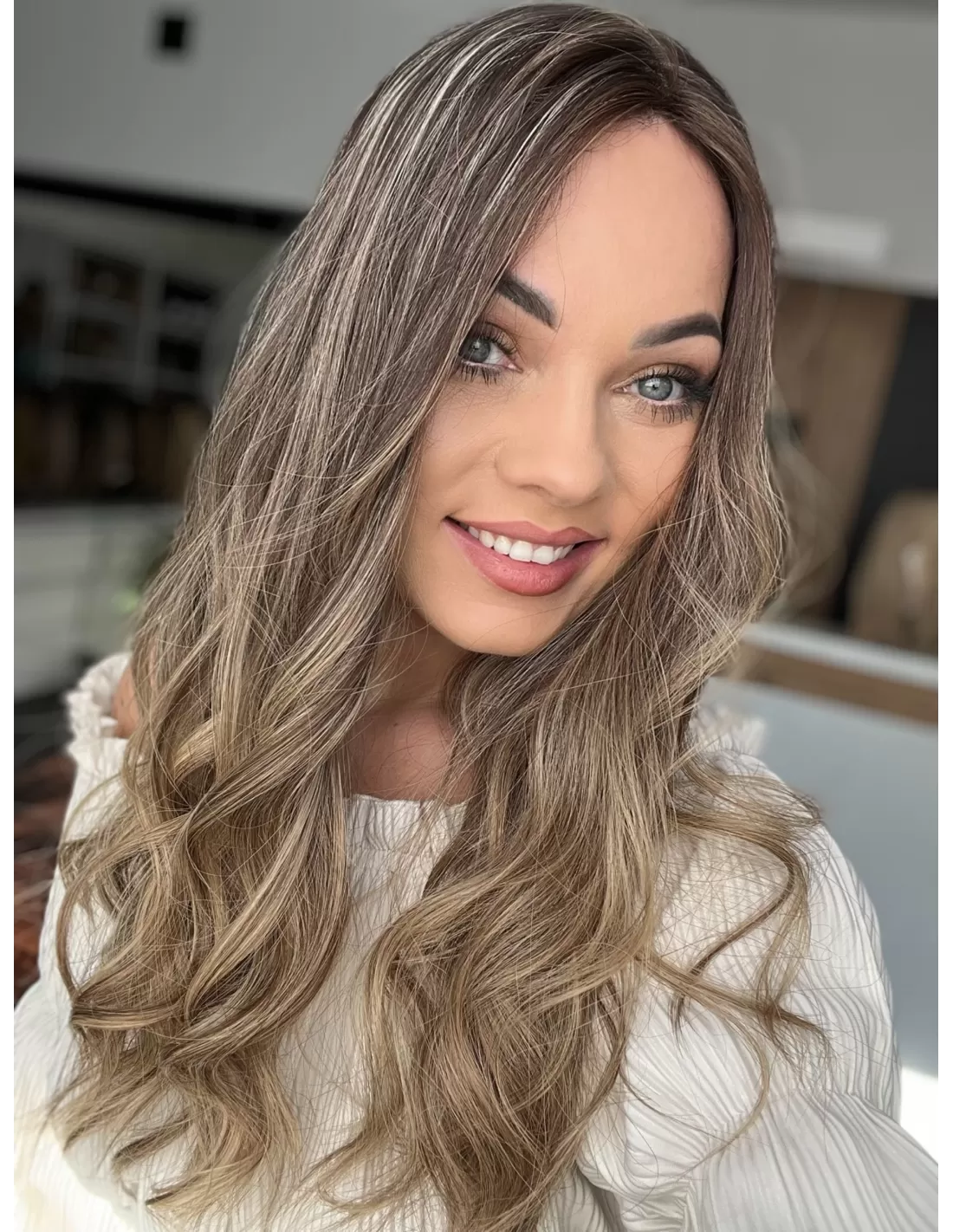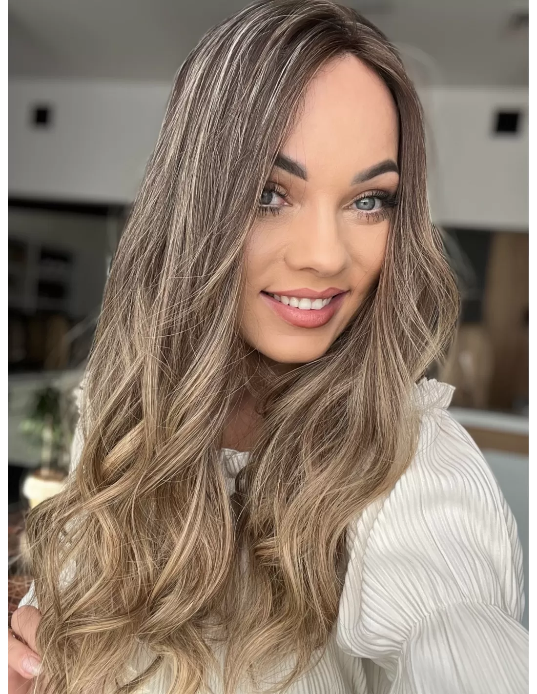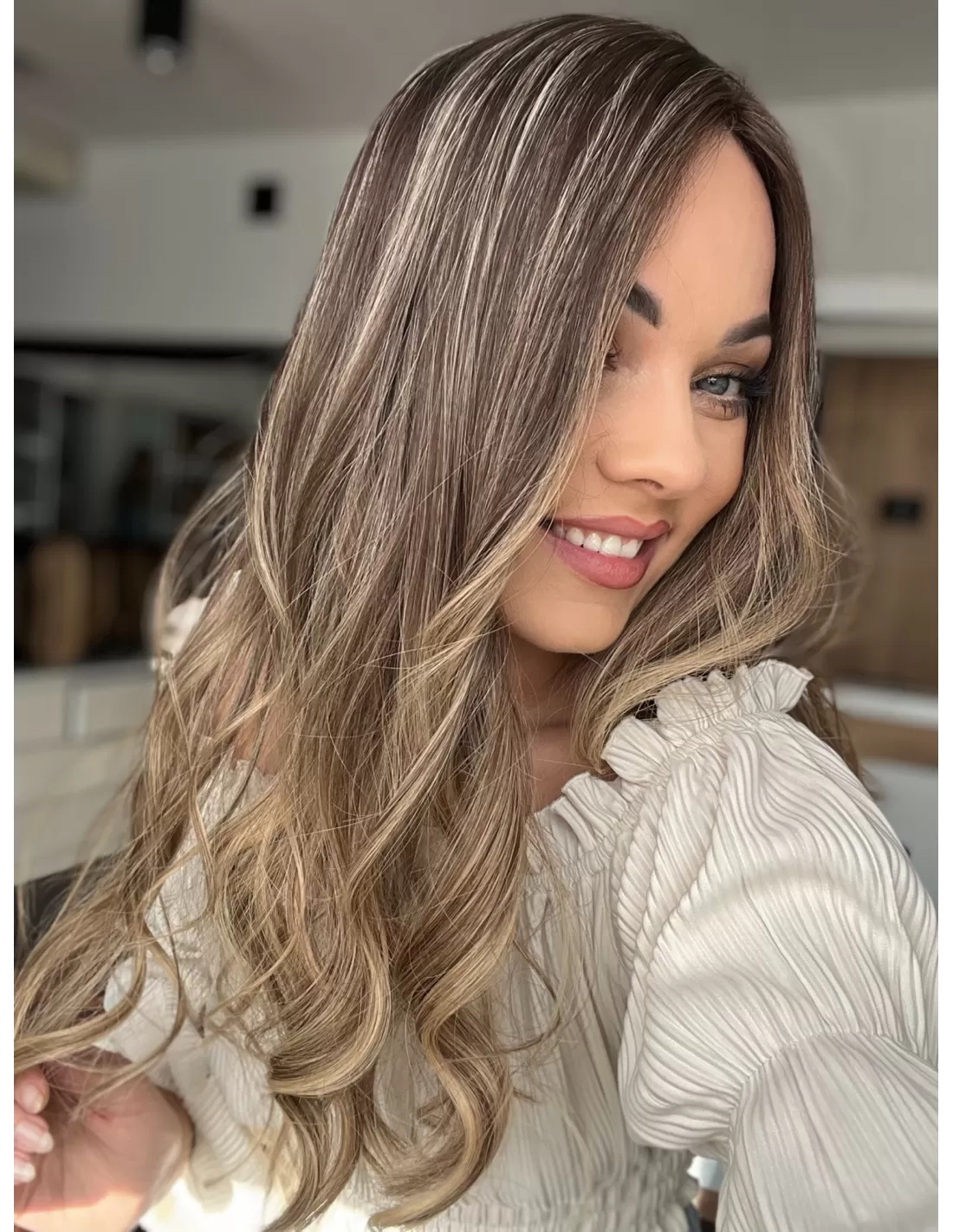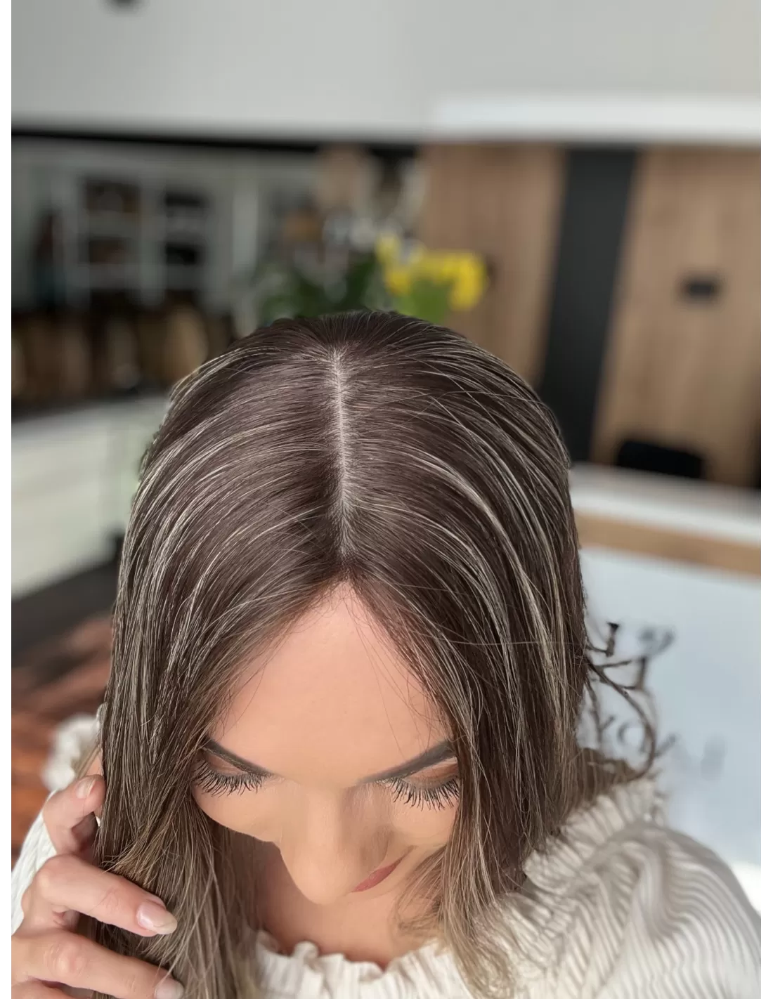 Kolor toppera to połączenie średniego brązu ( mysi kolor) z bardzo subtelnym przejściem w jaśniejszą tonacje blondu połączoną z dodatkowymi subtelnymi refleksami.