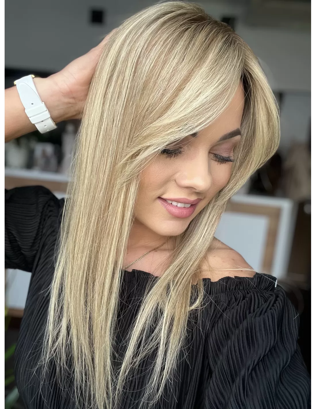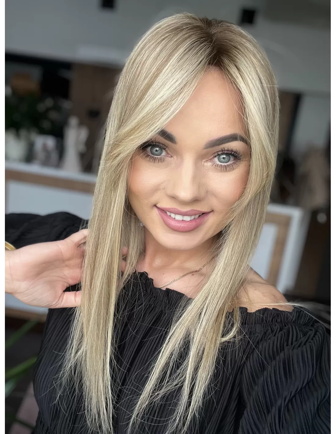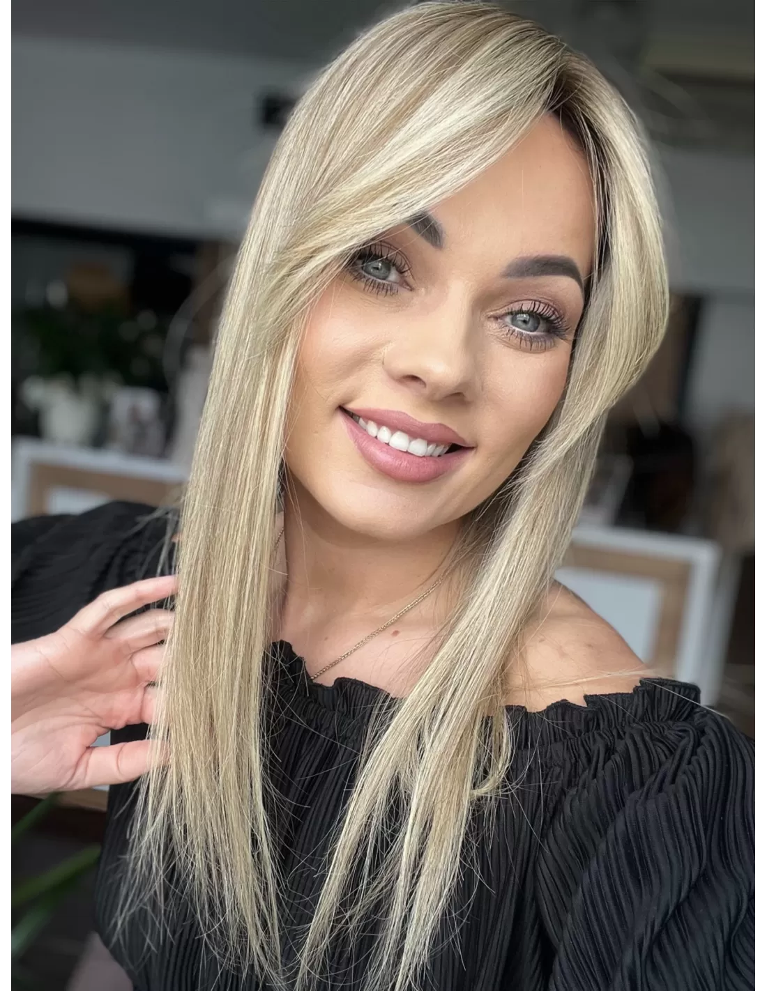 Kolor to słoneczny baleyage blond z subtelnym, ciemniejszym odrostem, który dodaje fryzurze głębi i nowoczesnego charakteru. Długość 45 cm oraz delikatna grzywka Hollywood nadają całości kobiecego uroku i świeżości.