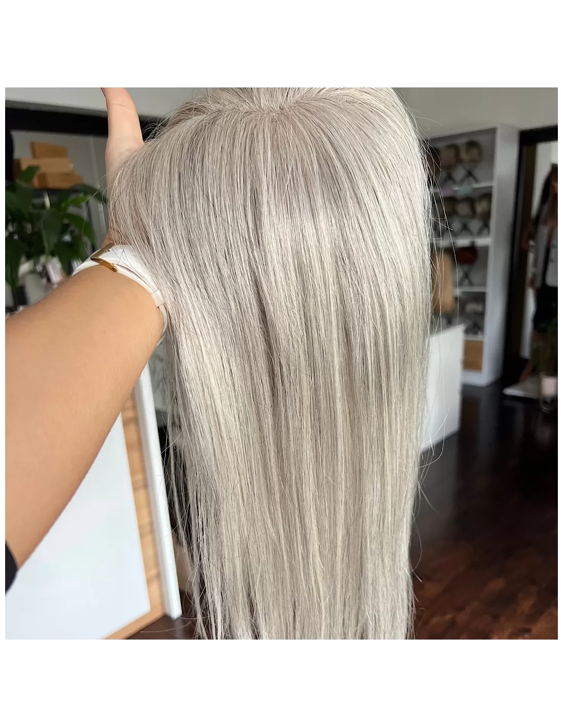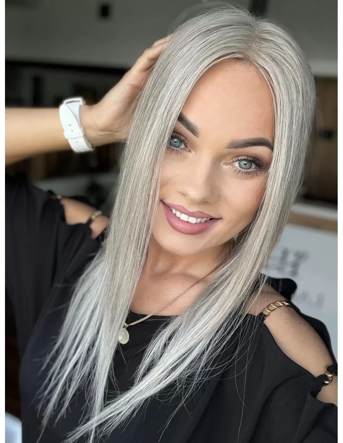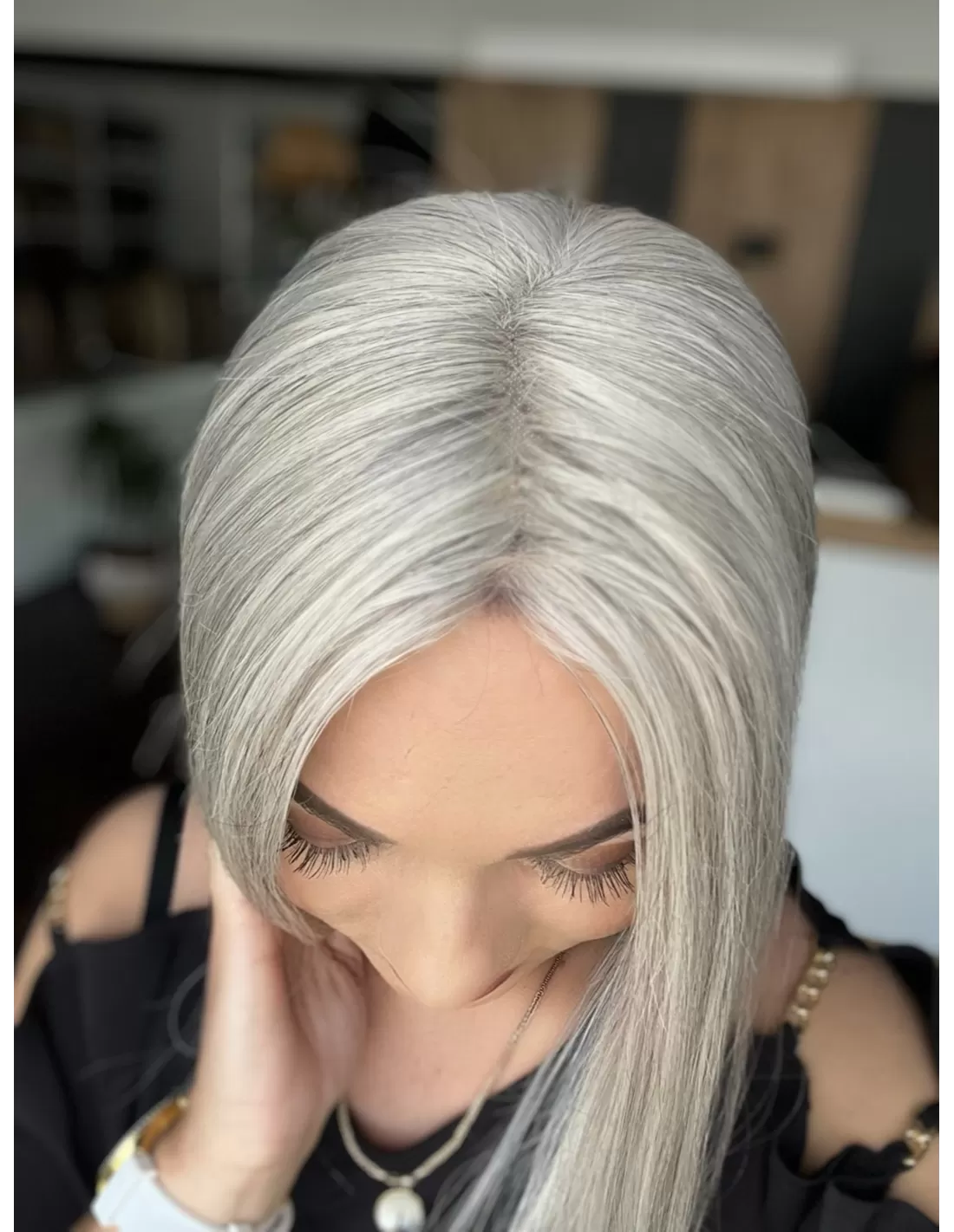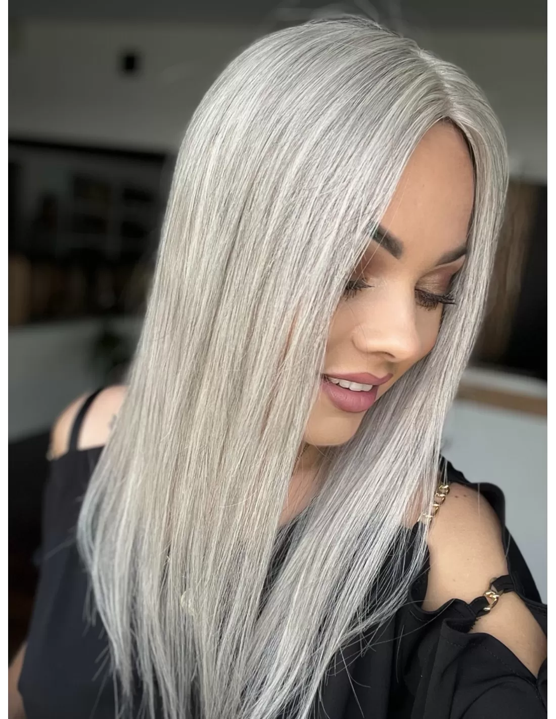 Kolor to chłodny, srebrzysty odcień – elegancki i świetlisty, z delikatnym połyskiem i głębią. To harmonijna kompozycja jasnych siwych tonów, które pięknie odbijają światło, nadając fryzurze wyjątkowego charakteru i szyku.