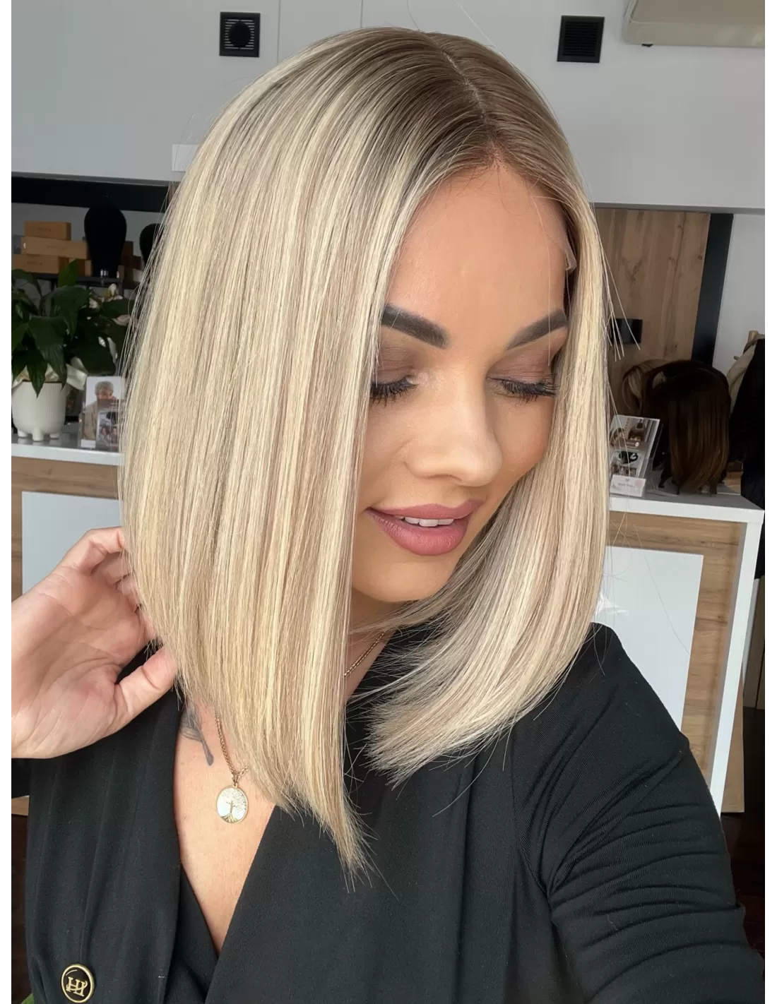 Włosy mają chłodny odcień blondu z subtelnym balejażem oraz delikatnym odrostem w kolorze chłodnego, średniego blondu, co dodaje fryzurze głębi i realistycznego wyglądu.