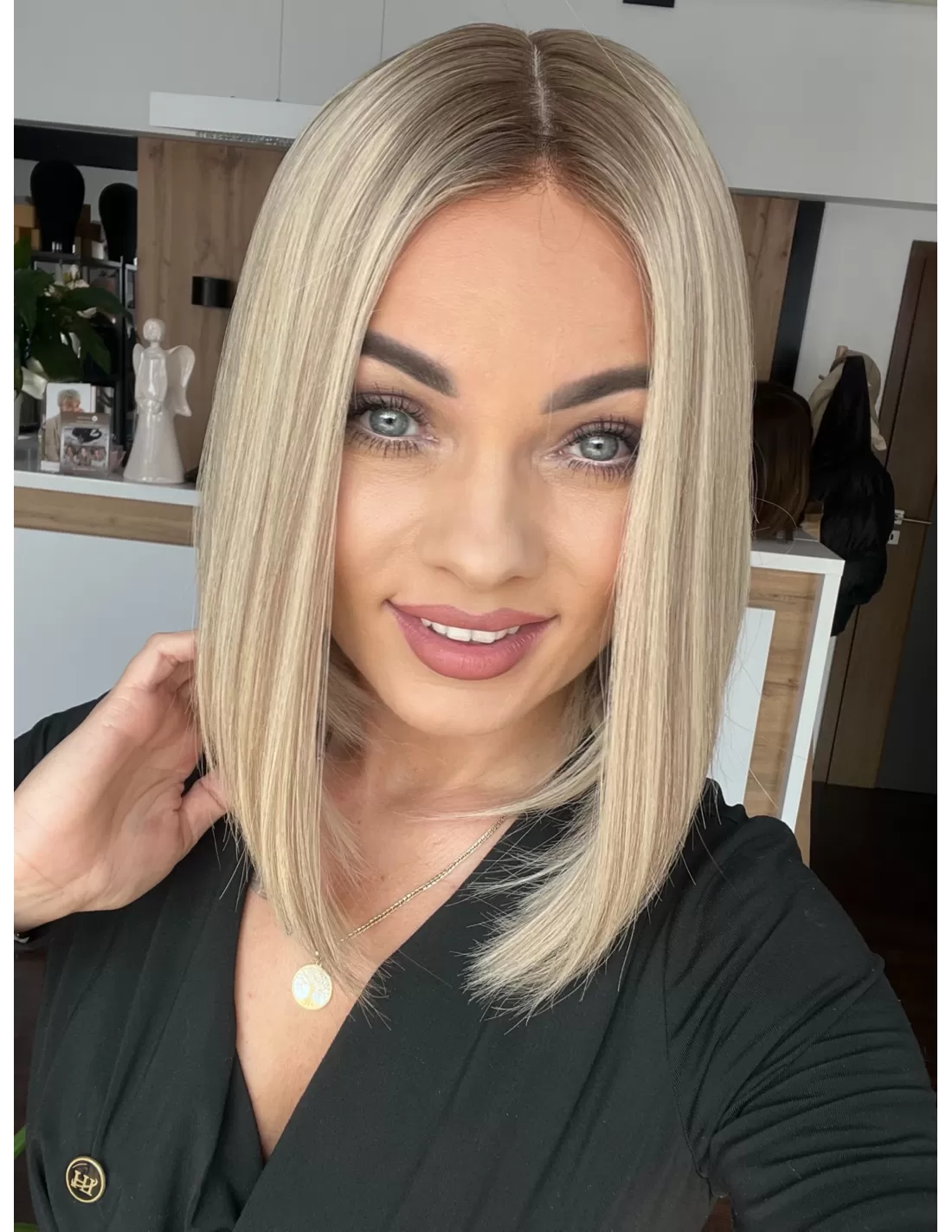 Włosy mają chłodny odcień blondu z subtelnym balejażem oraz delikatnym odrostem w kolorze chłodnego, średniego blondu, co dodaje fryzurze głębi i realistycznego wyglądu.