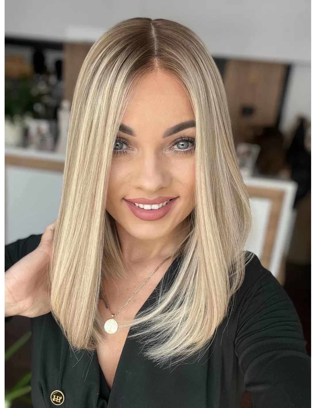 Włosy mają chłodny odcień blondu z subtelnym balejażem oraz delikatnym odrostem w kolorze chłodnego, średniego blondu, co dodaje fryzurze głębi i realistycznego wyglądu.