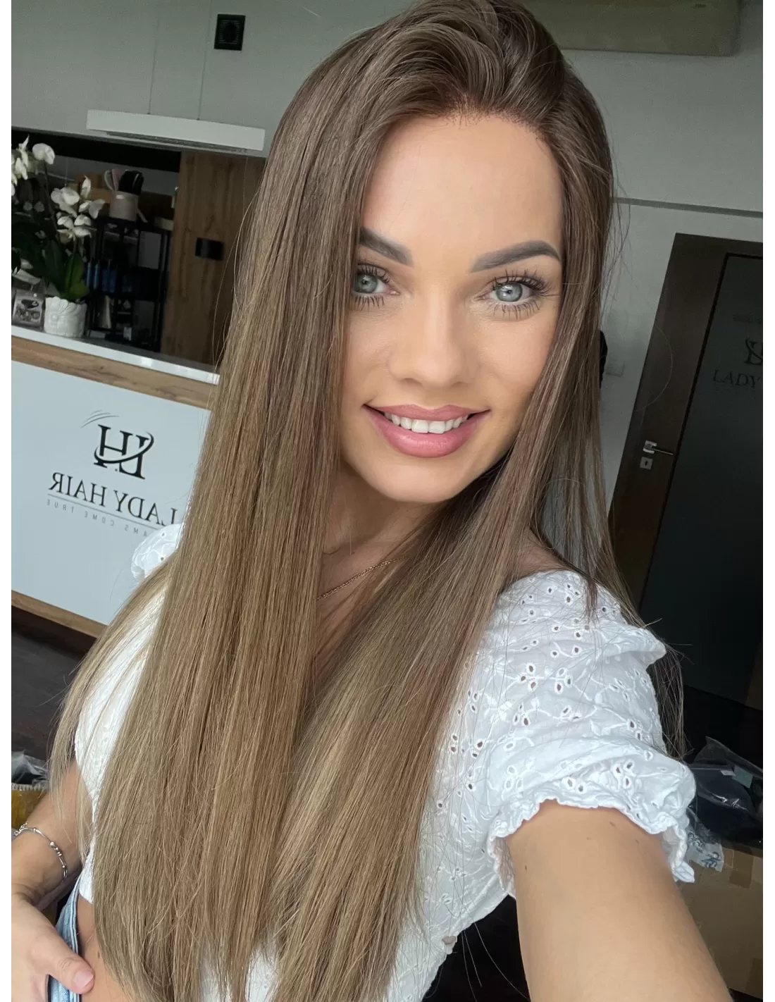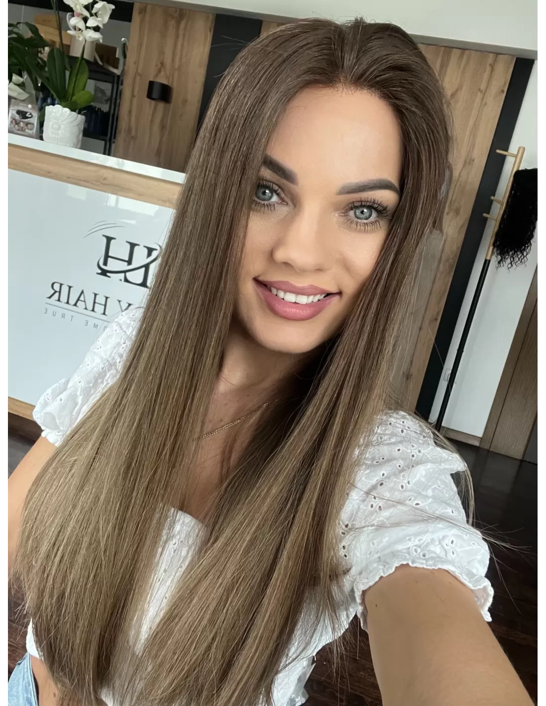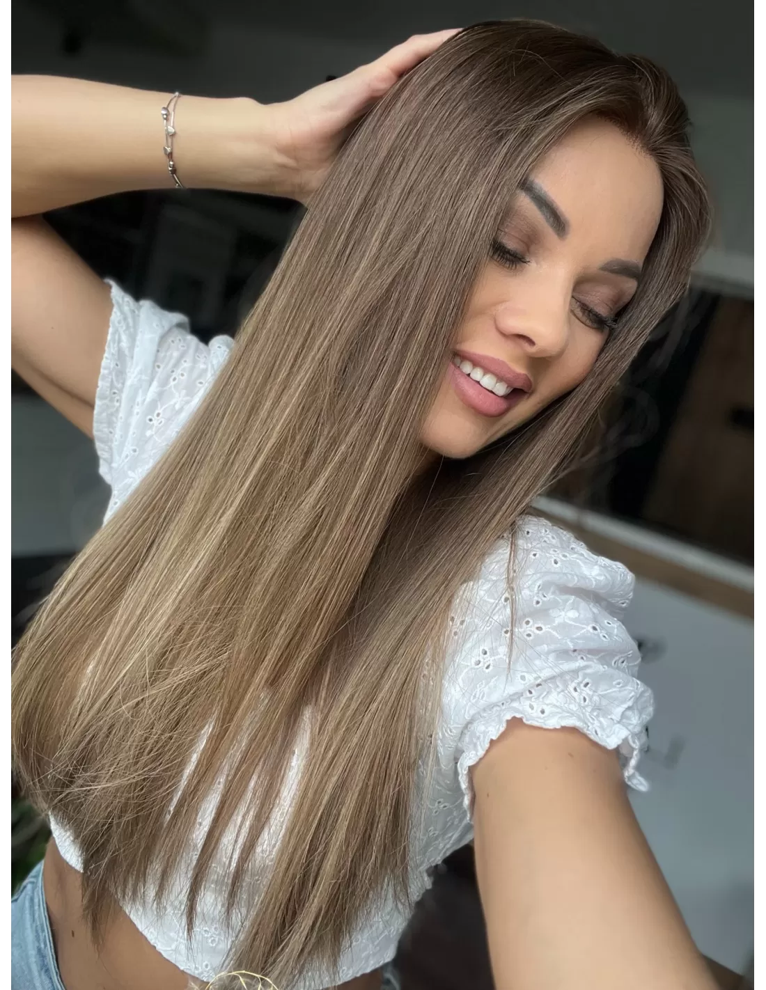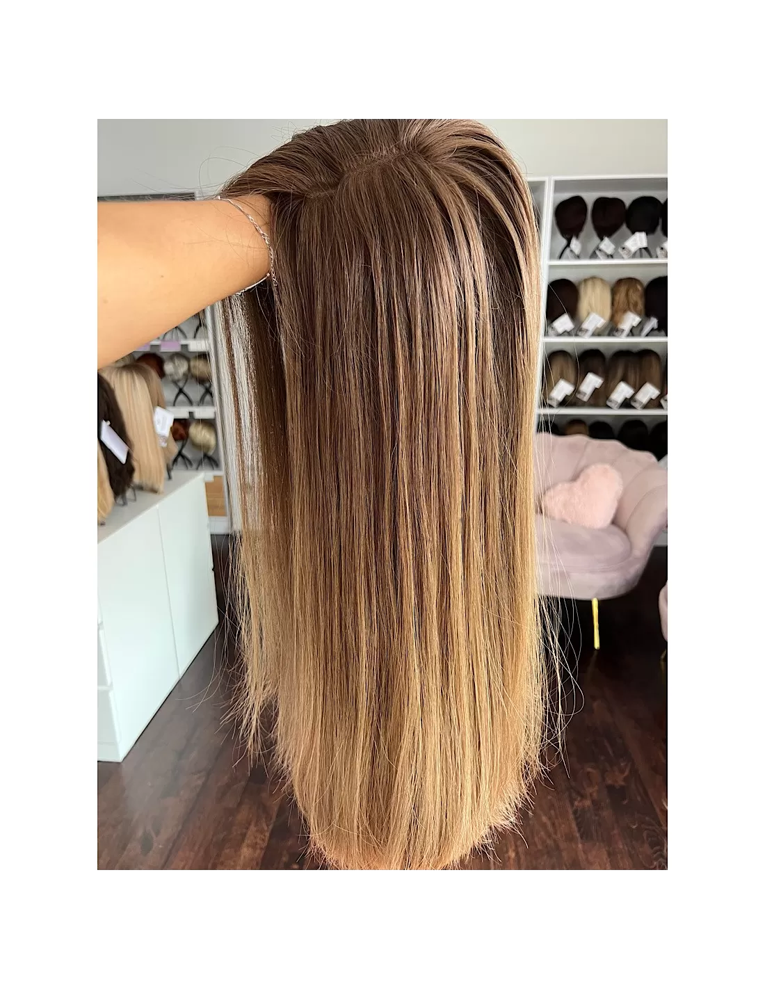 U nasady peruki znajduje się odrost w kolorze naturalnego brązu w chłodnym odcieniu , który dodaje kontrastu i głębi. Ten odcień stopniowo przechodzi w stonowany ciepły brąz aż po blond po długości, tworząc wyjątkowe przejście kolorów (ombre). Ostateczny efekt to harmonijne zestawienie naturalnego brązu i delikatnego ciepłego blondu po długości, co nadaje peruce wyjątkowego uroku.
