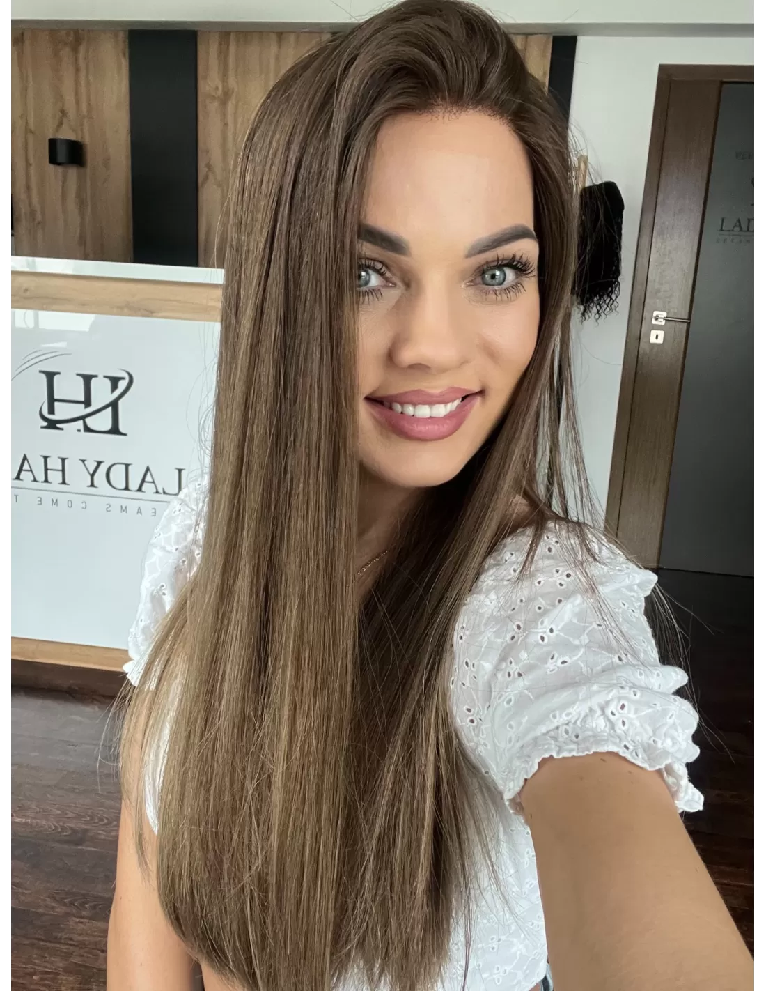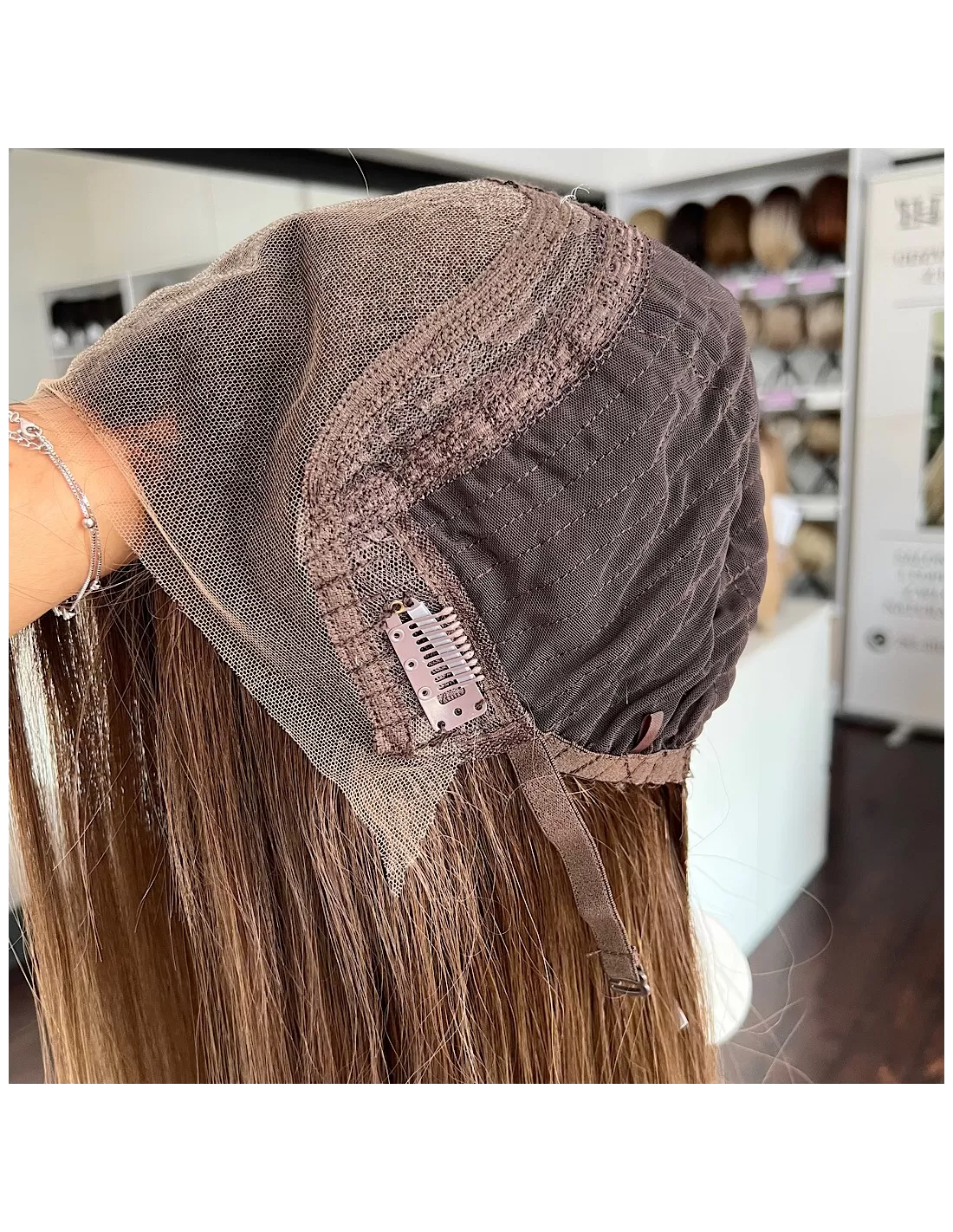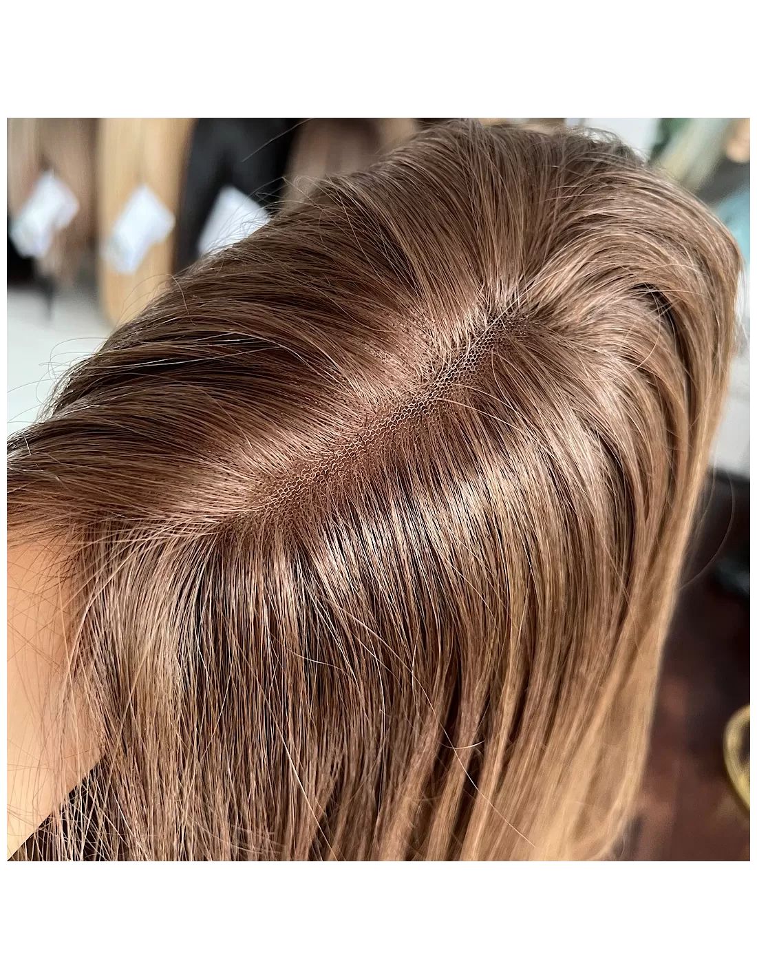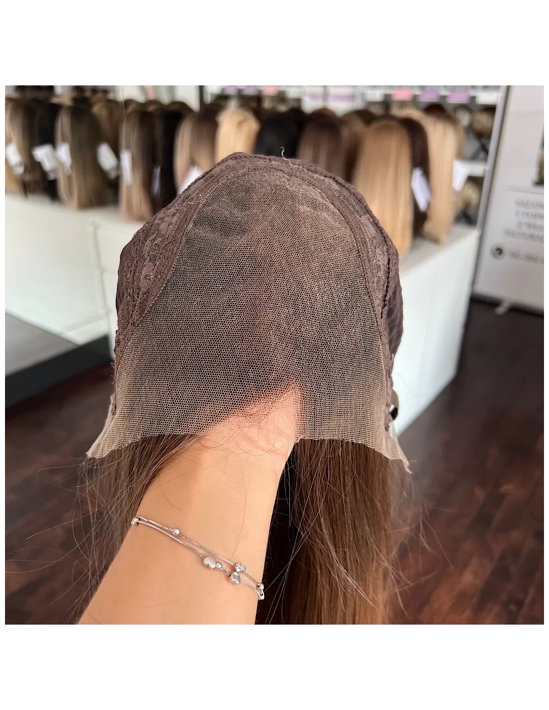 U nasady peruki znajduje się odrost w kolorze naturalnego brązu w chłodnym odcieniu , który dodaje kontrastu i głębi. Ten odcień stopniowo przechodzi w stonowany ciepły brąz aż po blond po długości, tworząc wyjątkowe przejście kolorów (ombre). Ostateczny efekt to harmonijne zestawienie naturalnego brązu i delikatnego ciepłego blondu po długości, co nadaje peruce wyjątkowego uroku.