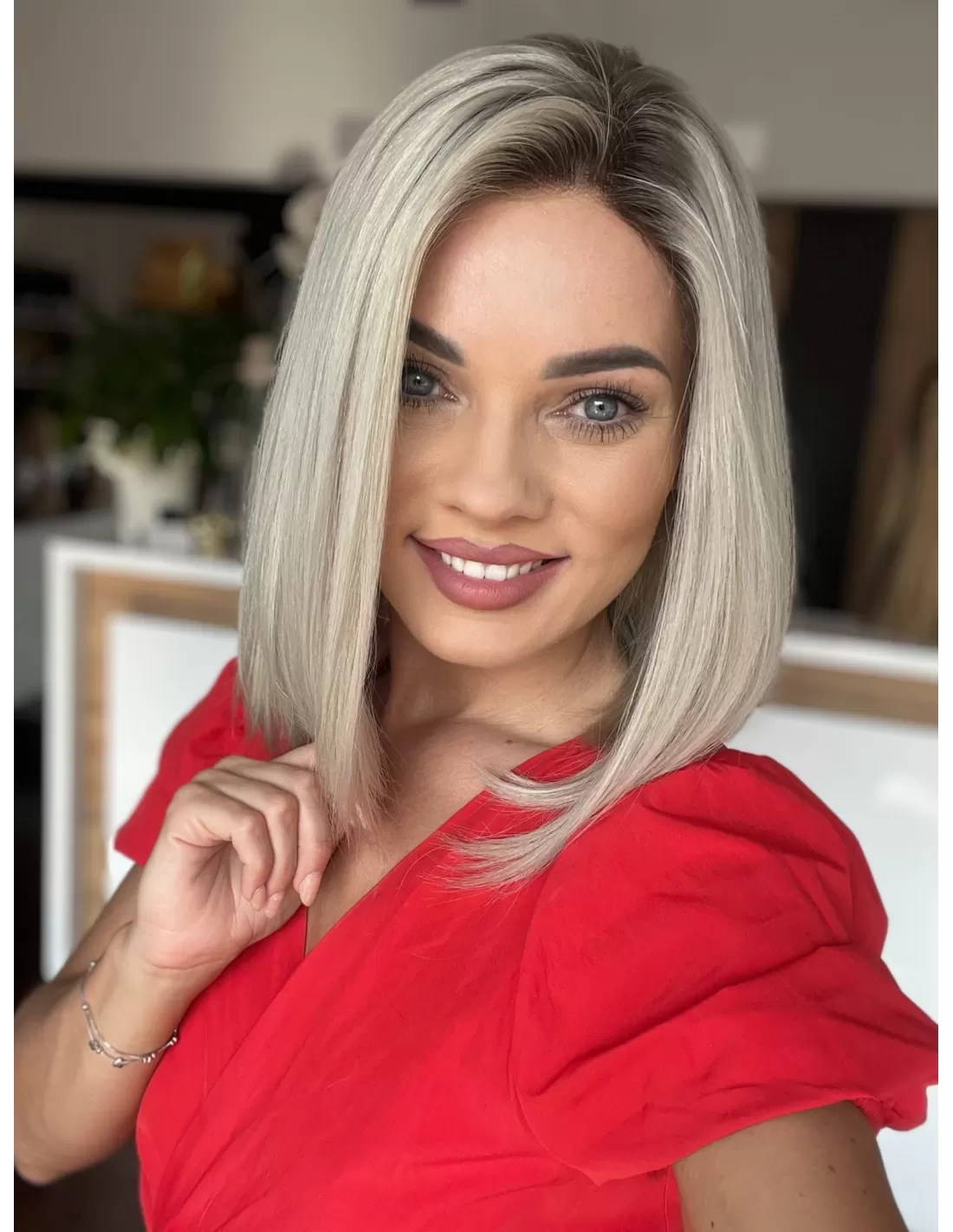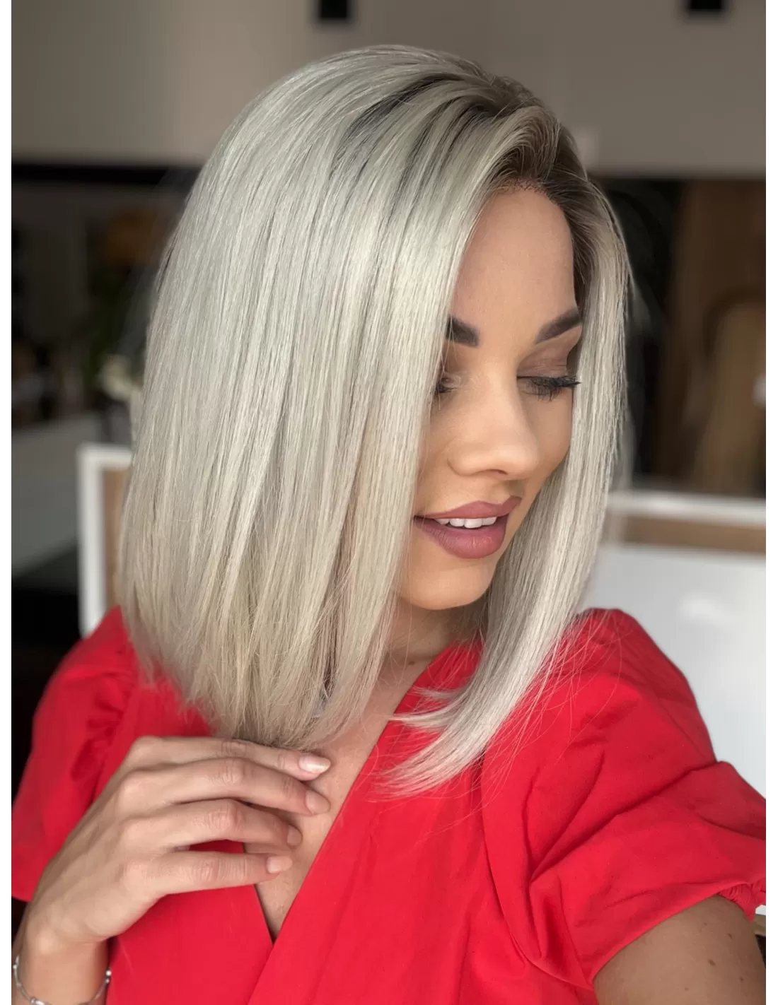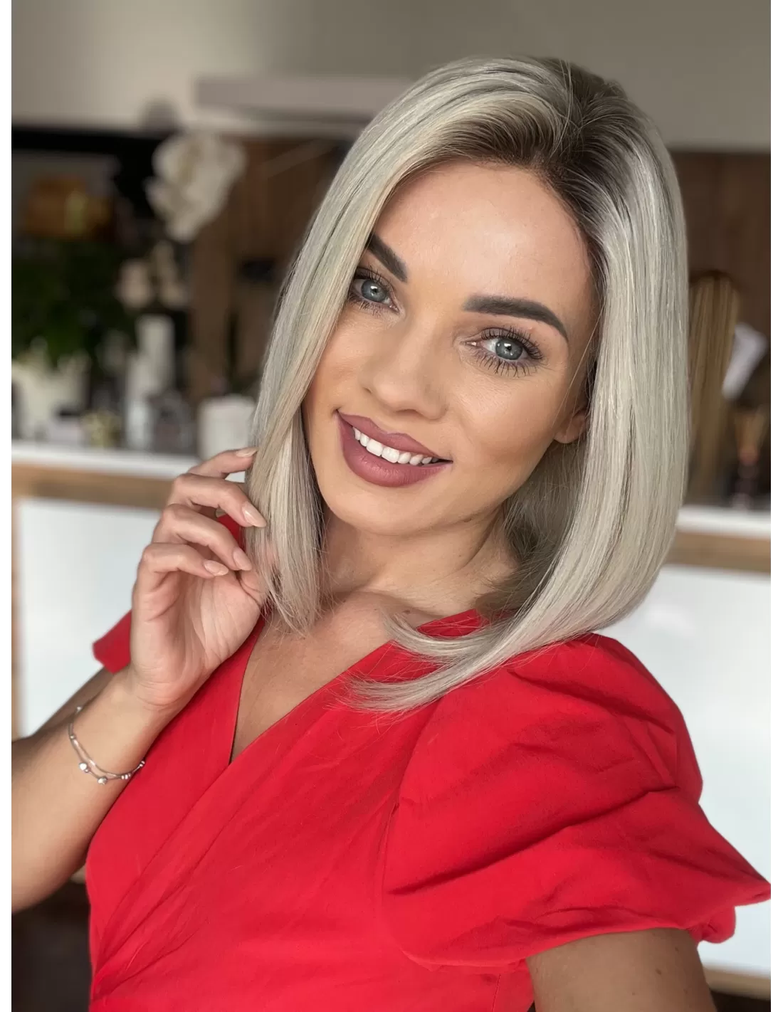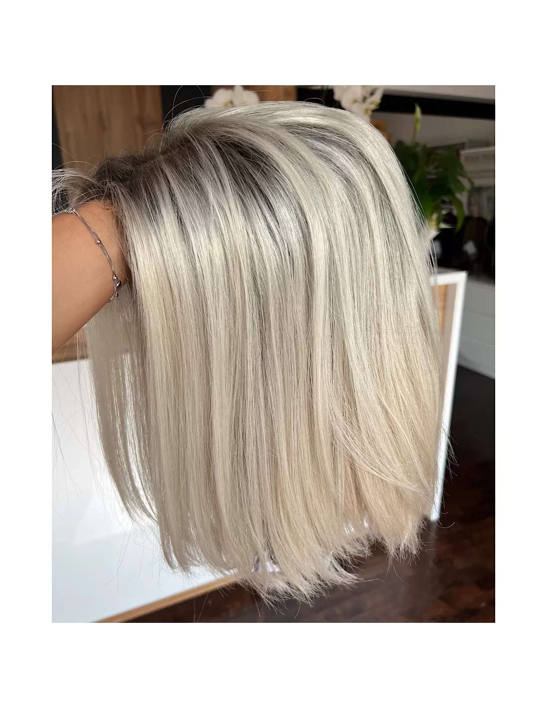 Odcień jasnego blondu na poziomie 60A to czysta, subtelnia elegancja. Włosy są delikatne, a jednocześnie emanują naturalnym blaskiem. Kolor ten jest zmysłowy i nadaje się doskonale do wielu różnych stylizacji. Jasny blond 60A jest kolorem, który jest zarówno klasyczny, jak i nowoczesny, co sprawia, że peruka ta jest niezwykle wszechstronna, aby całość wyglądała jeszcze bardziej naturalnie peruka Nora posiada subtelny odrost w chłodnym grafitowym kolorze, dzięki czemu zwiększa on realistyczność naturalnego wyglądu.