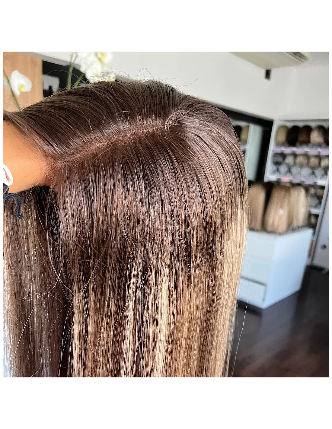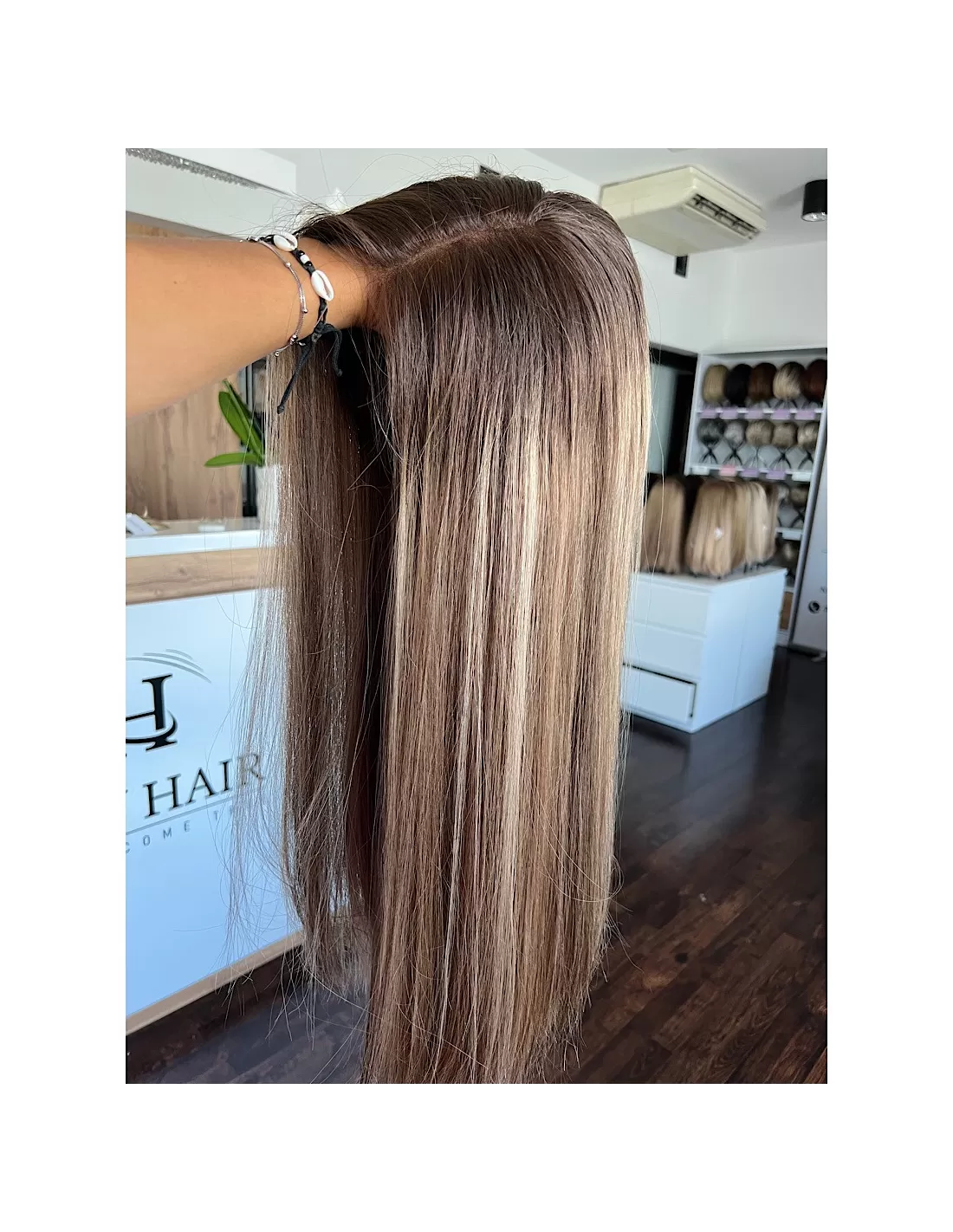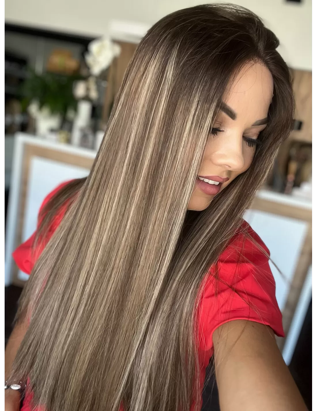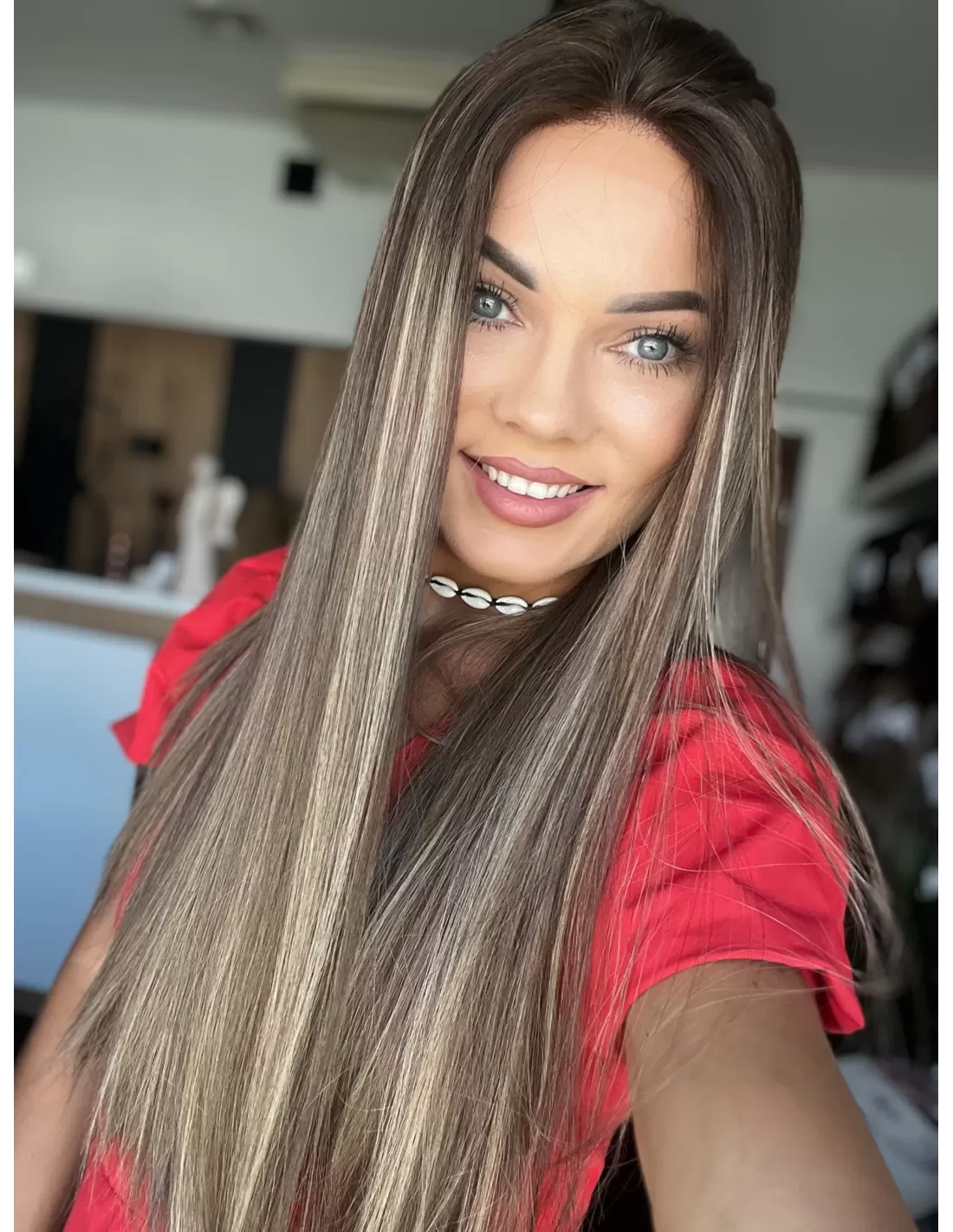 Kolor peruki :dłuższy odrost w kolorze średniego brązu, który płynnie przechodzi w stylowy balejaż. Długość peruki zdobią misternie przeplecione pasemka w odcieniach jasnego blondu i ciepłego brązu. Ta subtelna gra kolorów tworzy trójwymiarowy efekt głębi, nadając fryzurze wyjątkowego charakteru. To doskonały wybór dla tych, którzy pragną oryginalności i naturalności w jednym. Elastyczny czepek i możliwość regulacji zapewniają idealne dopasowanie do kształtu głowy .