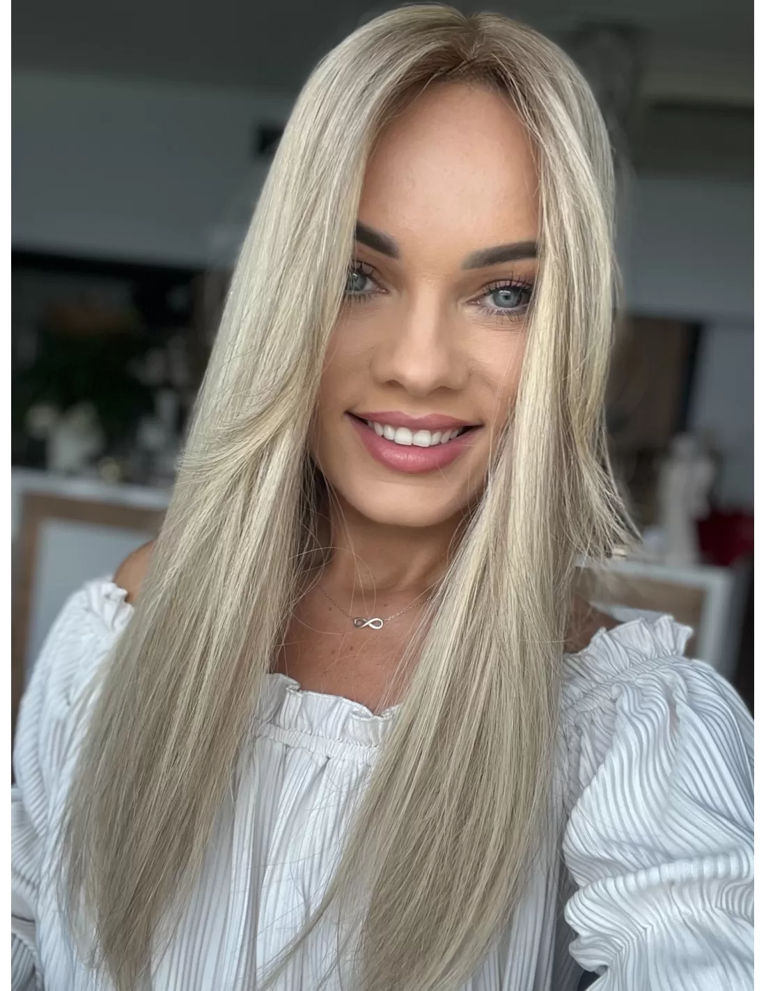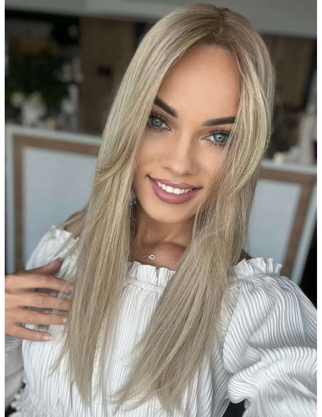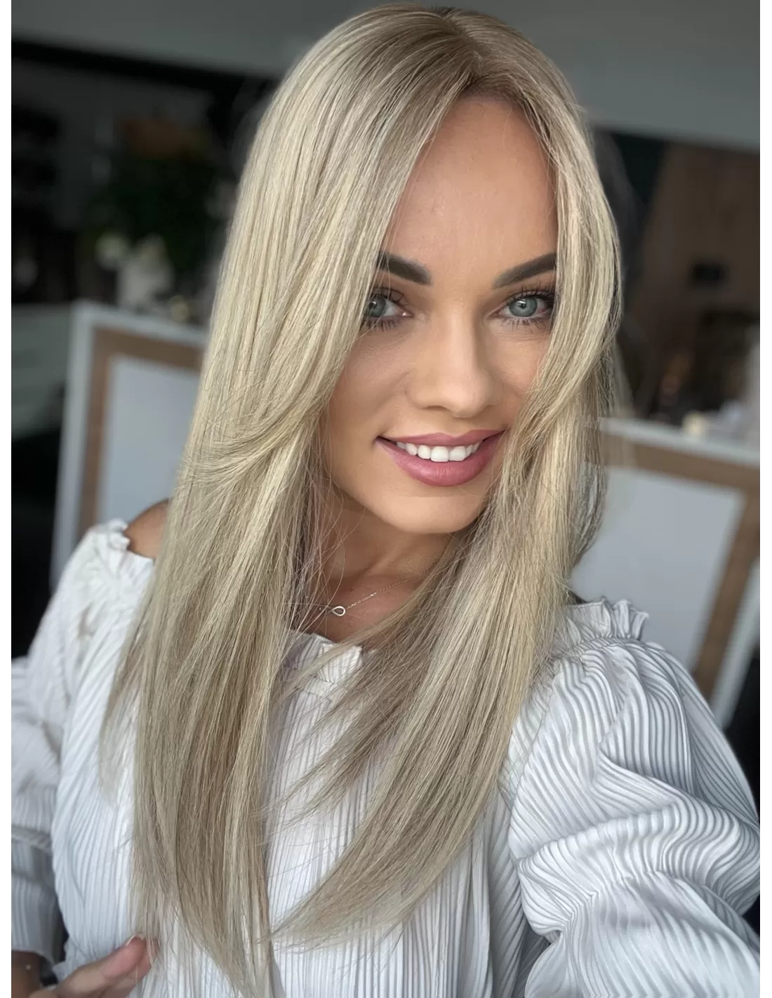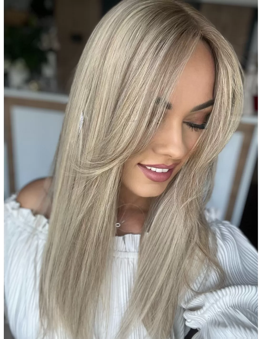 - Kolor: Chłodny balejaż blond – naturalnie przeplecione odcienie chłodnego blondu, które nadają włosom głębię i trójwymiarowość.