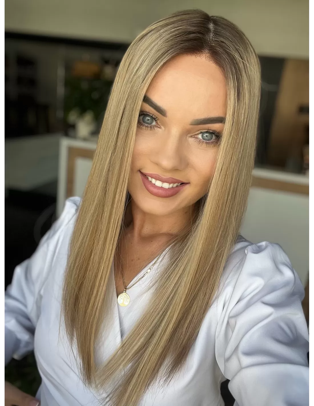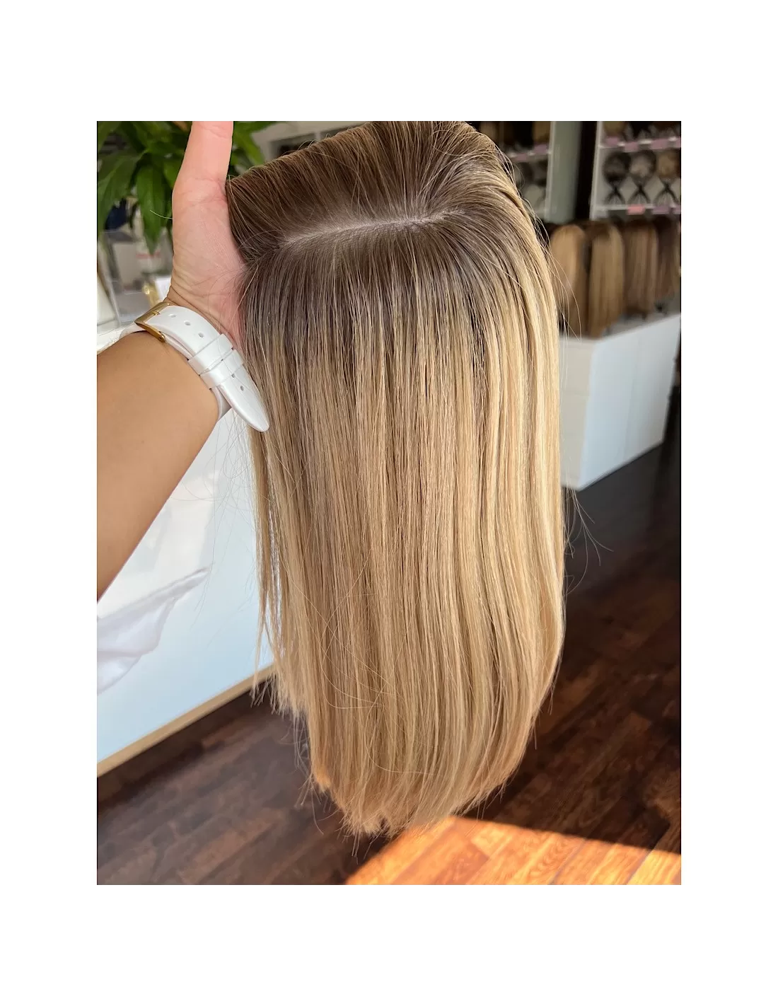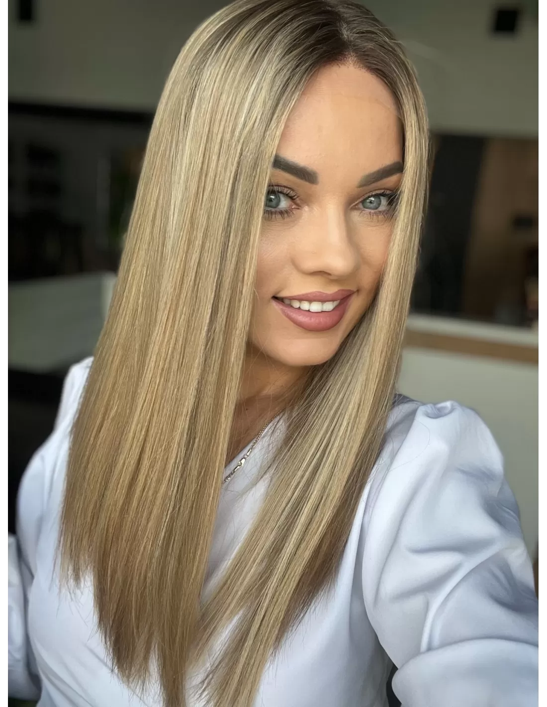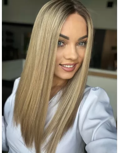 Ta wyjątkowa peruka z włosów naturalnych zachwyca perfekcyjnie dobranym balejażem w ciepłych odcieniach blondu. Mieszanka jasnych, złocistych i miodowych tonów tworzy efekt trójwymiarowej głębi, nadając fryzurze naturalny, pełen blasku wygląd. Delikatny odrost w odcieniu średniego brązu subtelnie podkreśla naturalność koloru, dodając mu autentycznego charakteru.
