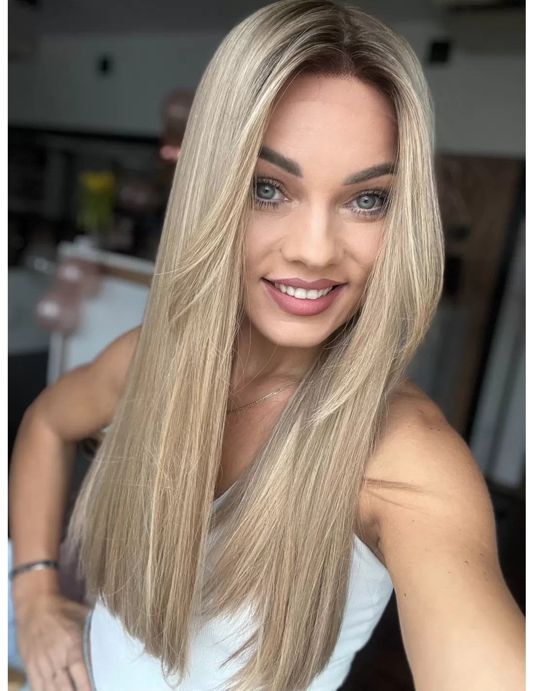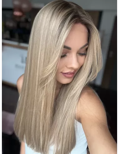 Ta wyjątkowa peruka z włosów naturalnych zachwyca perfekcyjnie dobranym balejażem w ciepłych odcieniach blondu. Mieszanka jasnych, złocistych i miodowych tonów tworzy efekt trójwymiarowej głębi, nadając fryzurze naturalny, pełen blasku wygląd. Delikatny odrost w odcieniu średniego brązu subtelnie podkreśla naturalność koloru, dodając mu autentycznego charakteru.