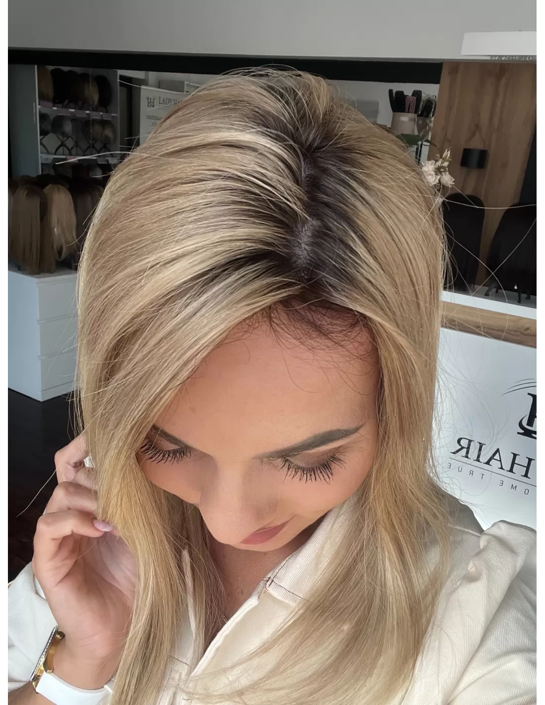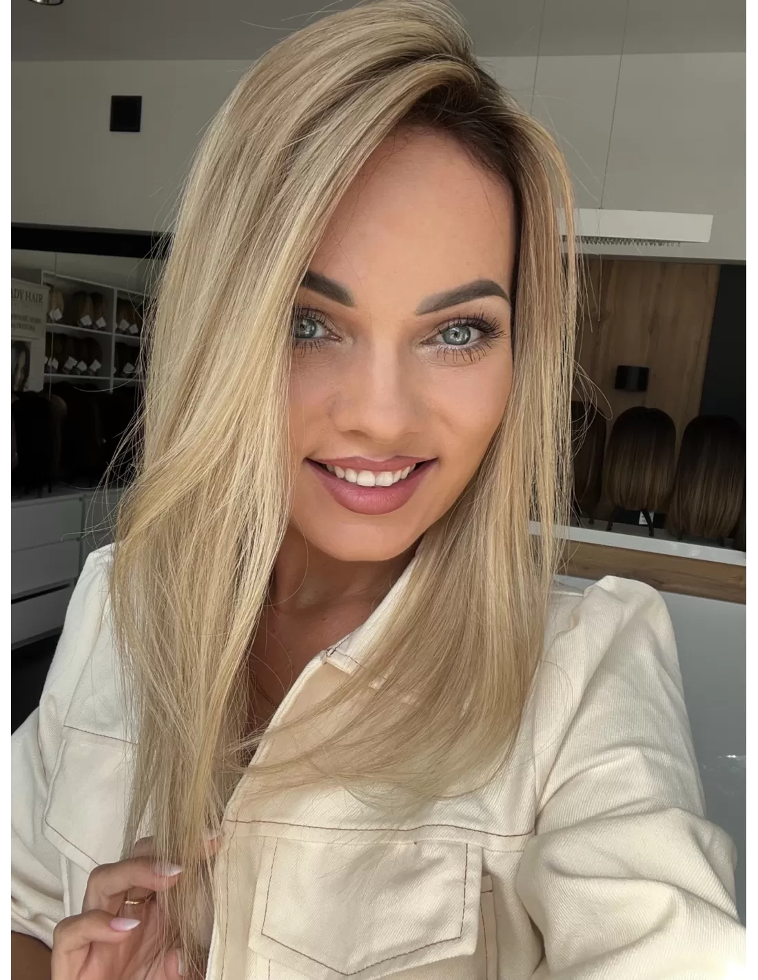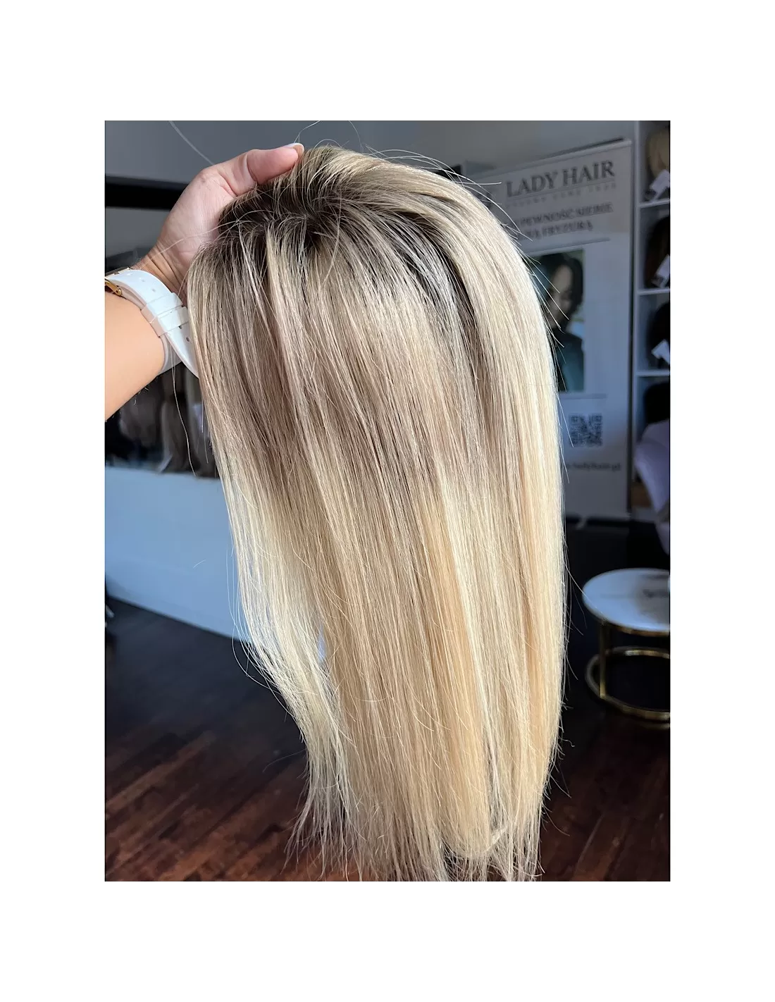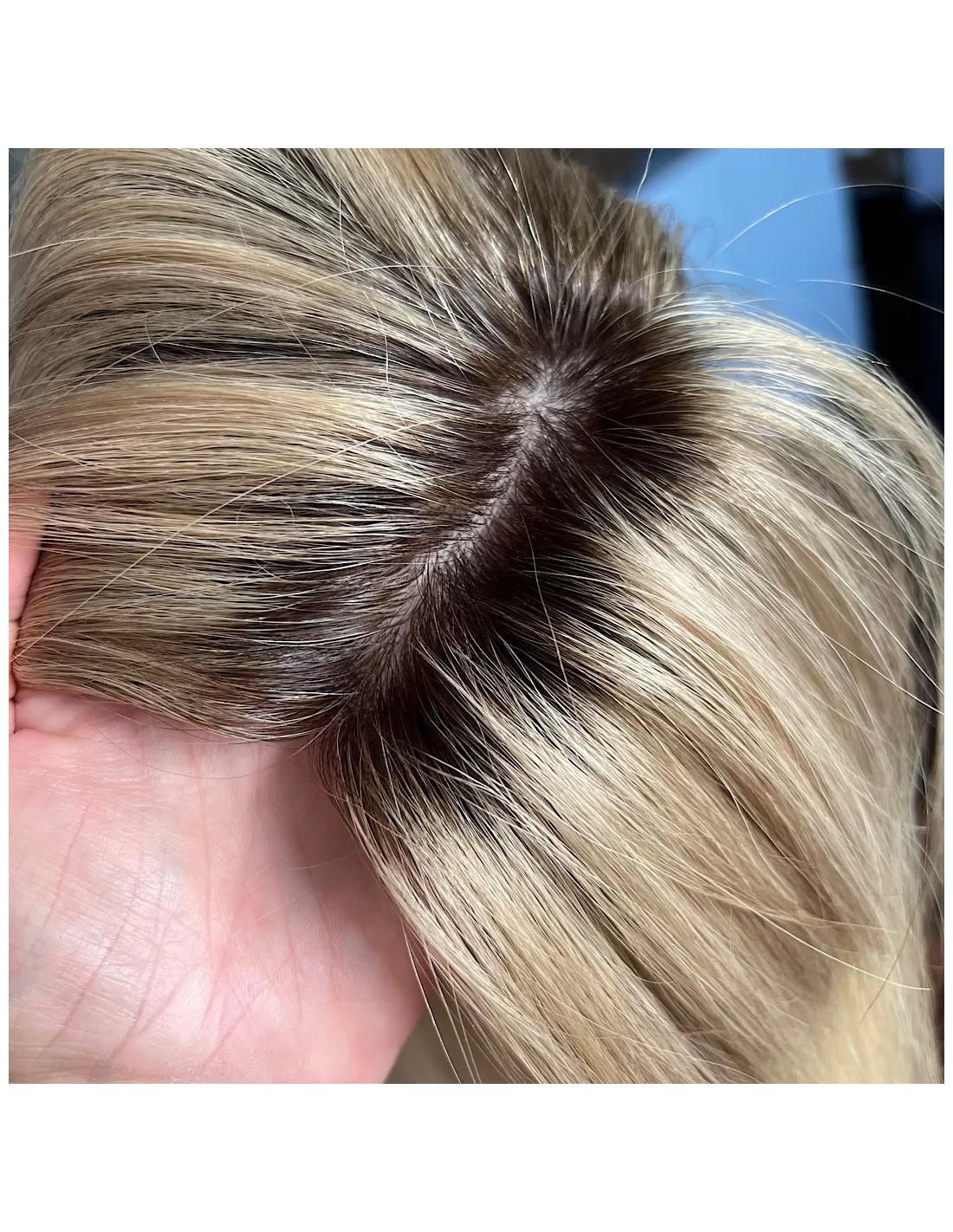 chłodny blond z odrostem – ciemniejsza, naturalna nasada w odcieniu popielatego brązu subtelnie przechodzi w beżowo-platynowy blond na długości. Wielowymiarowy kolor dodaje fryzurze świeżości i naturalnego wyglądu, a odrost sprawia, że topper pięknie stapia się z własnymi włosami.