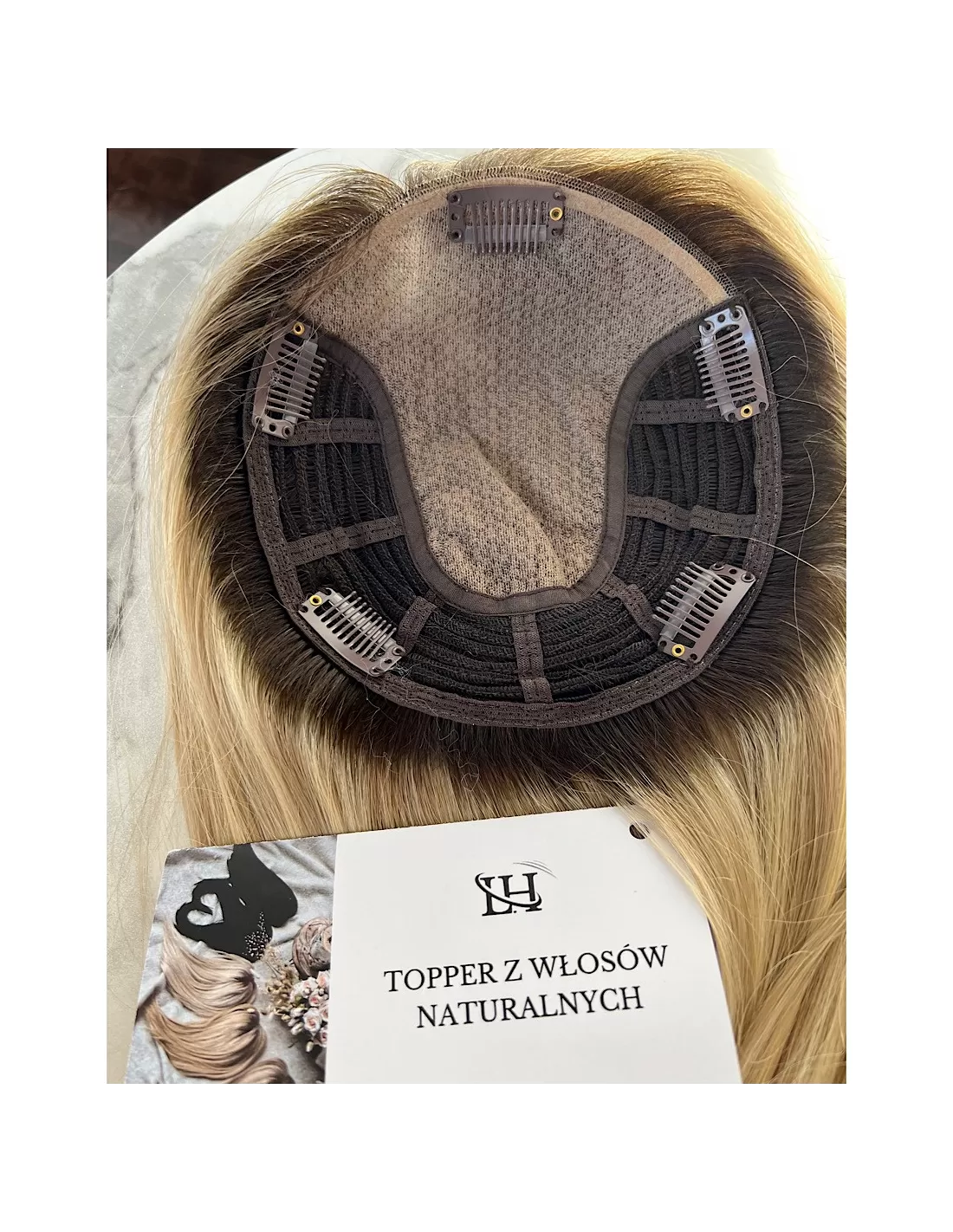 Topper posiada bazę o wymiarach 15x17 cm, wykonaną z oddychających materiałów z centralną wkładką z mikroskóry – imitacji naturalnej skóry głowy, która pozwala na dowolne modelowanie przedziałka i gwarantuje maksymalnie realistyczny efekt. Elastyczny tył bazy sprawia, że topper doskonale dopasowuje się do kształtu głowy, zapewniając komfort noszenia przez cały dzień.