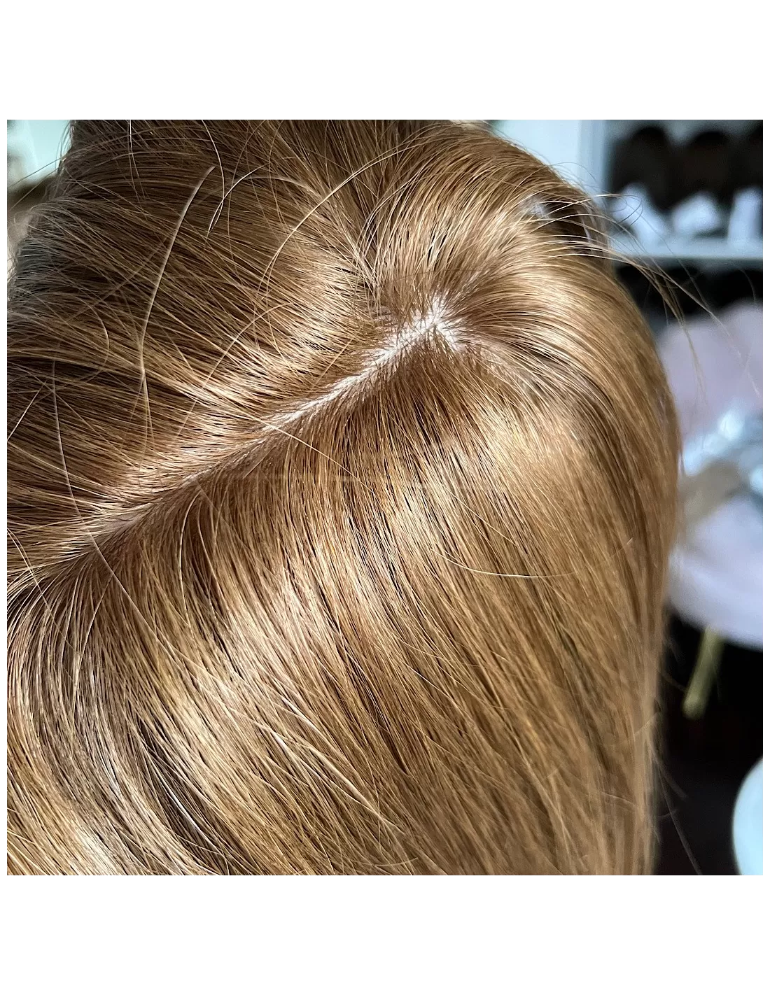 Topper posiada bazę o wymiarach 15x17 cm, wykonaną z oddychających materiałów z centralną wkładką z mikroskóry – imitacji naturalnej skóry głowy, która pozwala na dowolne modelowanie przedziałka i gwarantuje maksymalnie realistyczny efekt. Elastyczny tył bazy sprawia, że topper doskonale dopasowuje się do kształtu głowy, zapewniając komfort noszenia przez cały dzień.