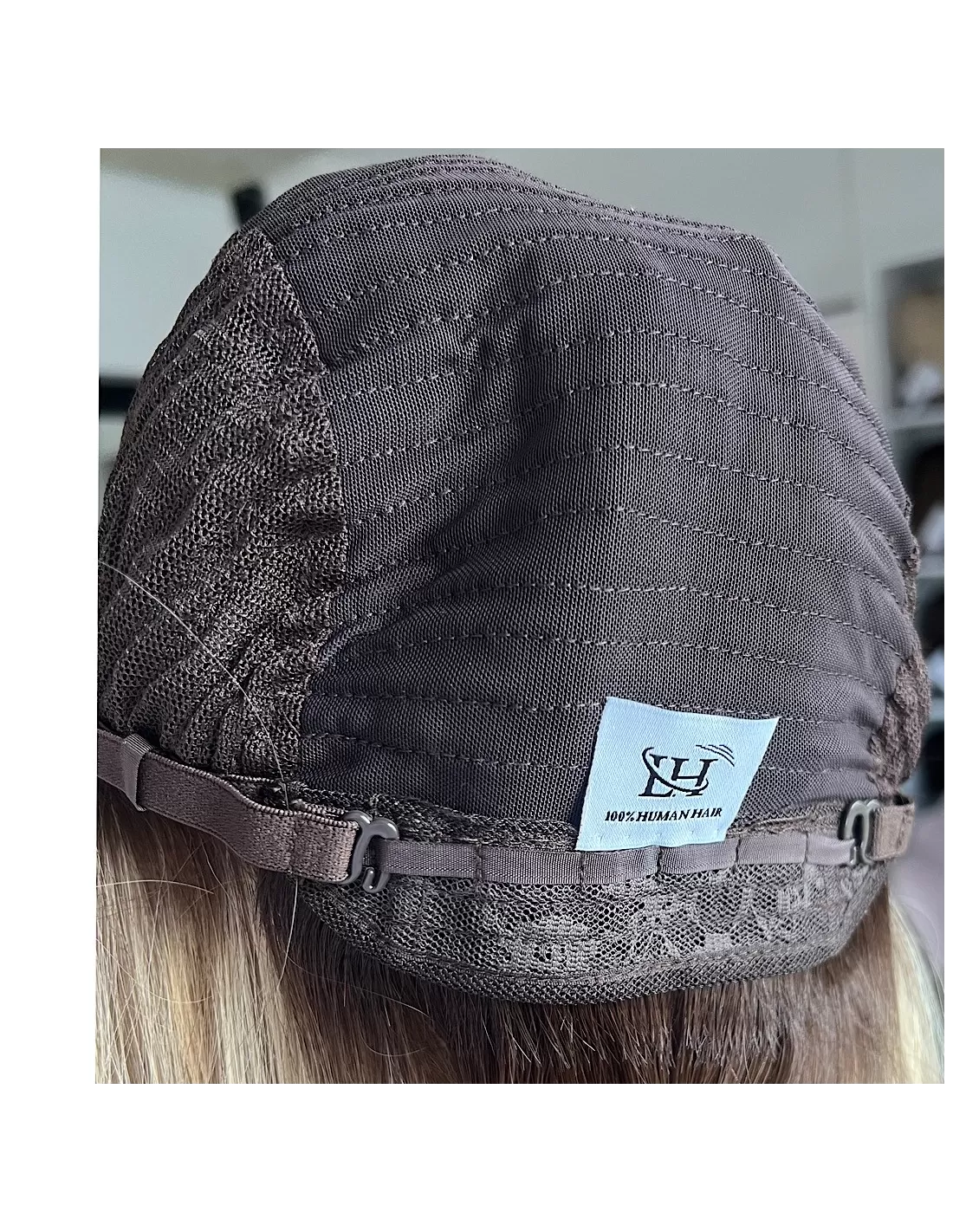 Peruka Milena 35 cm z włosów europejskich naturalnych. Ciepły balejaż blond ze średnim brązem u nasady, lace front, regulowany czepek, 130% gęstości.