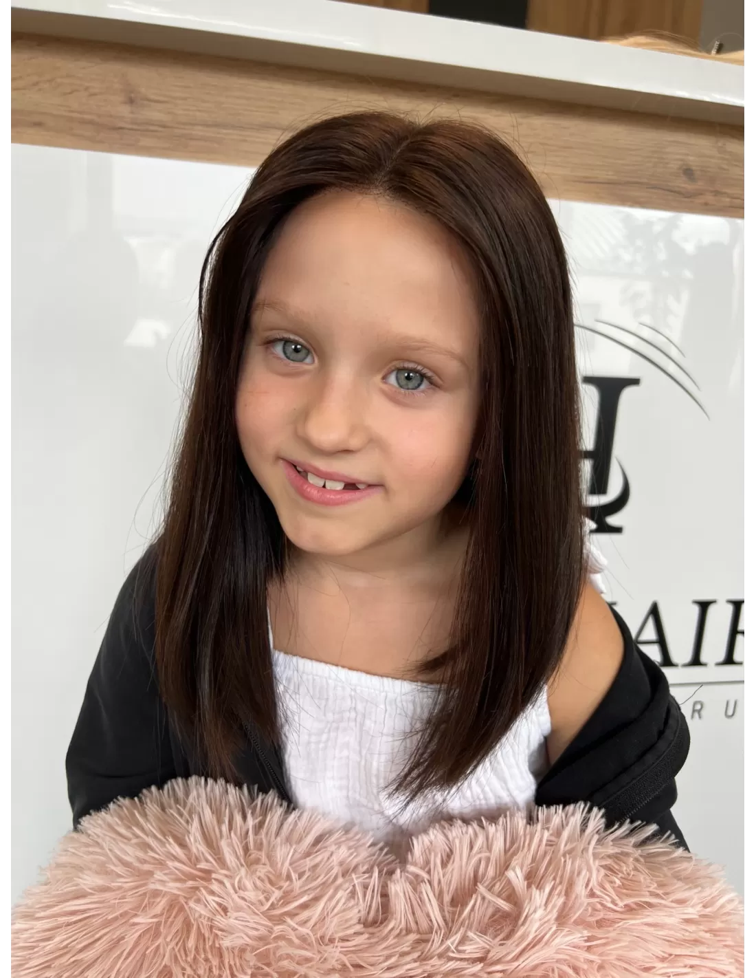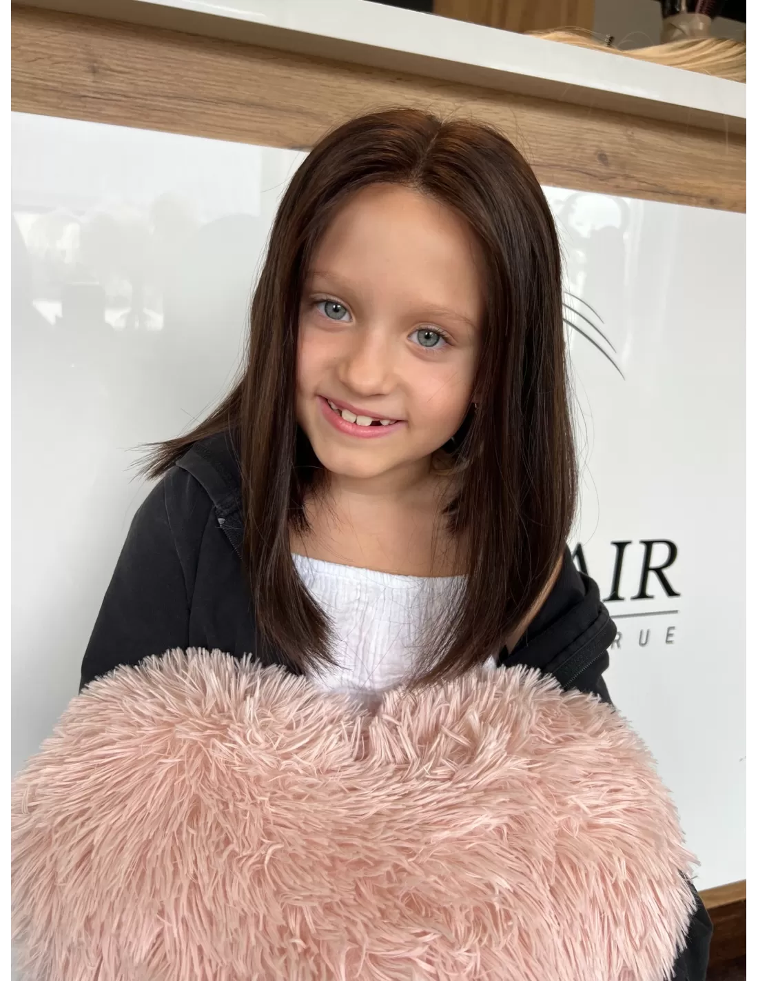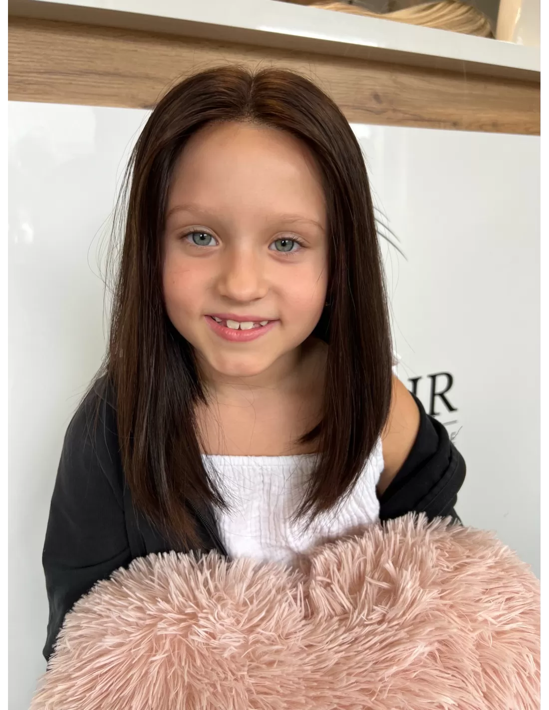 Największym atutem tej peruki jest kolor – ciemny, naturalny brąz, który wygląda bardzo subtelnie i naturalnie u dziecka. To odcień pełen ciepła i harmonii, pięknie podkreślający dziecięcą urodę i dodający fryzurze delikatnego uroku.