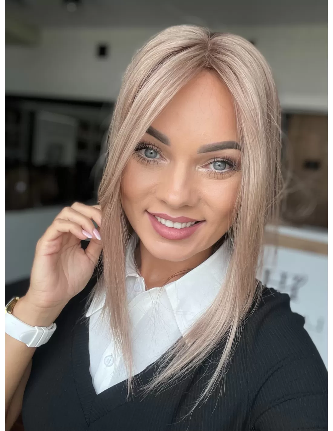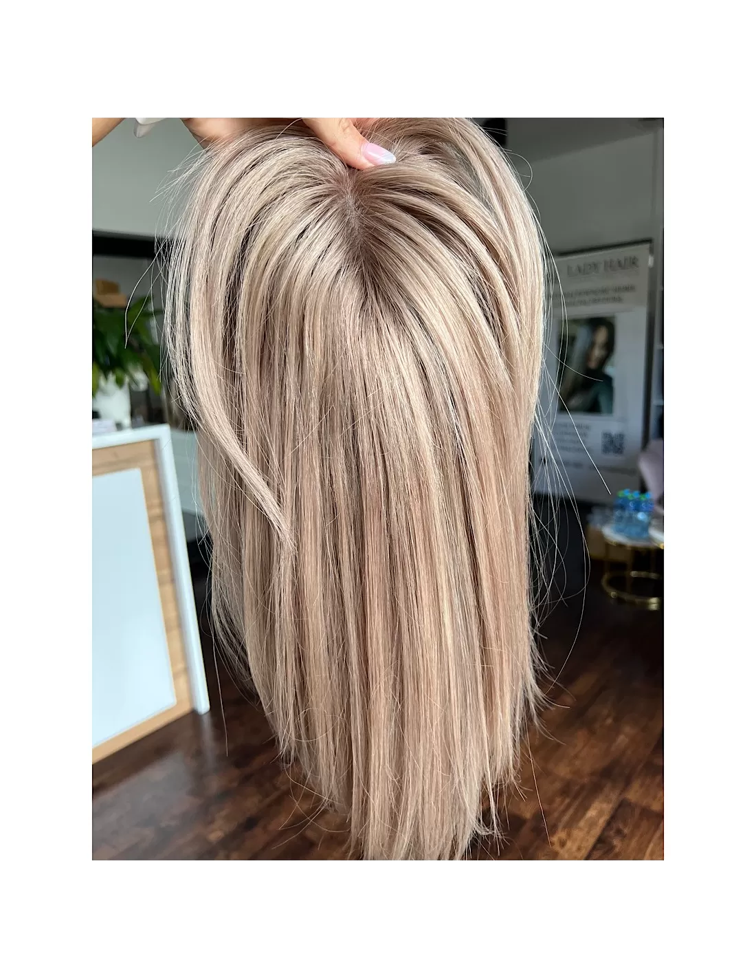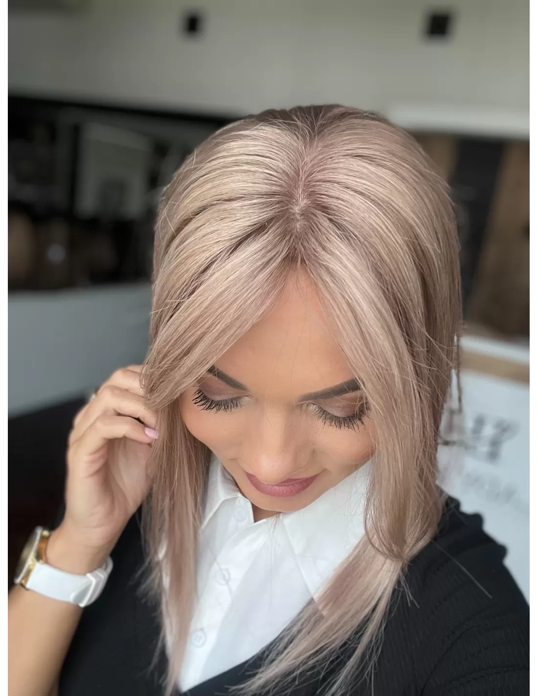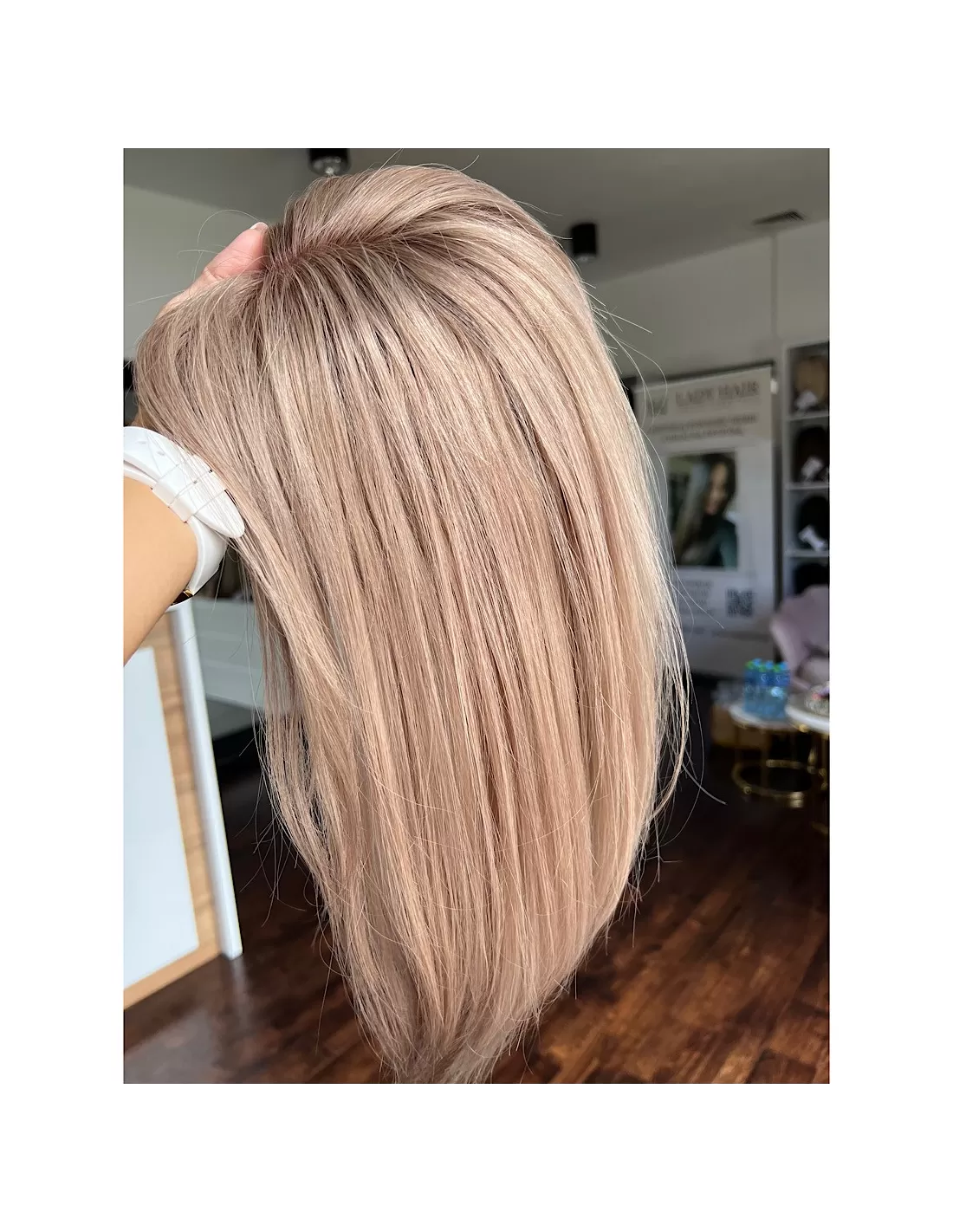 Kolor toppera Lili to harmonia bardzo jasnego perłowego blondu z nutką różowej poświaty, co nadaje mu niezwykły blask i elegancje.