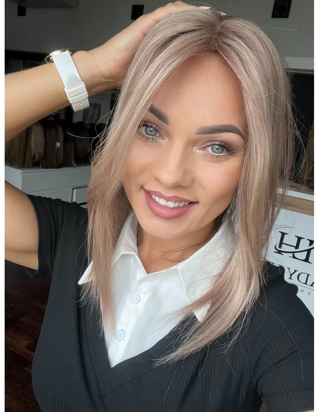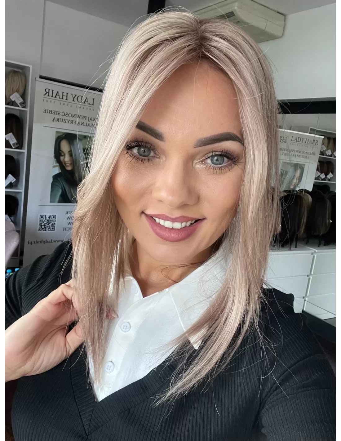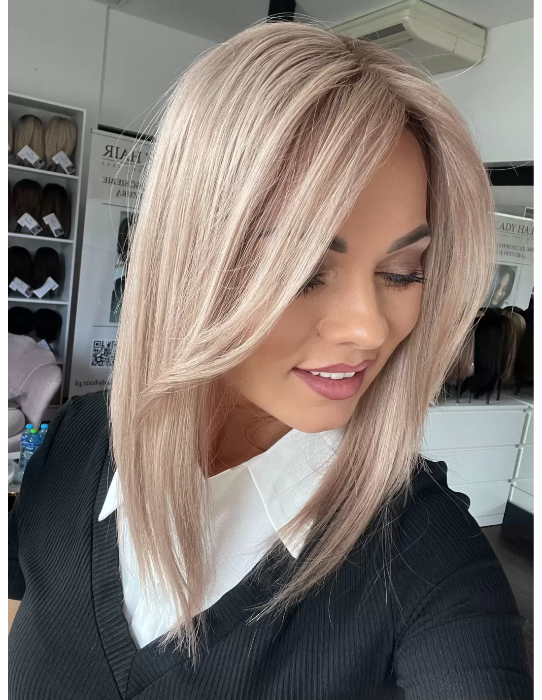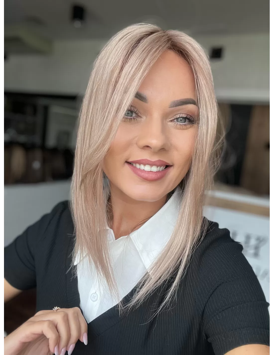 Kolor toppera Lili to harmonia bardzo jasnego perłowego blondu z nutką różowej poświaty, co nadaje mu niezwykły blask i elegancje.