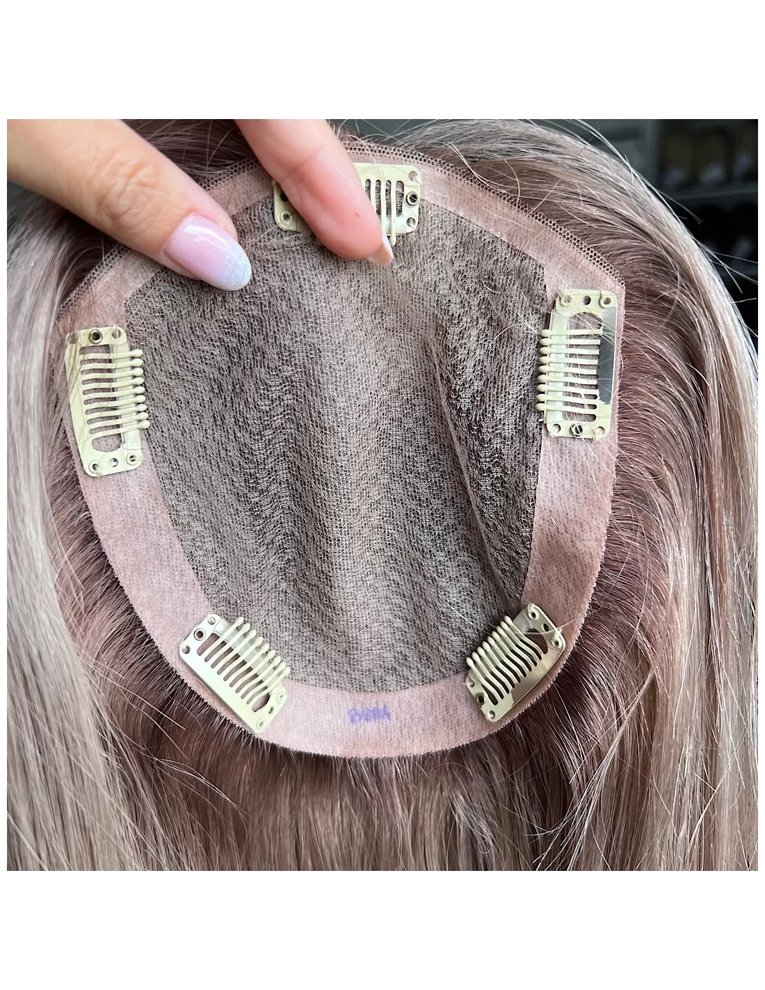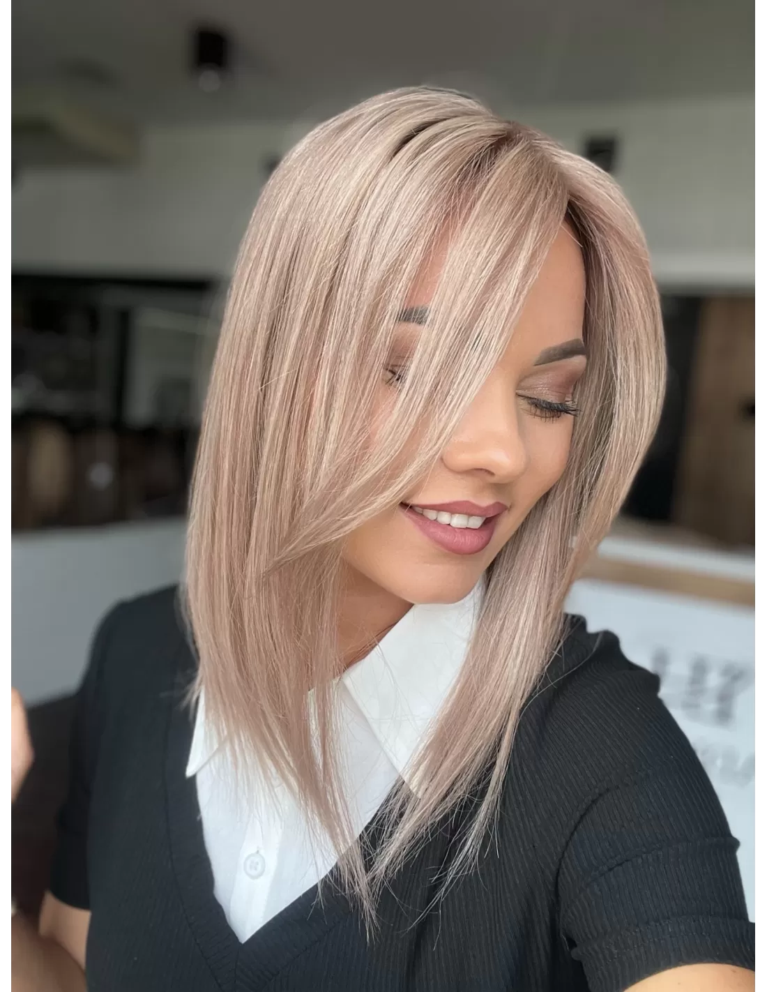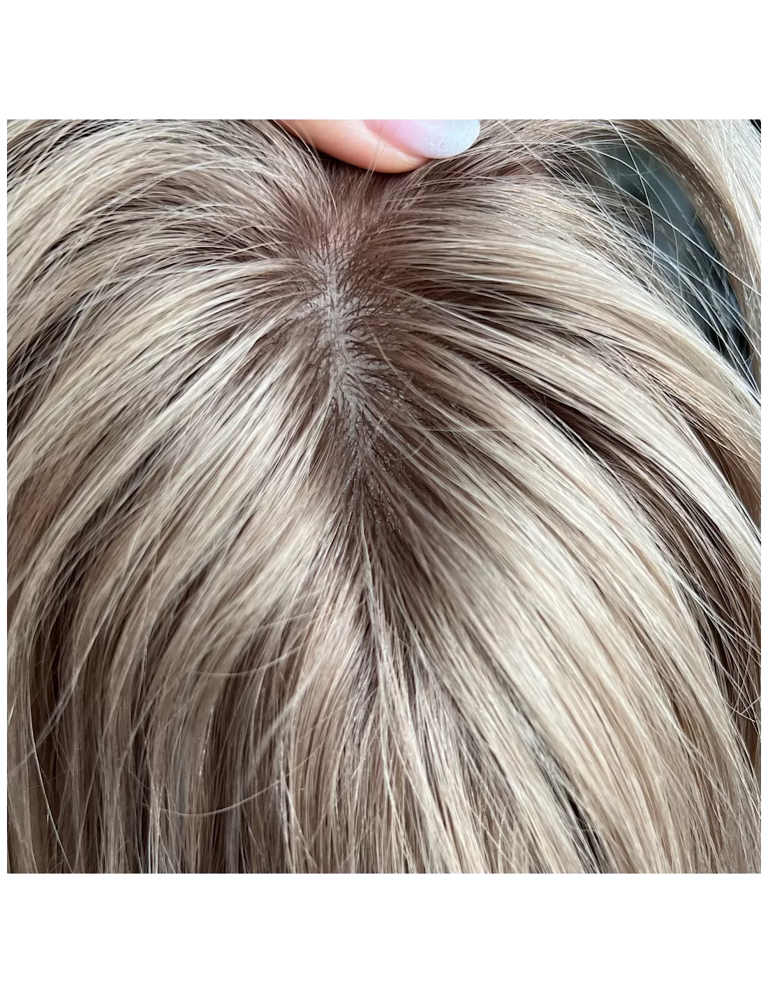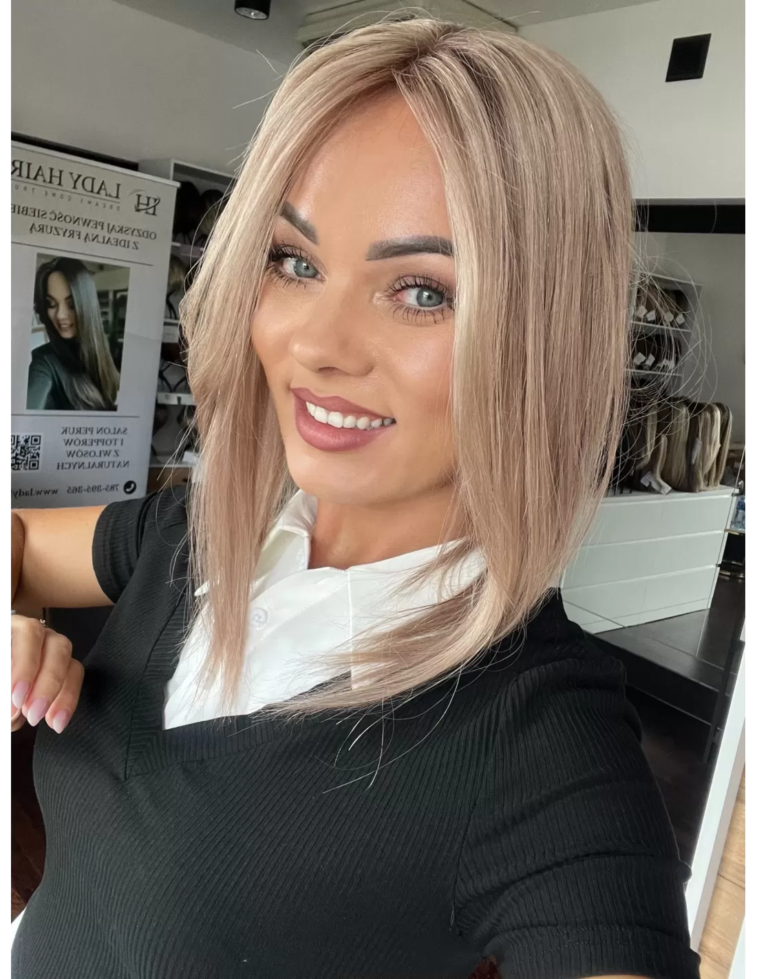 Kolor toppera Lili to harmonia bardzo jasnego perłowego blondu z nutką różowej poświaty, co nadaje mu niezwykły blask i elegancje.