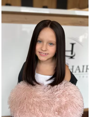 Największym atutem tej peruki jest kolor – ciemny, naturalny brąz, który wygląda bardzo subtelnie i naturalnie u dziecka. To odcień pełen ciepła i harmonii, pięknie podkreślający dziecięcą urodę i dodający fryzurze delikatnego uroku.