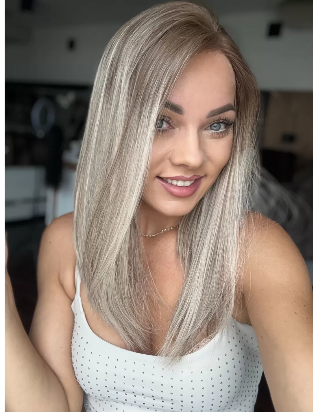 Peruka Tori emanuje subtelnością i elegancją. Jej chłodny odcień blondu z bardzo delikatnymi ciemniejszymi pasemkami i kontrastowym odrostem w kolorze ciemnego chłodnego blondu tworzą harmonijną grę kolorów. To niezwykłe dzieło sztuki, które podkreśla Twoją urodę i wyraża Twój unikalny styl.