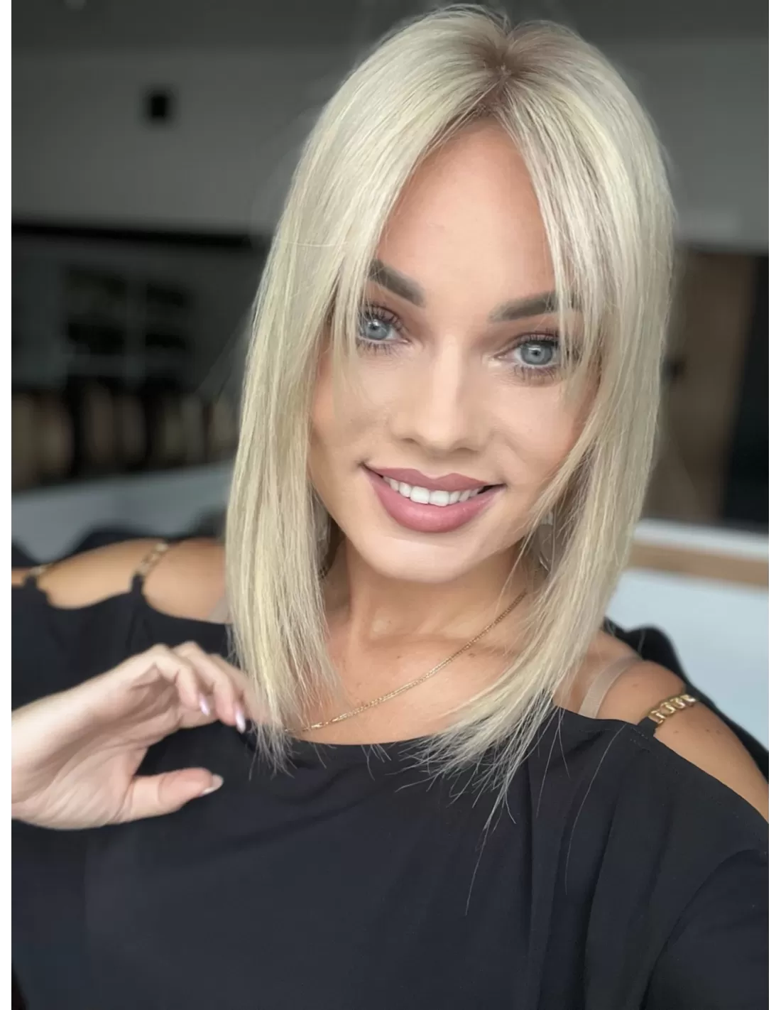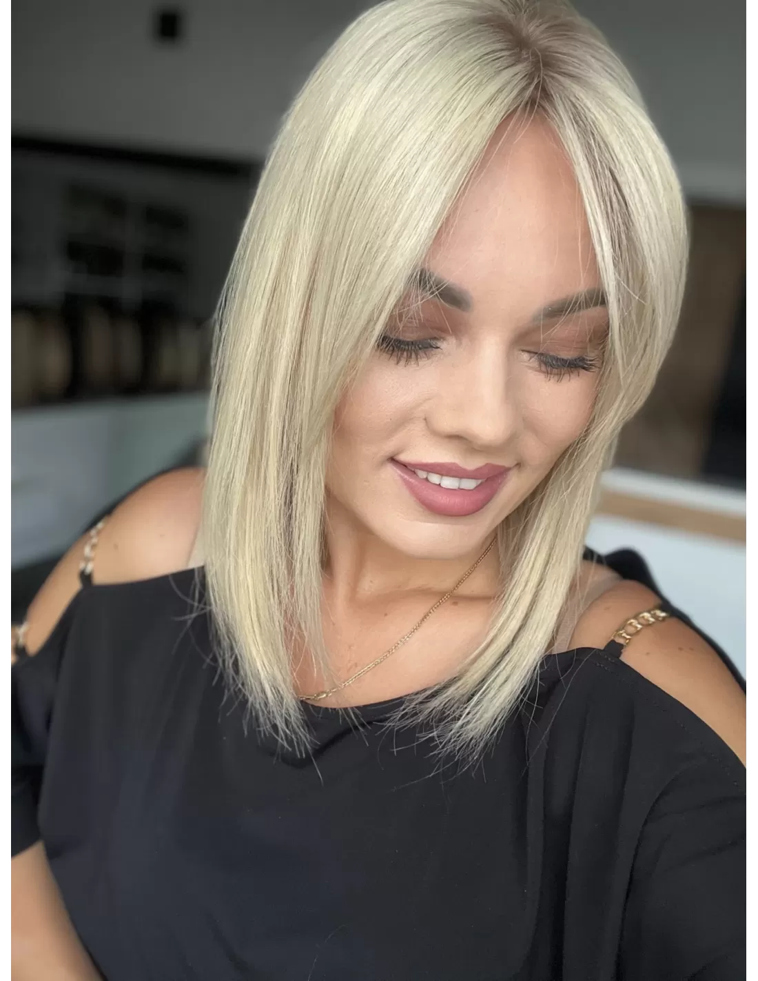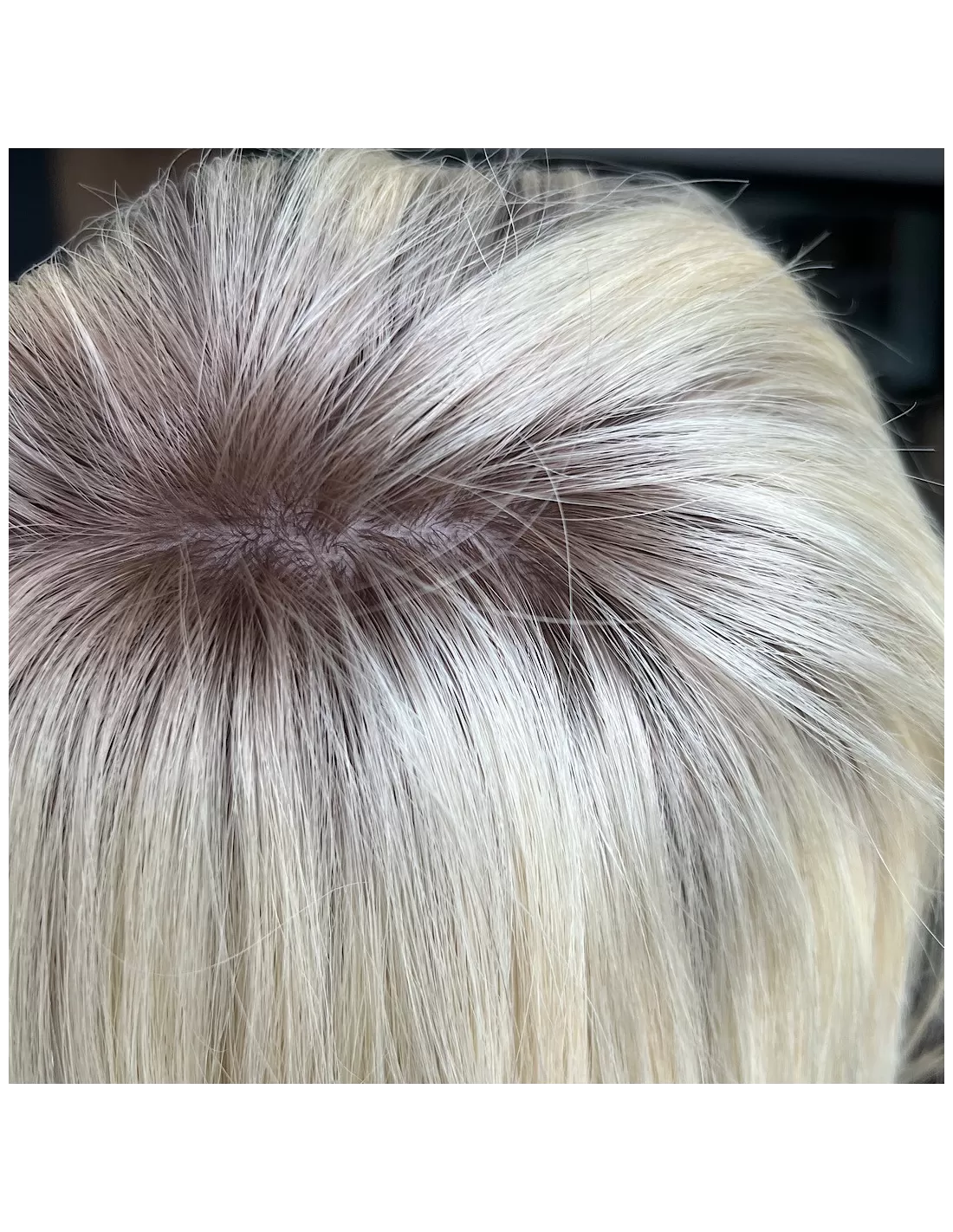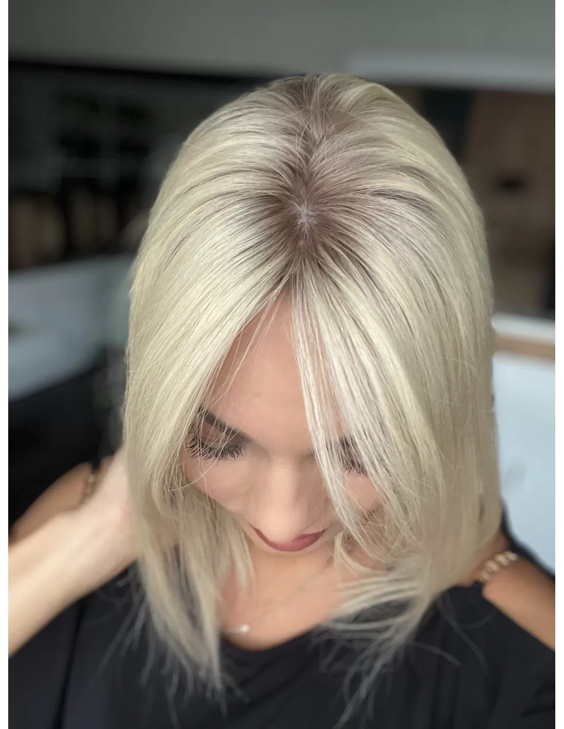 Platynowy blond z subtelnym odrostem w kolorze średniego ciepłego blondu.