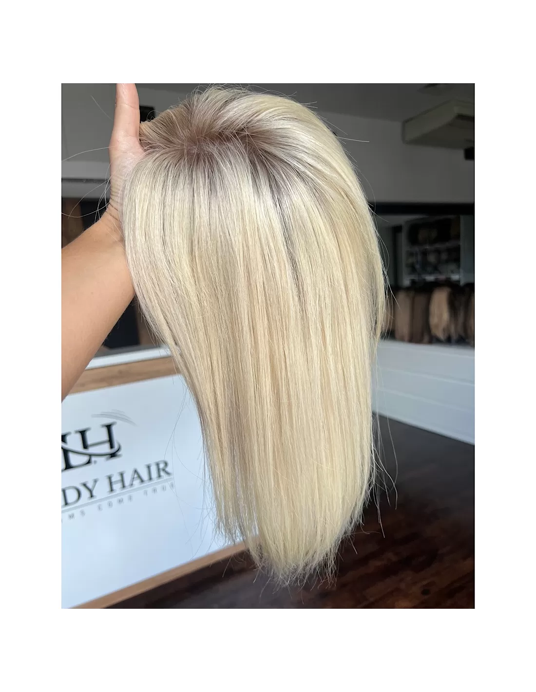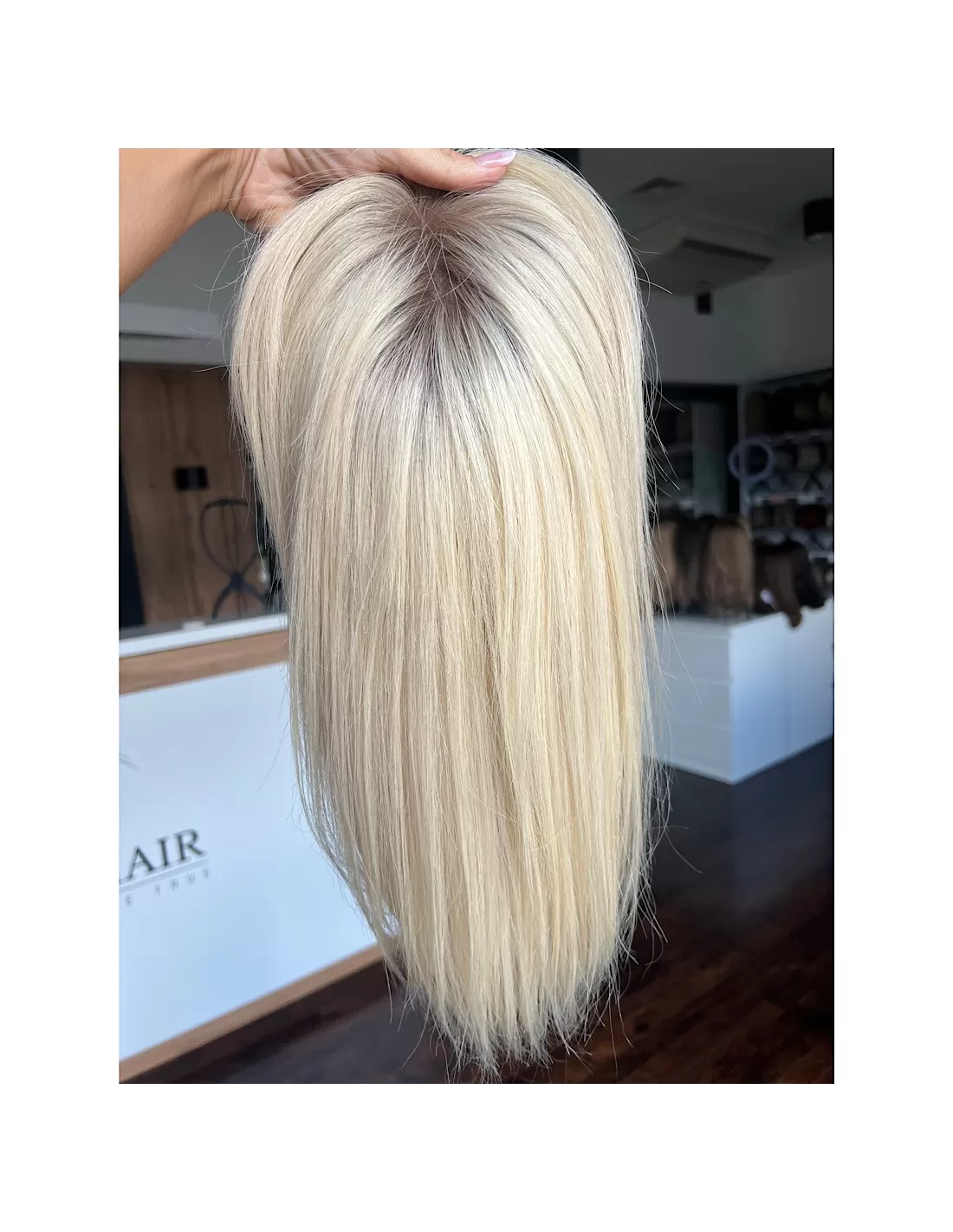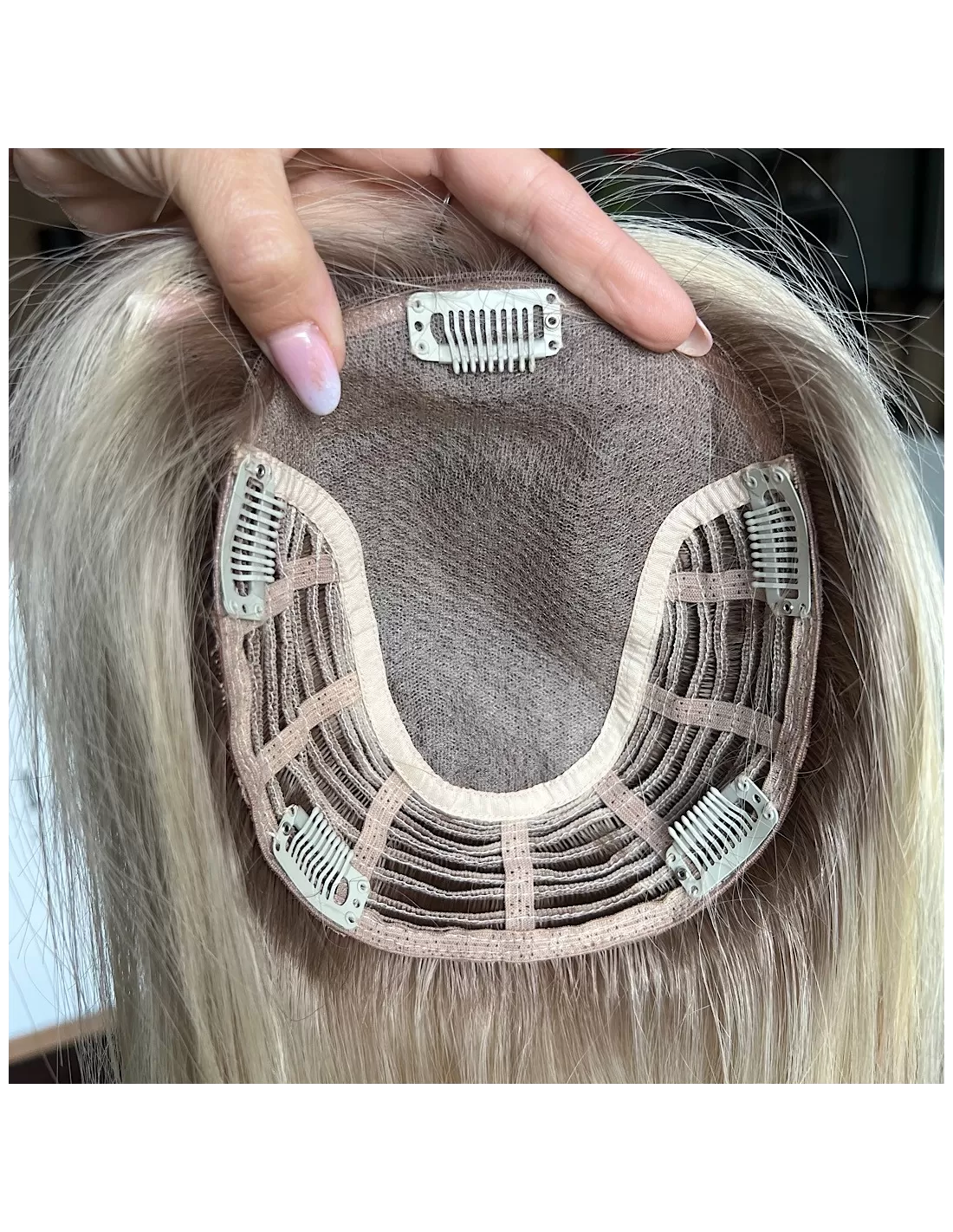 Topper posiada bazę o wymiarach 15x17 cm, wykonaną z oddychających materiałów z centralną wkładką z mikroskóry – imitacji naturalnej skóry głowy, która pozwala na dowolne modelowanie przedziałka i gwarantuje maksymalnie realistyczny efekt. Elastyczny tył bazy sprawia, że topper doskonale dopasowuje się do kształtu głowy, zapewniając komfort noszenia przez cały dzień.