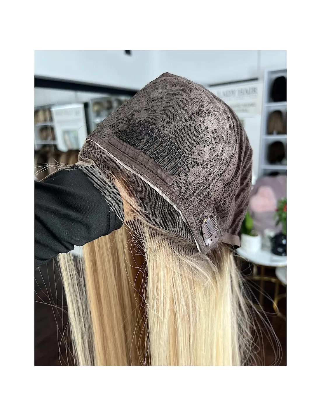 Peruka została wykonana na czepku z mikroskóry oraz z wykończeniem typu lace front. Mikroskóra doskonale imituje naturalną skórę głowy – włosy wyglądają, jakby wyrastały bezpośrednio z niej, co zapewnia maksymalny realizm i komfort. Z kolei lace front tworzy miękkie, niemal niewidoczne przejście pomiędzy linią czoła a włosami, co pozwala na naturalne odsłanianie czoła i stylizację włosów do tyłu.