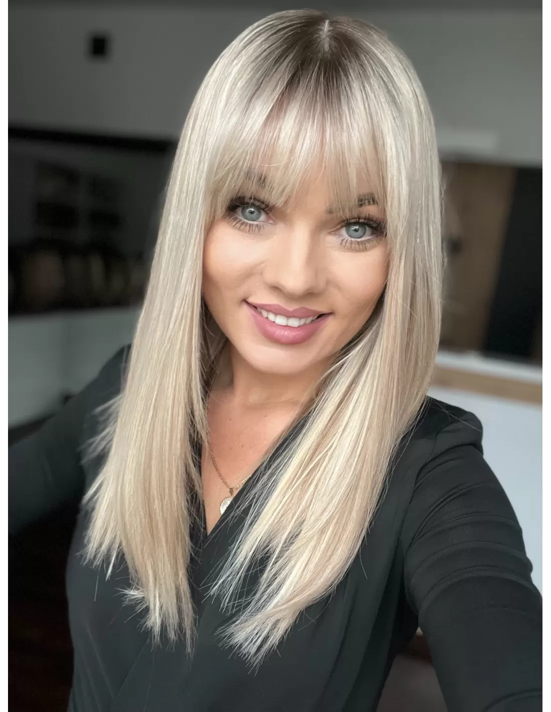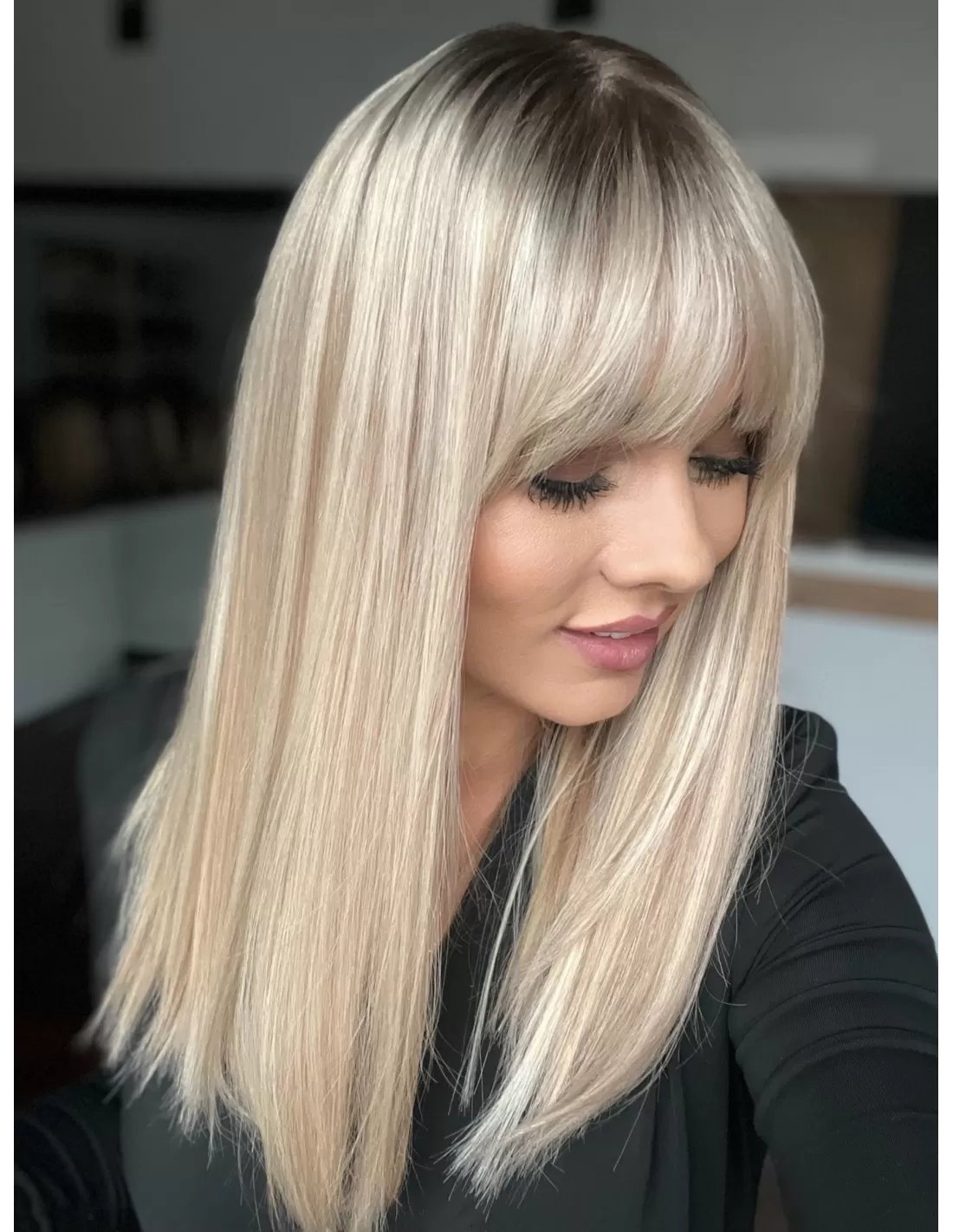 Włosy mają chłodny odcień blondu z subtelnym balejażem oraz delikatnym odrostem w kolorze chłodnego, średniego blondu, co dodaje fryzurze głębi i realistycznego wyglądu.