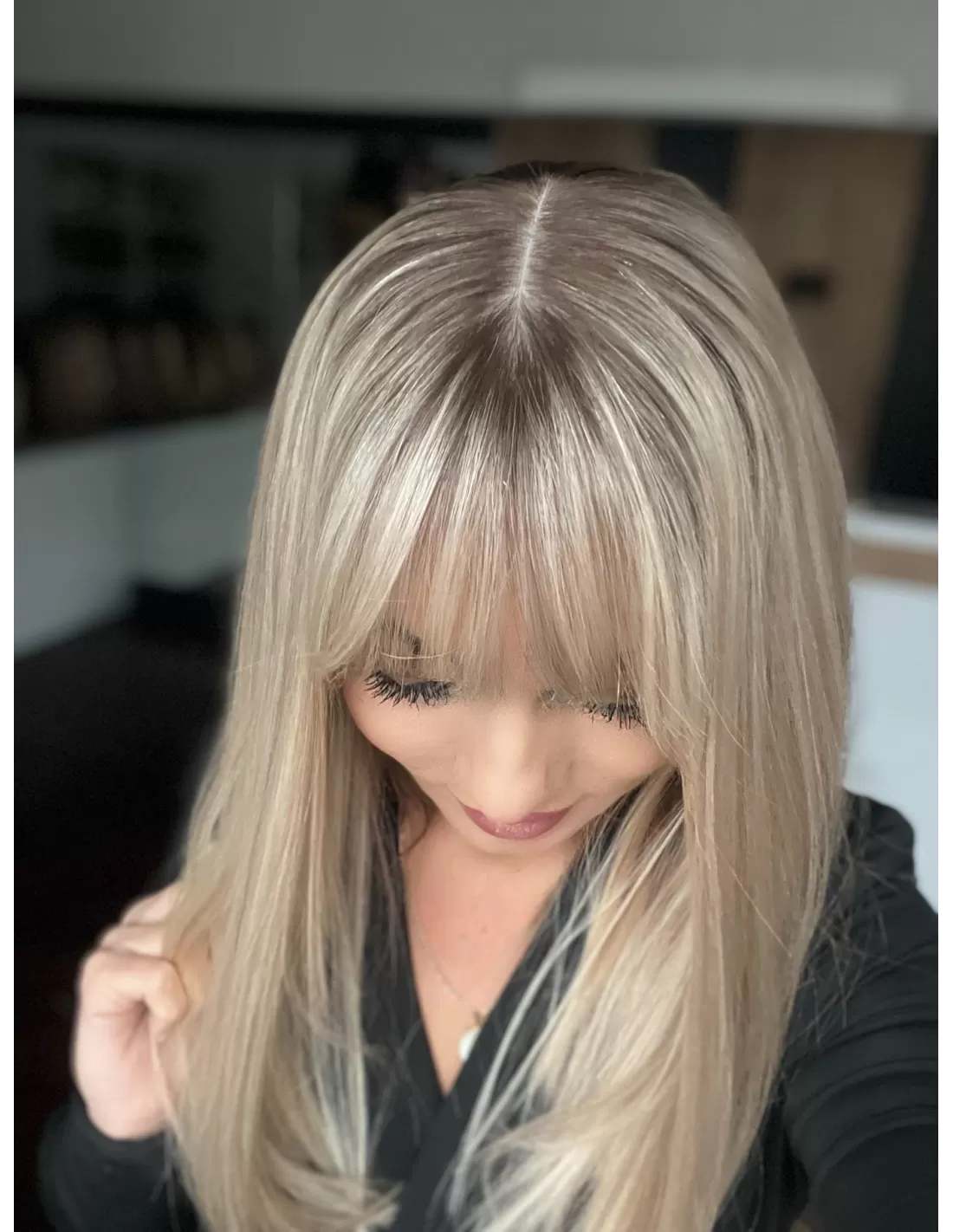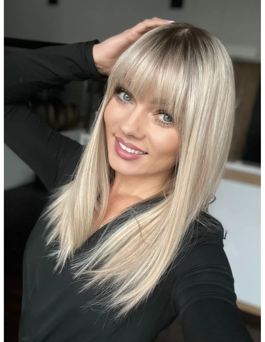 Włosy mają chłodny odcień blondu z subtelnym balejażem oraz delikatnym odrostem w kolorze chłodnego, średniego blondu, co dodaje fryzurze głębi i realistycznego wyglądu.