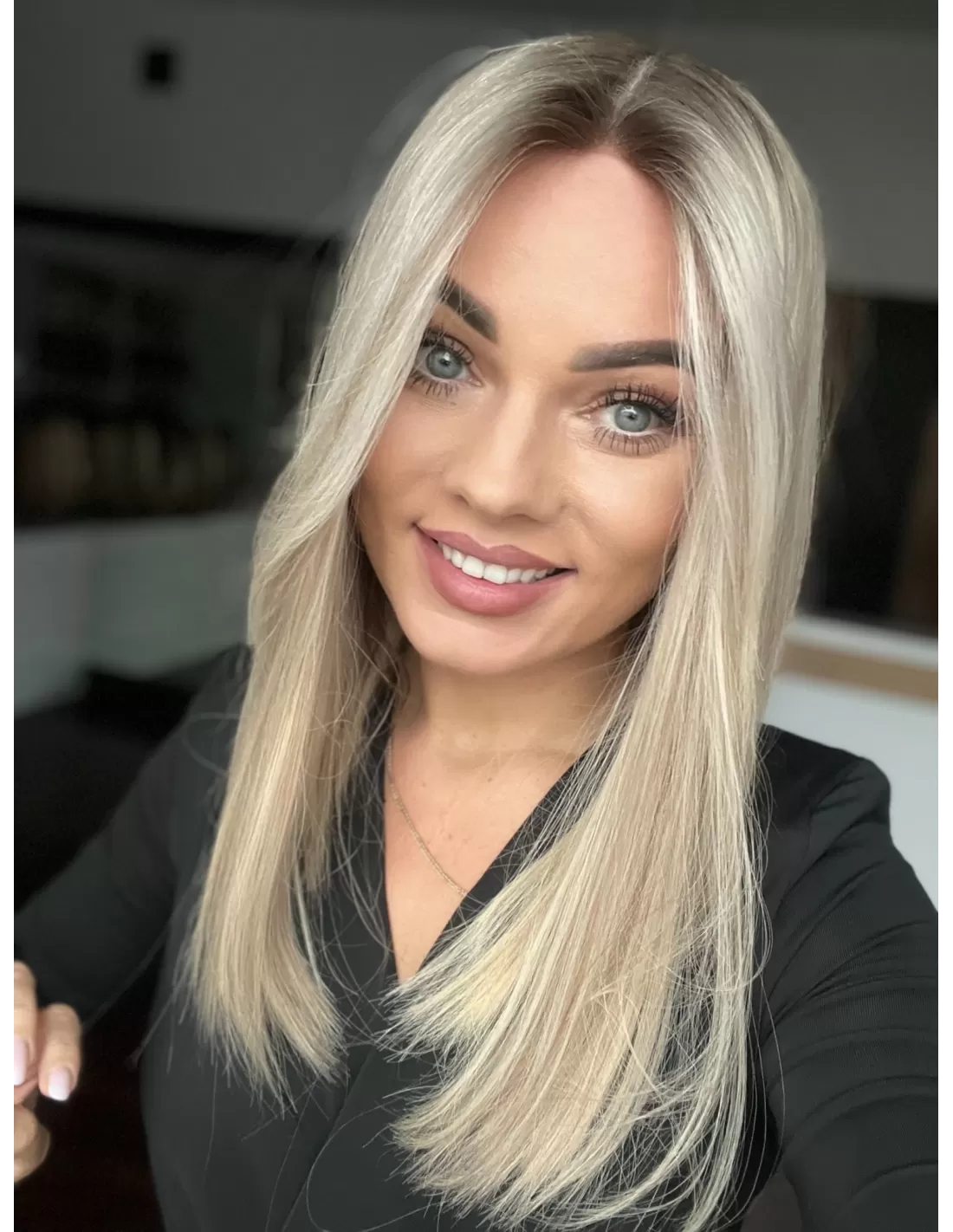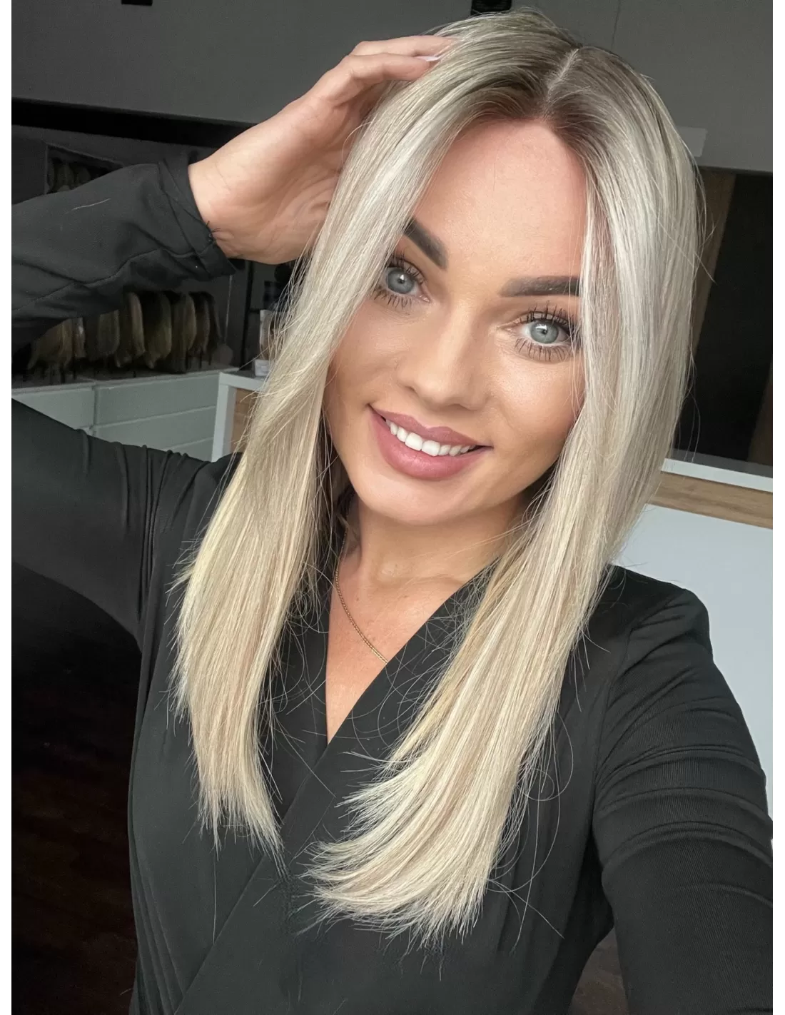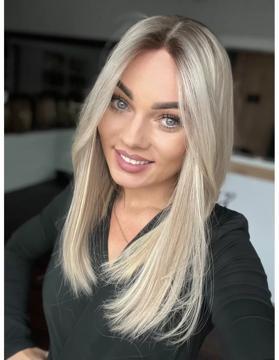 Włosy mają chłodny odcień blondu z subtelnym balejażem oraz delikatnym odrostem w kolorze chłodnego, średniego blondu, co dodaje fryzurze głębi i realistycznego wyglądu.