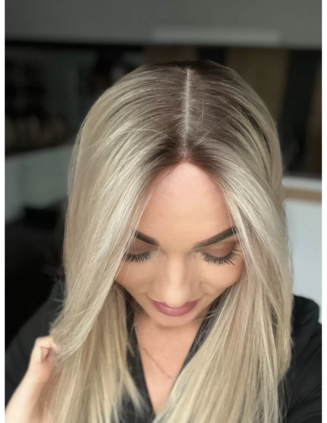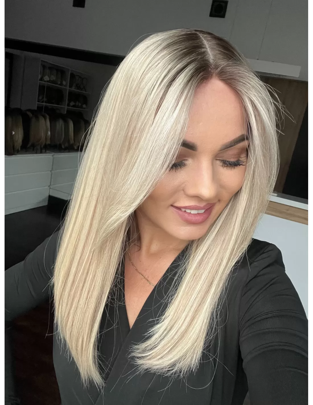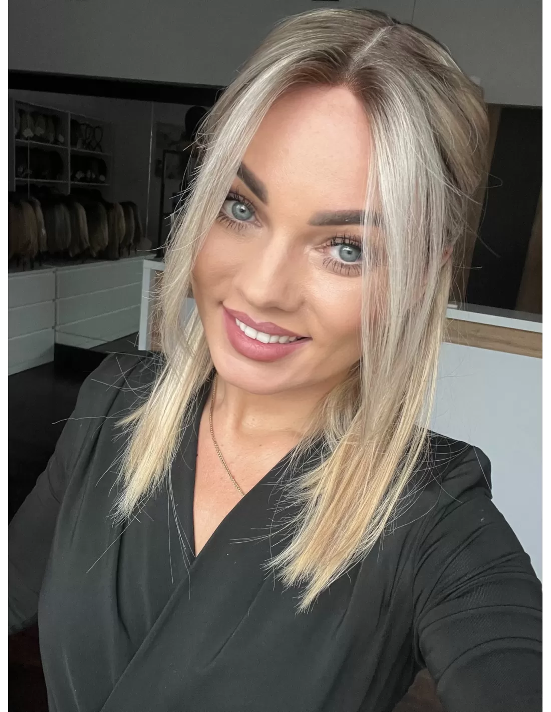 Włosy mają chłodny odcień blondu z subtelnym balejażem oraz delikatnym odrostem w kolorze chłodnego, średniego blondu, co dodaje fryzurze głębi i realistycznego wyglądu.