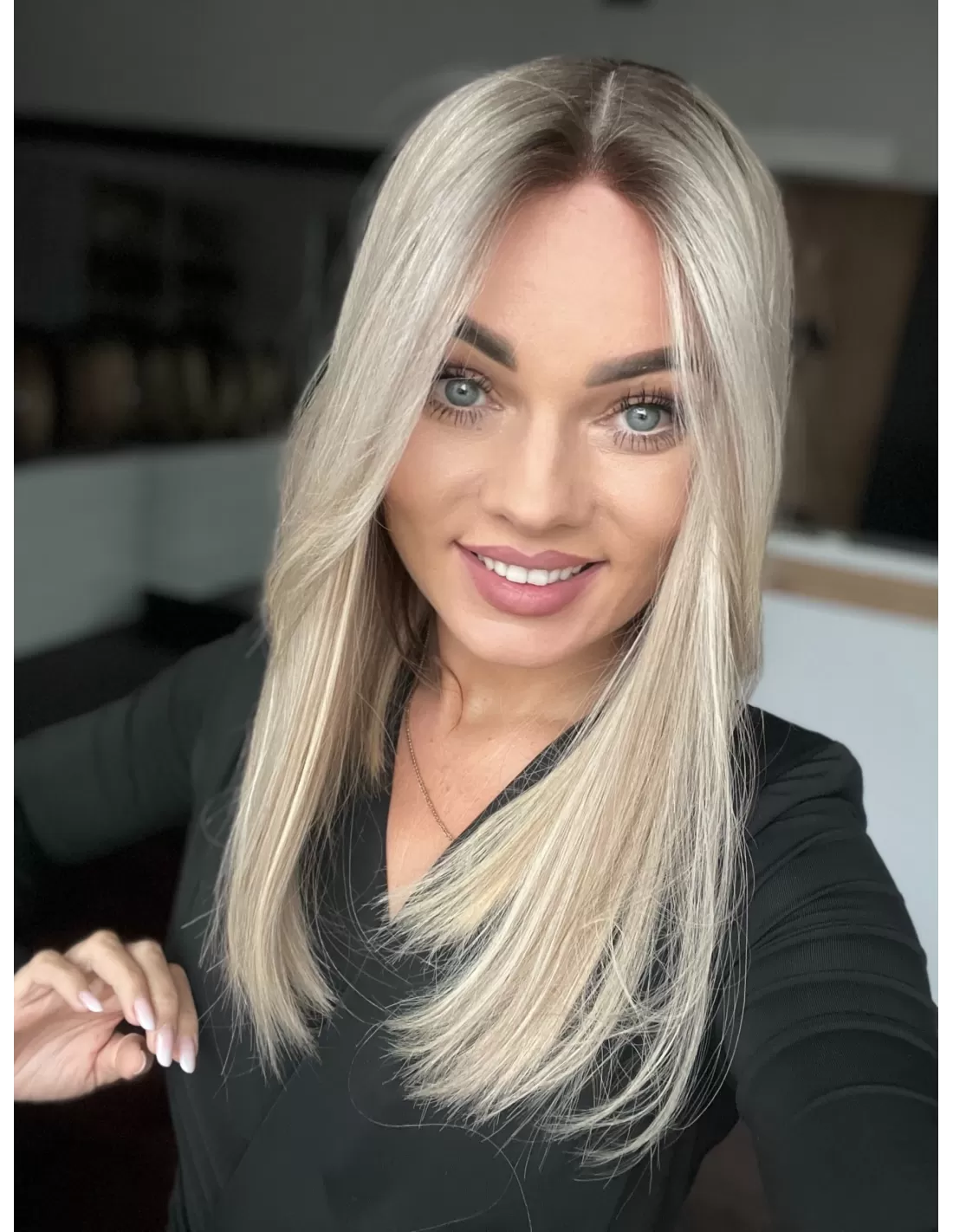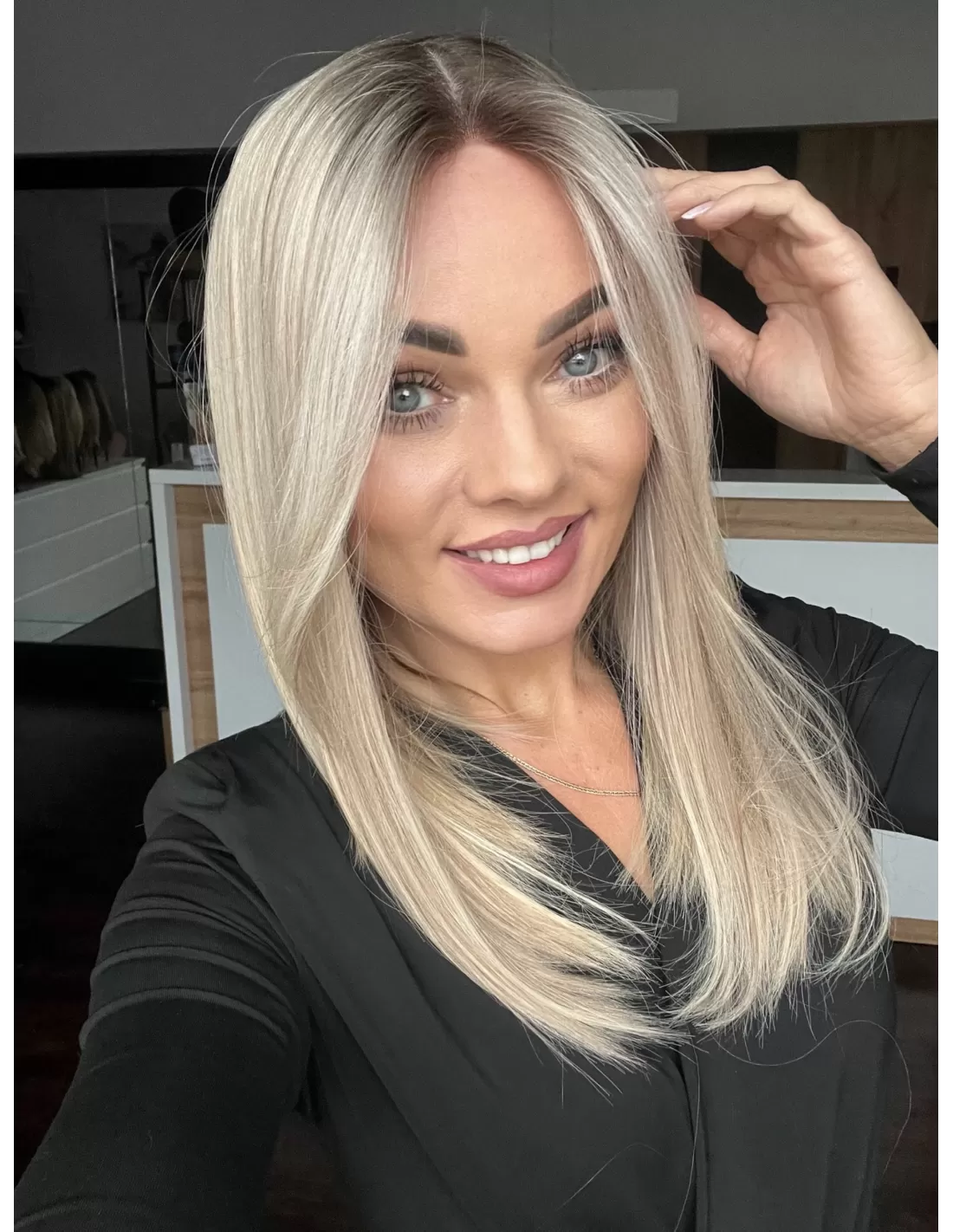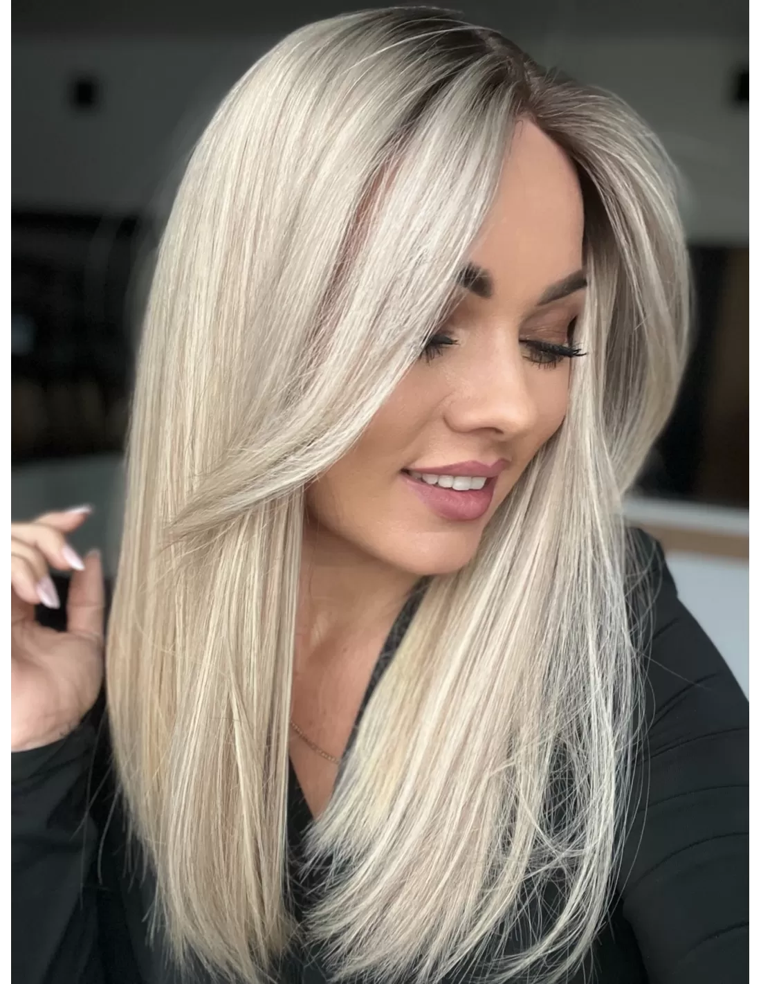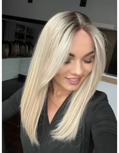 Włosy mają chłodny odcień blondu z subtelnym balejażem oraz delikatnym odrostem w kolorze chłodnego, średniego blondu, co dodaje fryzurze głębi i realistycznego wyglądu.