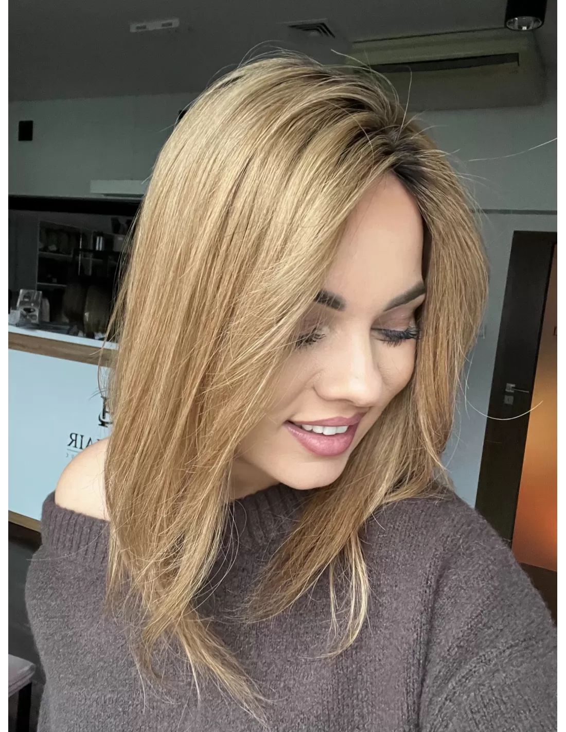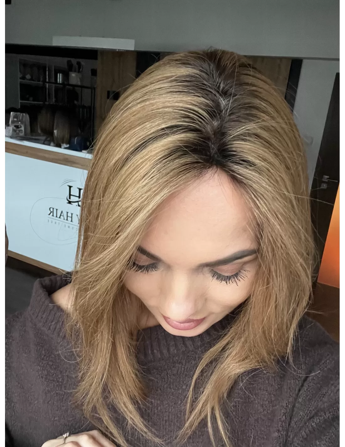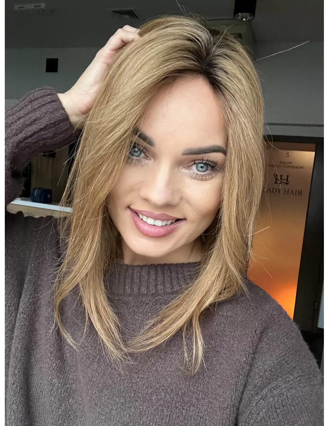 Naturalny jasny brąz –bardzo naturalny, subtelny odcień elegancki i ponadczasowy. U nasady widać nieco ciemniejszy odrost , który płynnie przechodzi w jaśniejsze partie-efekt przypomina delikatne sombre lub naturalne rozjaśnienie przez słońce. Ten kolor został stworzony z myślą o osobach, które pragną świeżego, rozświetlonego wyglądu, a jednocześnie cenią sobie naturalność i harmonię. Jasny brąz pięknie komponuje się zarówno z chłodniejszymi, jak i cieplejszymi tonacjami skóry, dodając fryzurze lekkości oraz elegancji.