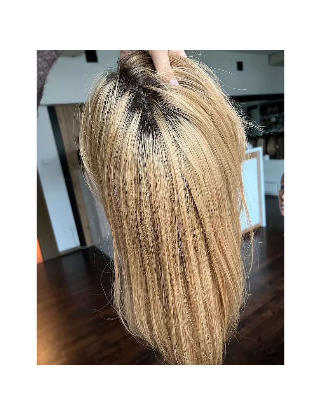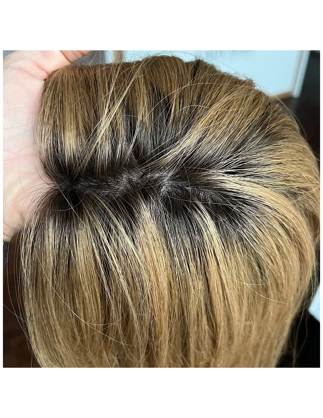 Topper posiada bazę o wymiarach 15x17 cm, wykonaną z oddychających materiałów z centralną wkładką z mikroskóry – imitacji naturalnej skóry głowy, która pozwala na dowolne modelowanie przedziałka i gwarantuje maksymalnie realistyczny efekt. Elastyczny tył bazy sprawia, że topper doskonale dopasowuje się do kształtu głowy, zapewniając komfort noszenia przez cały dzień.