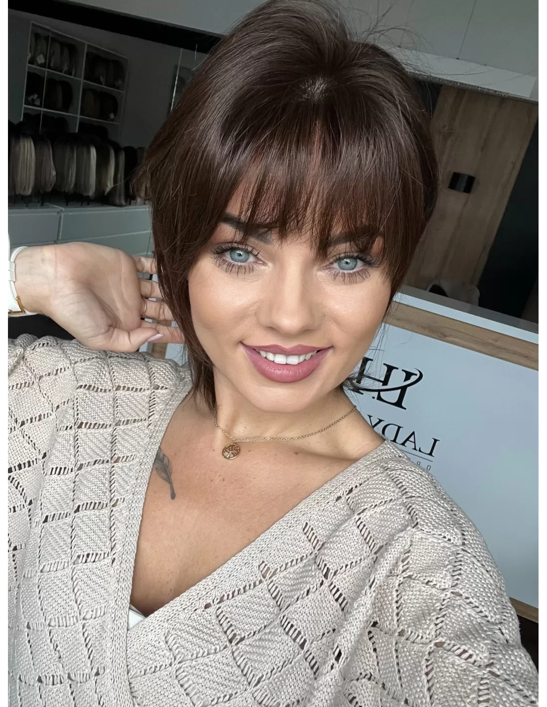 Elastyczny tył zapewnia idealne dopasowanie, a regulacje umożliwiają dostosowanie do indywidualnych preferencji. Kolor czekoladowy ciepły brąz nadaje peruce wyrafinowanego charakteru, podkreślając jej elegancję., idealna dla pań ceniących wygodę i krótkie fryzury. Peruka Ila to doskonały wybór dla tych Pań , które pragną zachować styl i elegancję w prosty sposób.