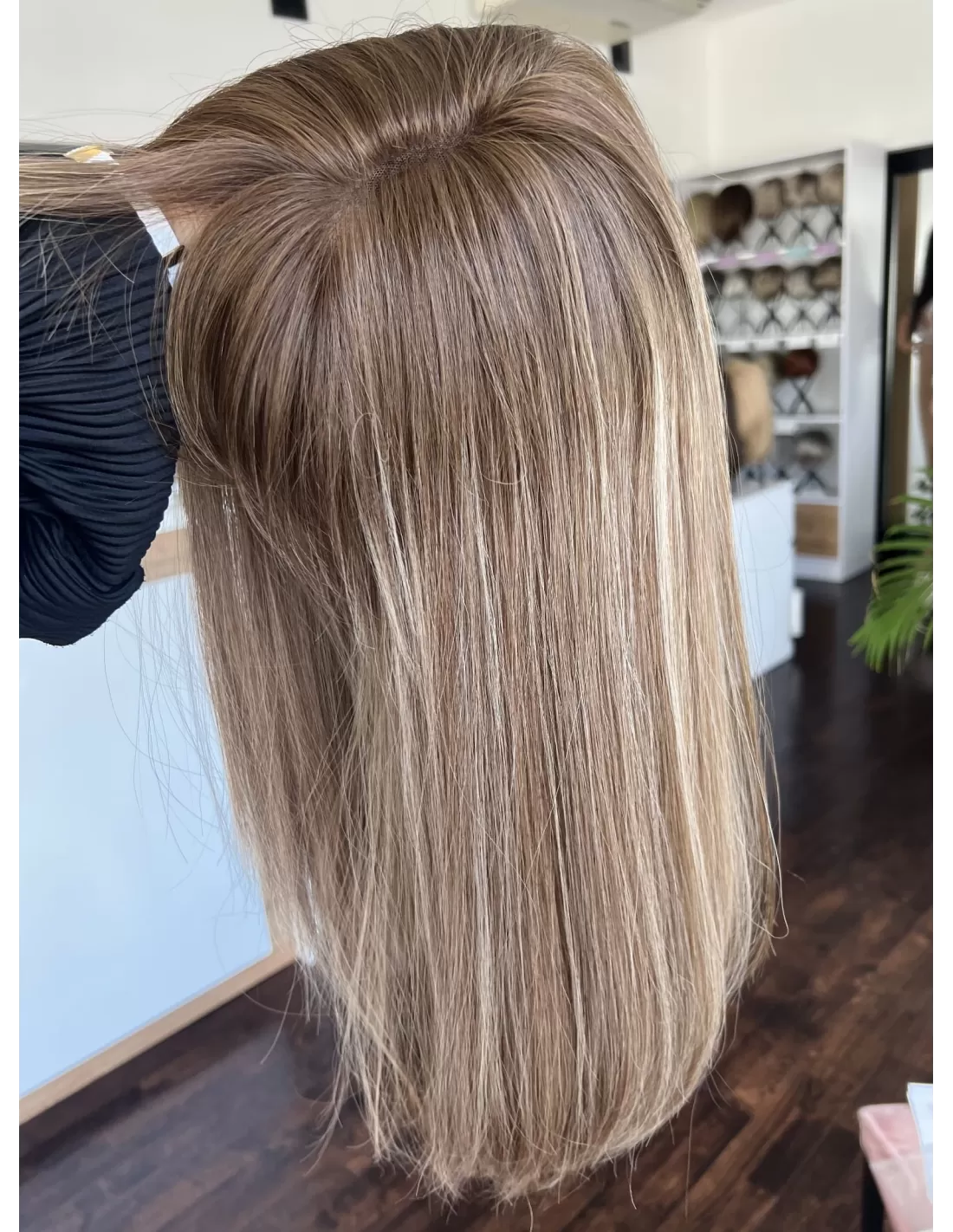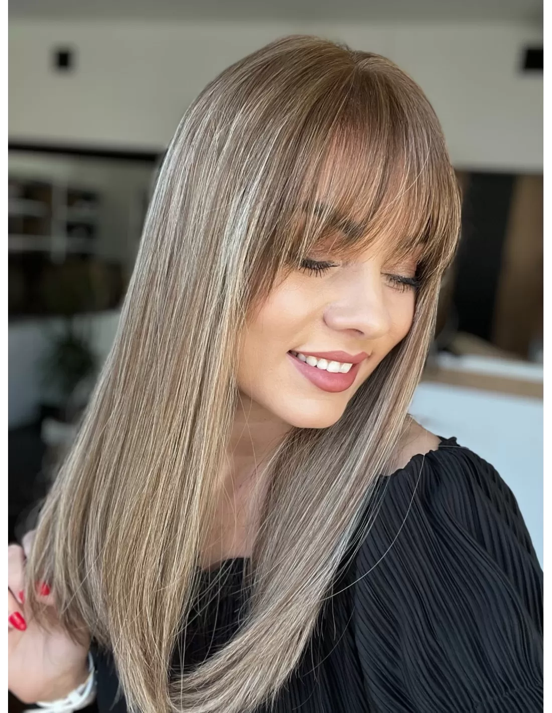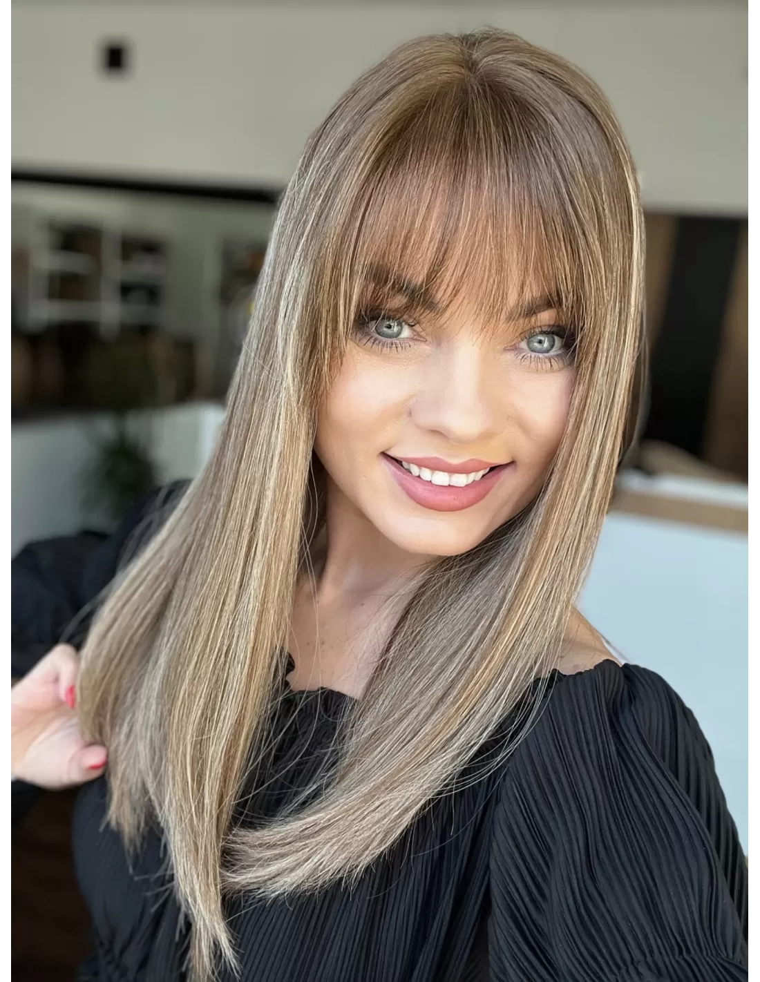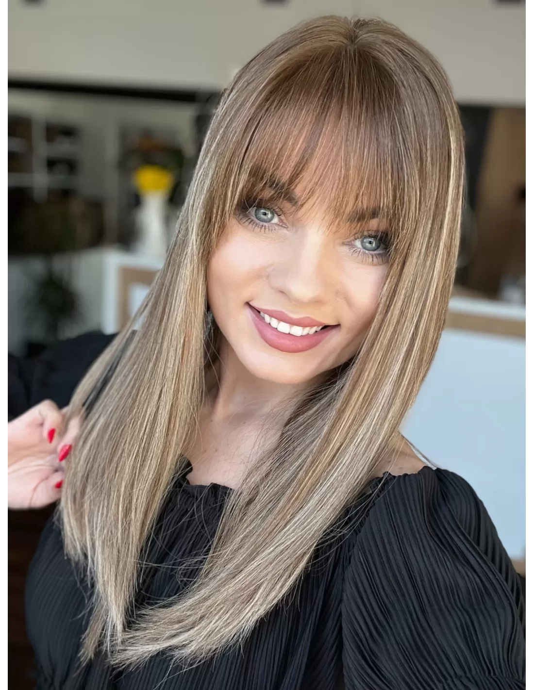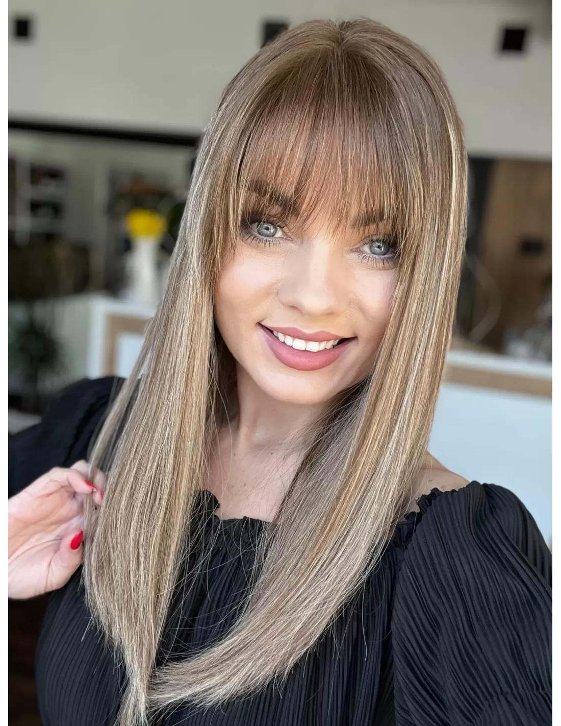 Pruka Kati jest prawdziwym dziełem sztuki. Jej odcień balayage blond to połączenie delikatności i elegancji, z subtelnymi brązowymi pasemkami dodającymi głębi. Kontrast z ciemnym odrostem nadaje jej niepowtarzalnego charakteru. To nie tylko peruka, to wyraz wyjątkowej urody i stylu, który zachwyca i przyciąga uwagę