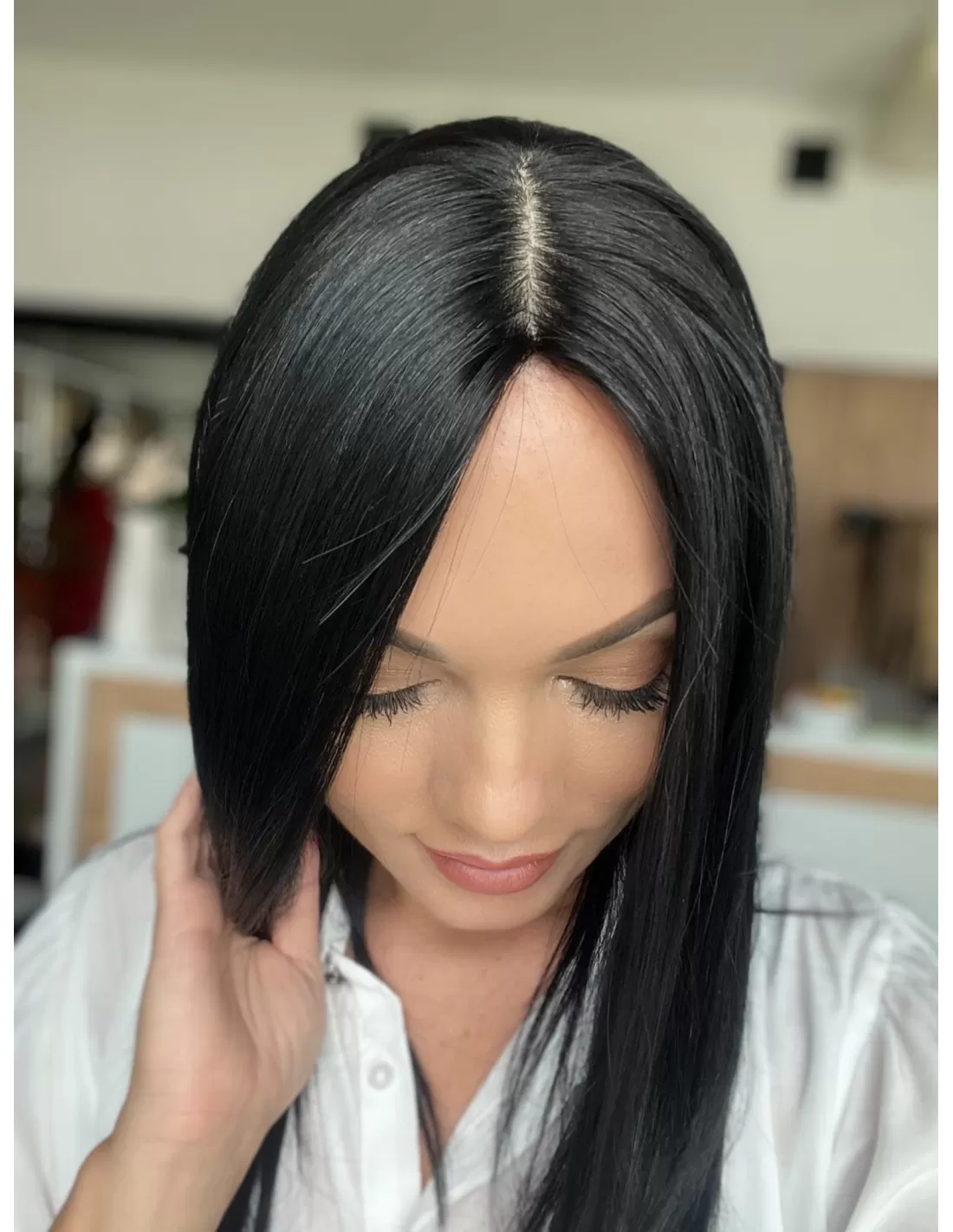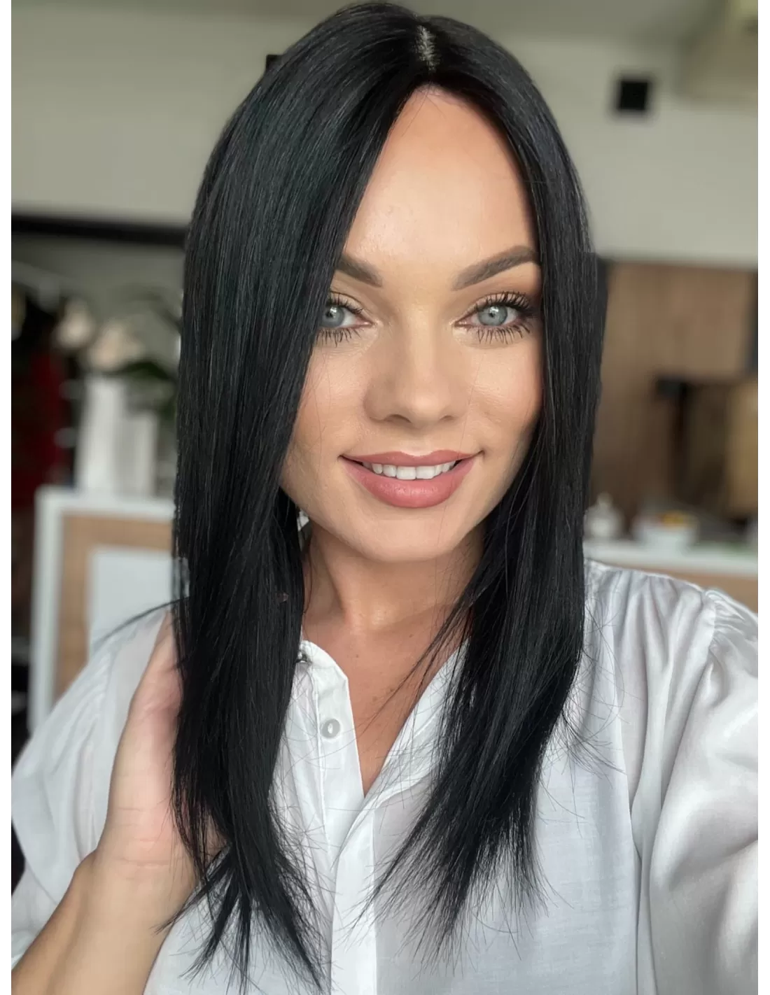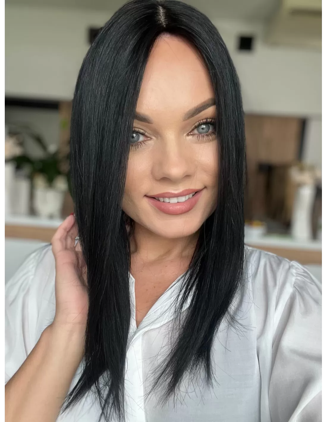 Topper FREYA wykonany jest z włosów naturalnych o najwyższej jakości. To idealne rozwiązanie dla osób pragnących uzyskać pełny, gęsty i naturalny wygląd swoich włosów. Jego kolor to bardzo ciemny brąz (#1B black), co zapewnia elegancki i głęboki wygląd.