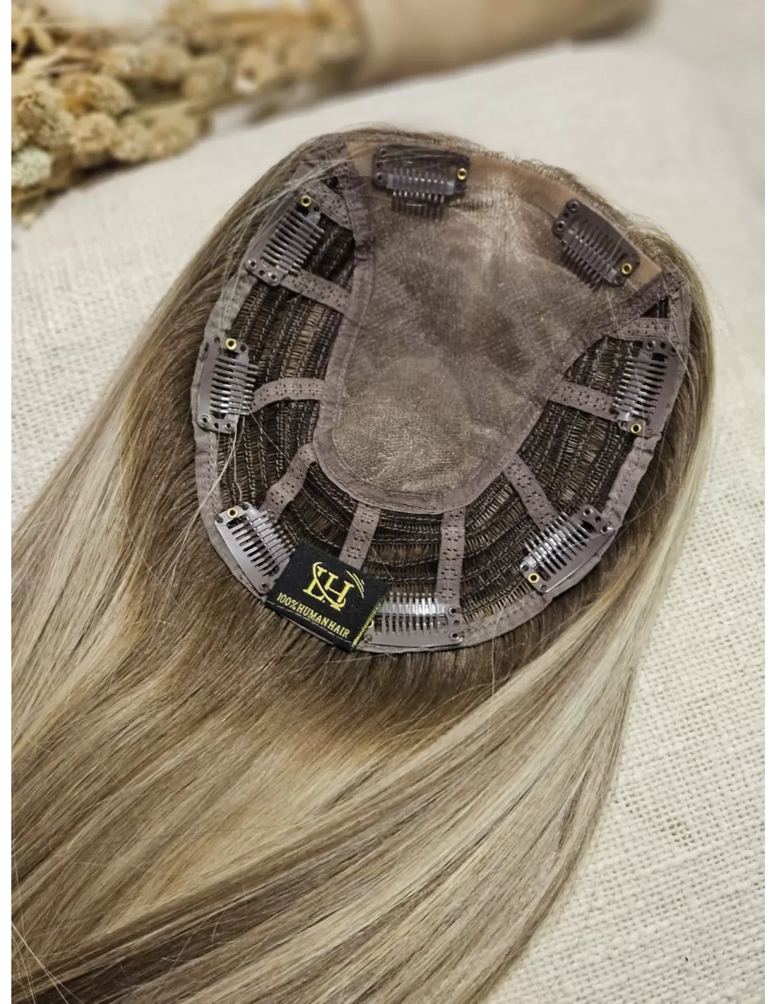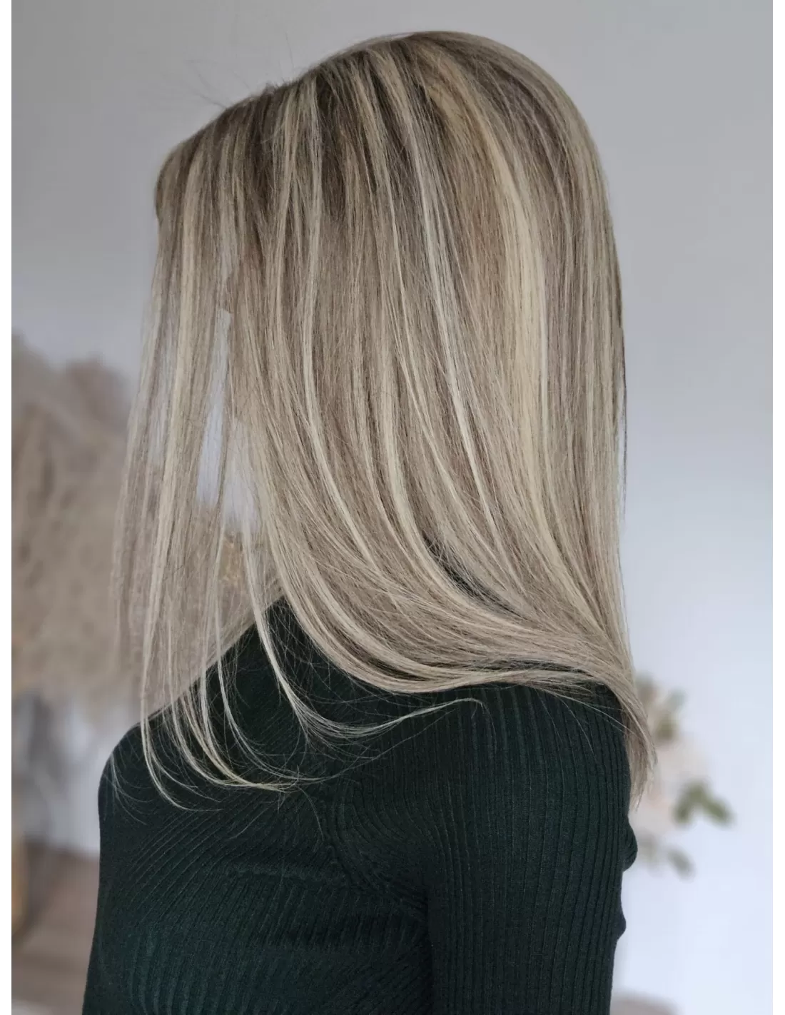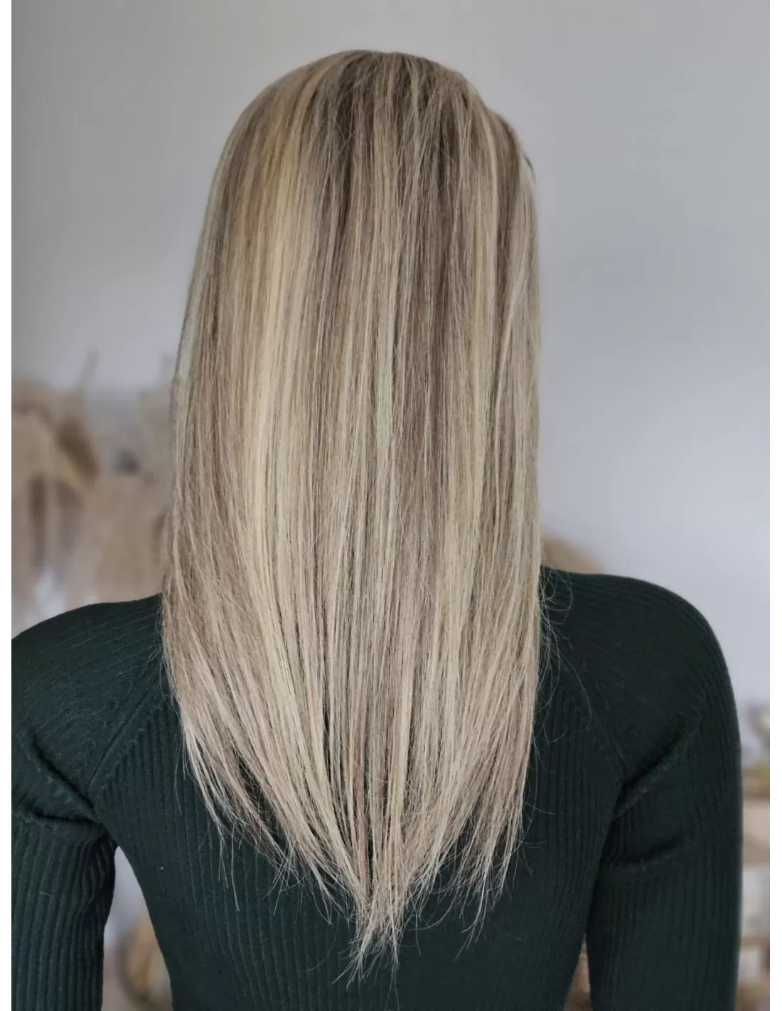 Topper Selene 8C to arcydzieło najwyższej jakości, stworzone z naturalnych włosów, które wprowadzą do Twojej stylizacji nowy wymiar elegancji. Kolorystyka to baleyage blond w chłodnym odcieniu, co nadaje włosom delikatny i naturalny blask. Odrost w kolorze ciemnego chłodnego blondu dodaje fryzurze kontrastu i charakteru.